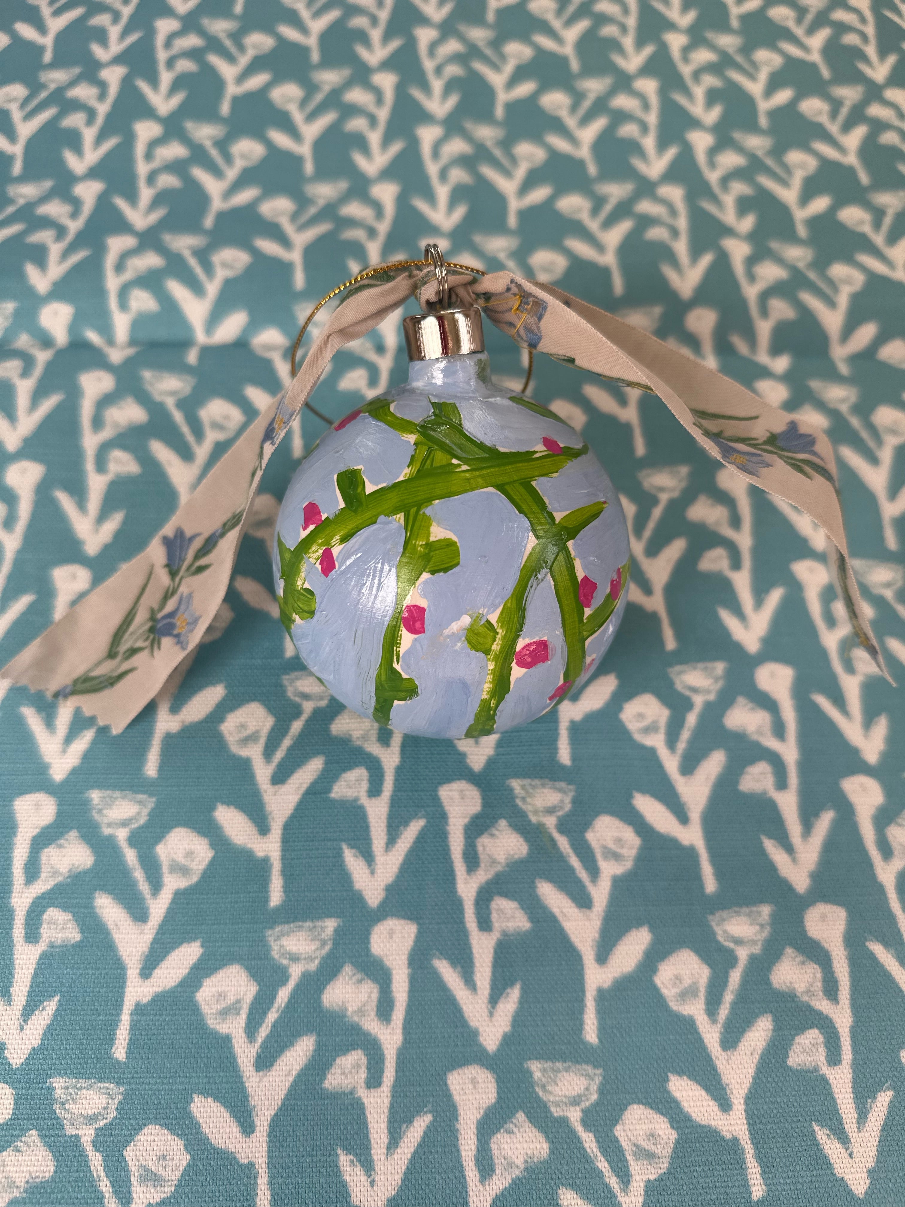 Original, hand-painted, one-of-a-kind ceramic ornament painted by Erin in her signature abstract style with a painterly look and feel. Tied with a coordinating vintage ribbon. Varnished and sealed with a satin finish.