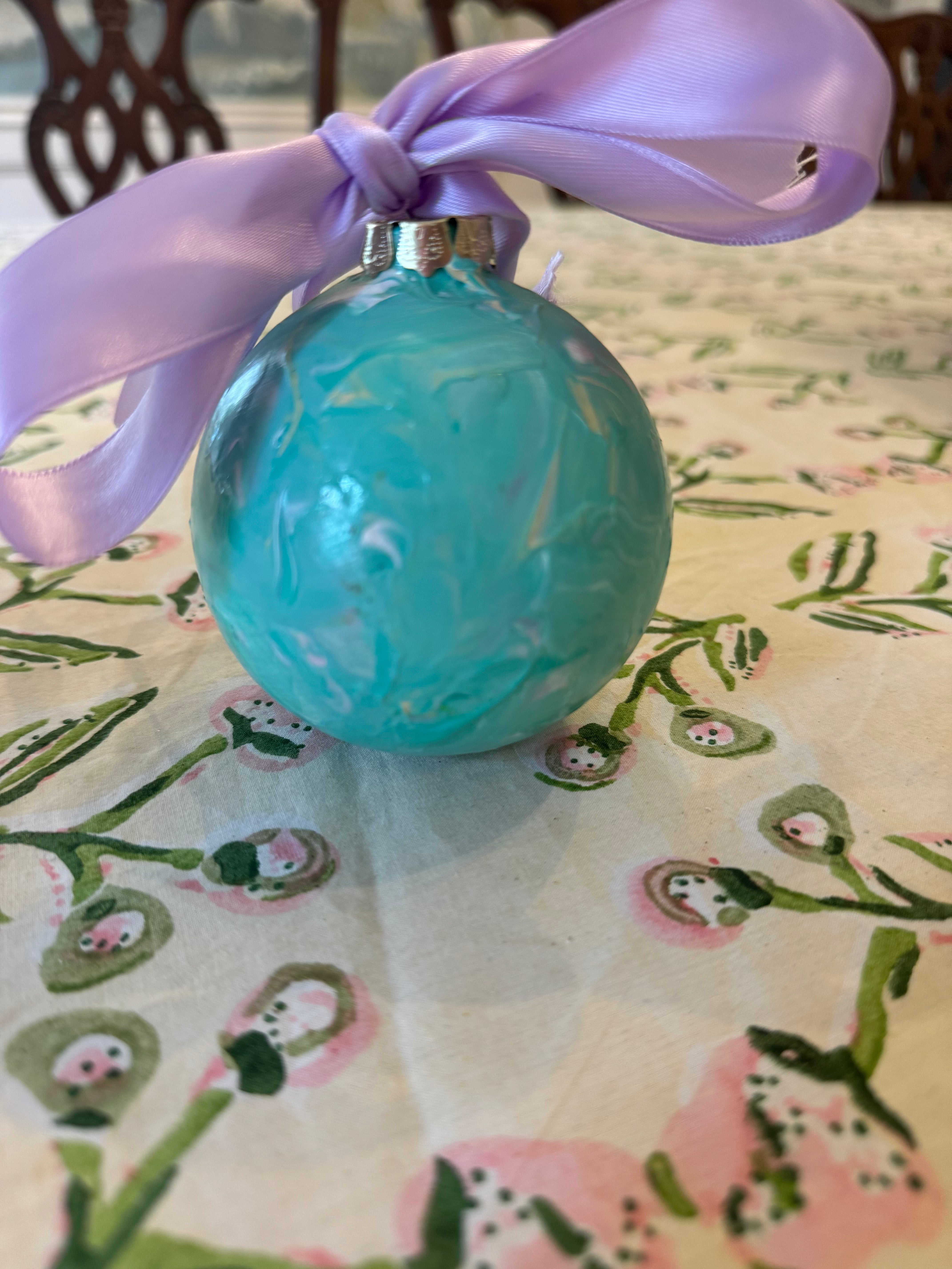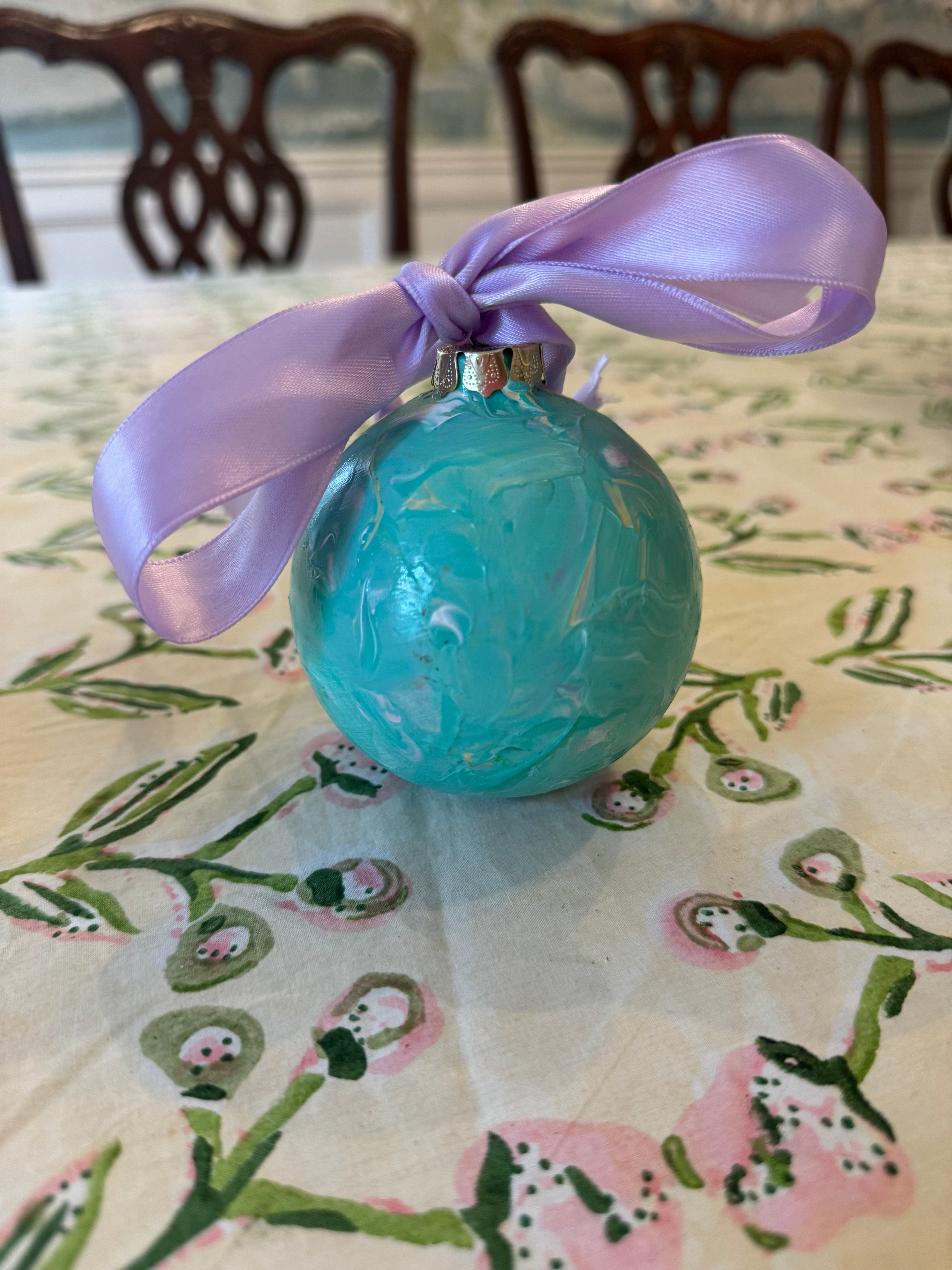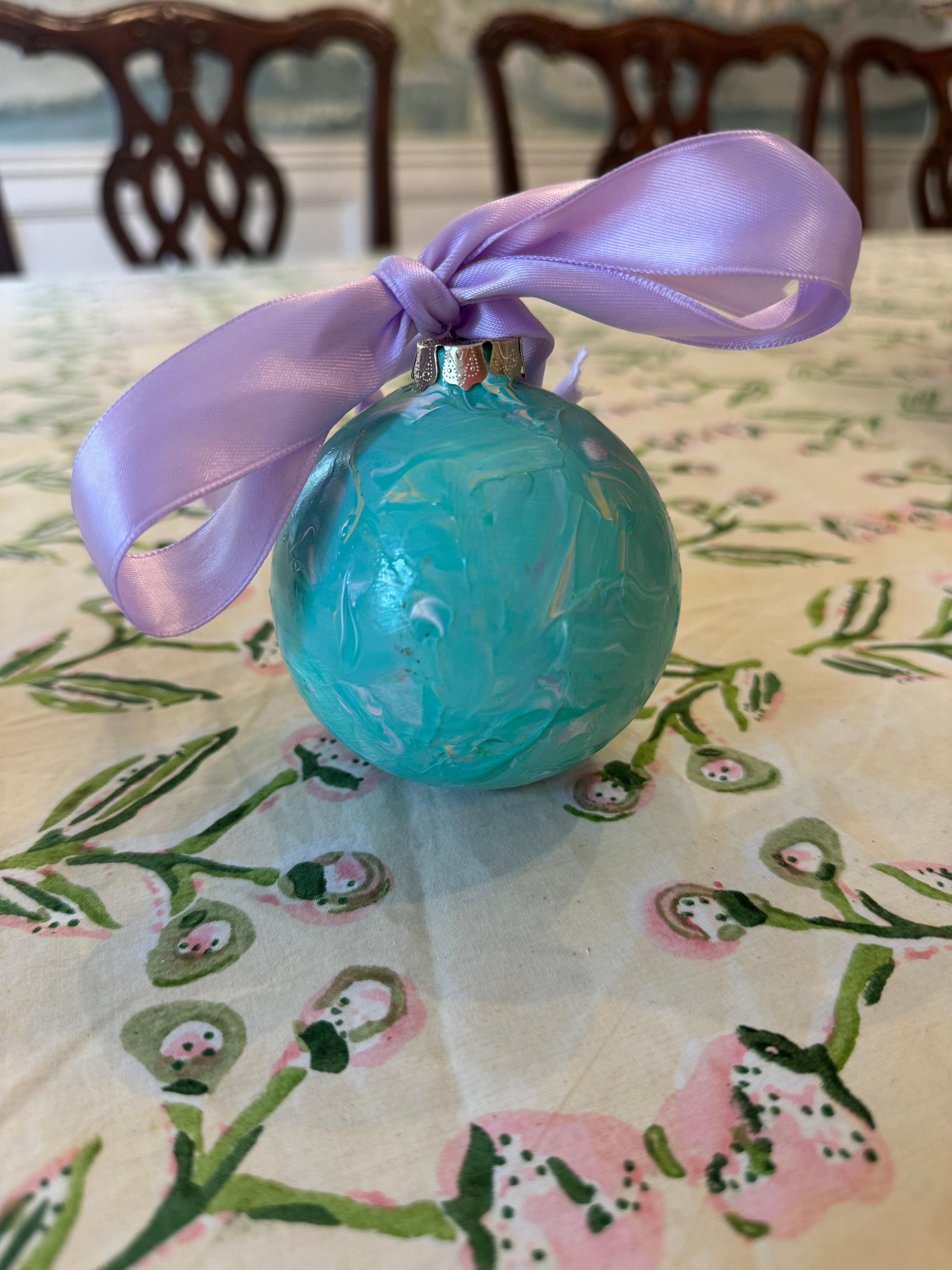 Original, hand-painted, one-of-a-kind ceramic ornament painted by Erin in her signature abstract style with a painterly look and feel. Tied with a coordinating ribbon. Varnished and sealed with a satin finish.