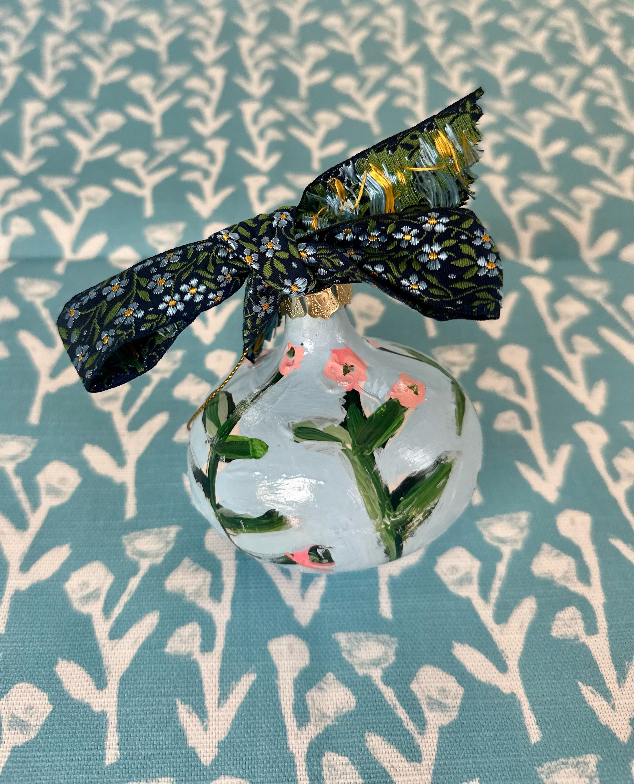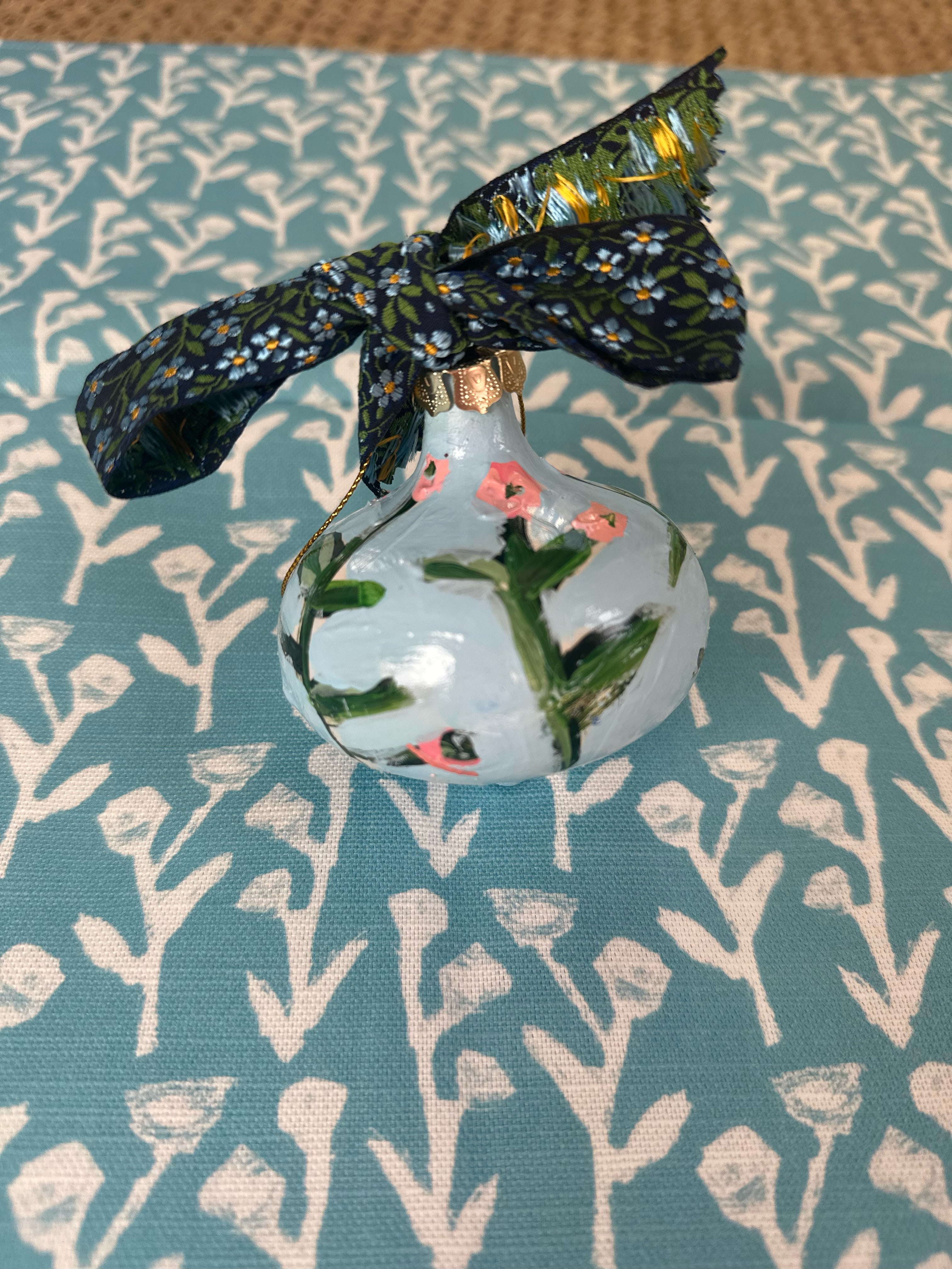 Original, hand-painted, one-of-a-kind ceramic ornament painted by Erin in her signature abstract style with a painterly look and feel. Tied with a coordinating vintage ribbon. Varnished and sealed with a satin finish.