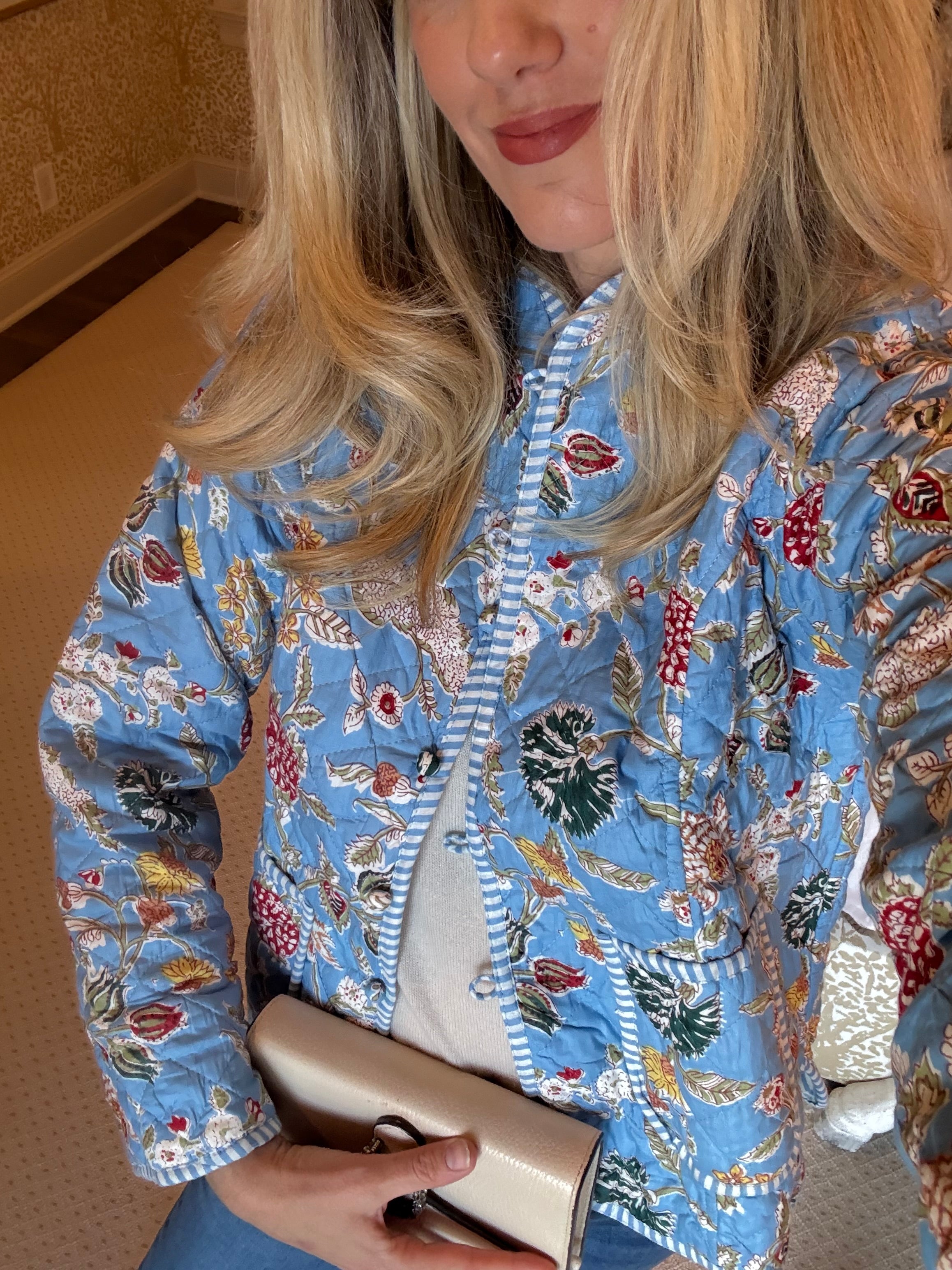 Meet The Charlotte — the spirited sister to our signature quilted jacket. This jacket features a blue background.