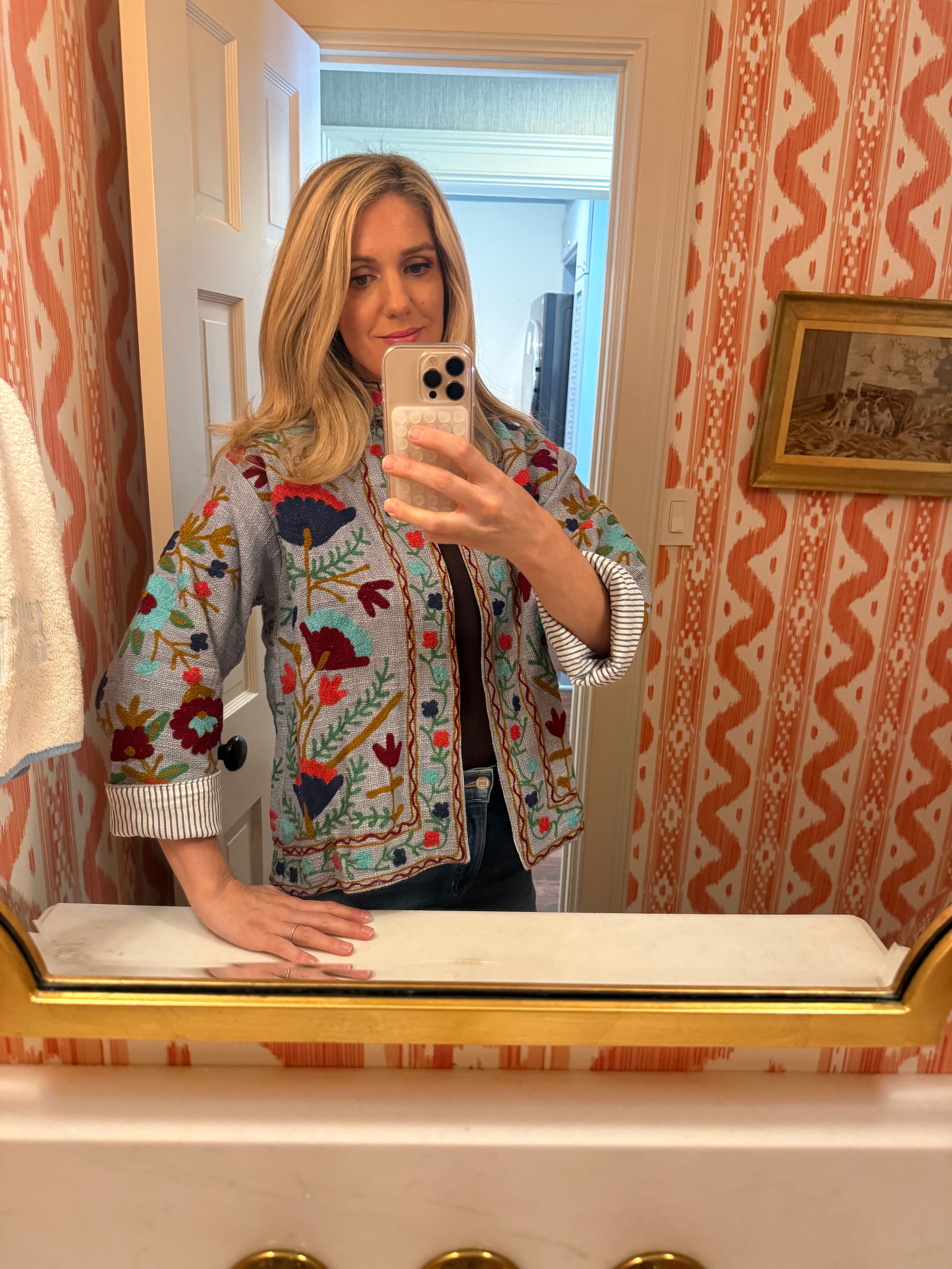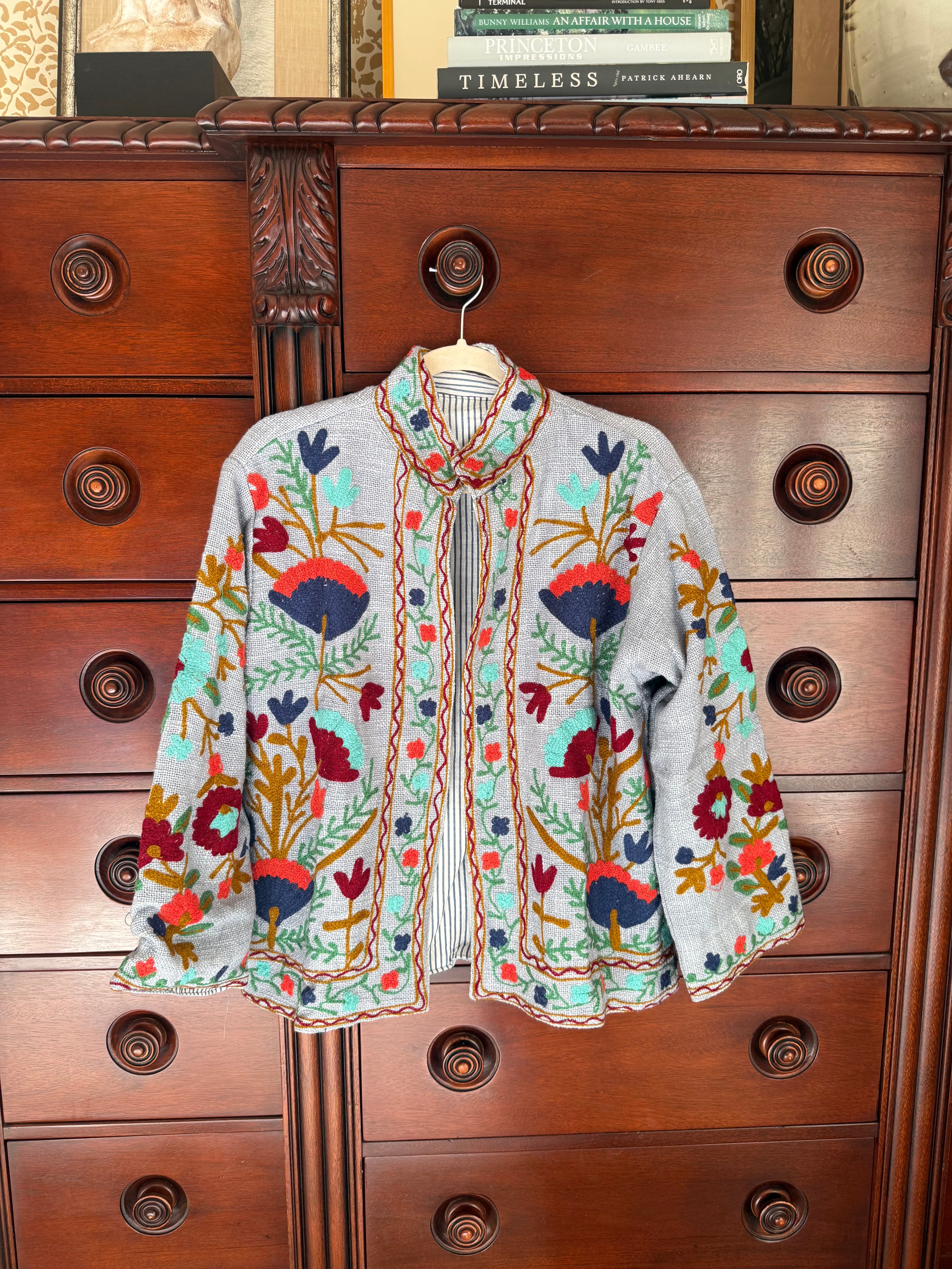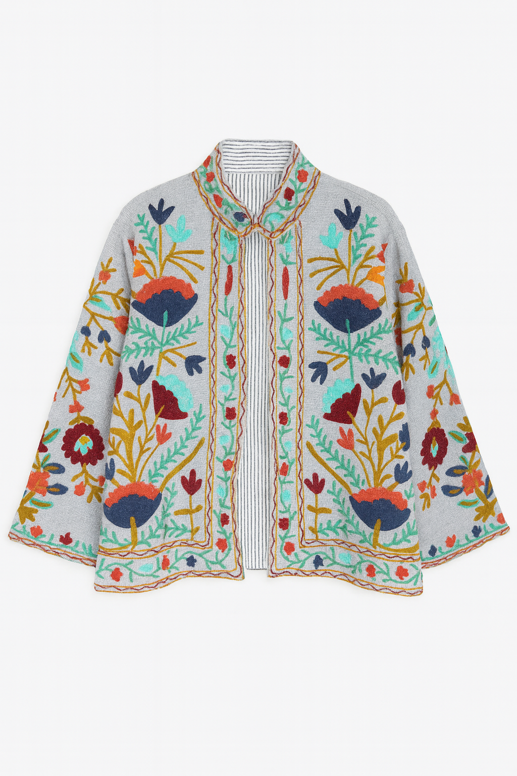 The Isabel is a wearable piece of art — intricately embroidered and beautifully made by hand. Crafted by skilled artisans in India, this jacket features rich embroidery inspired by heritage textile traditions and is fully lined in a soft, striped cotton for a polished finish.