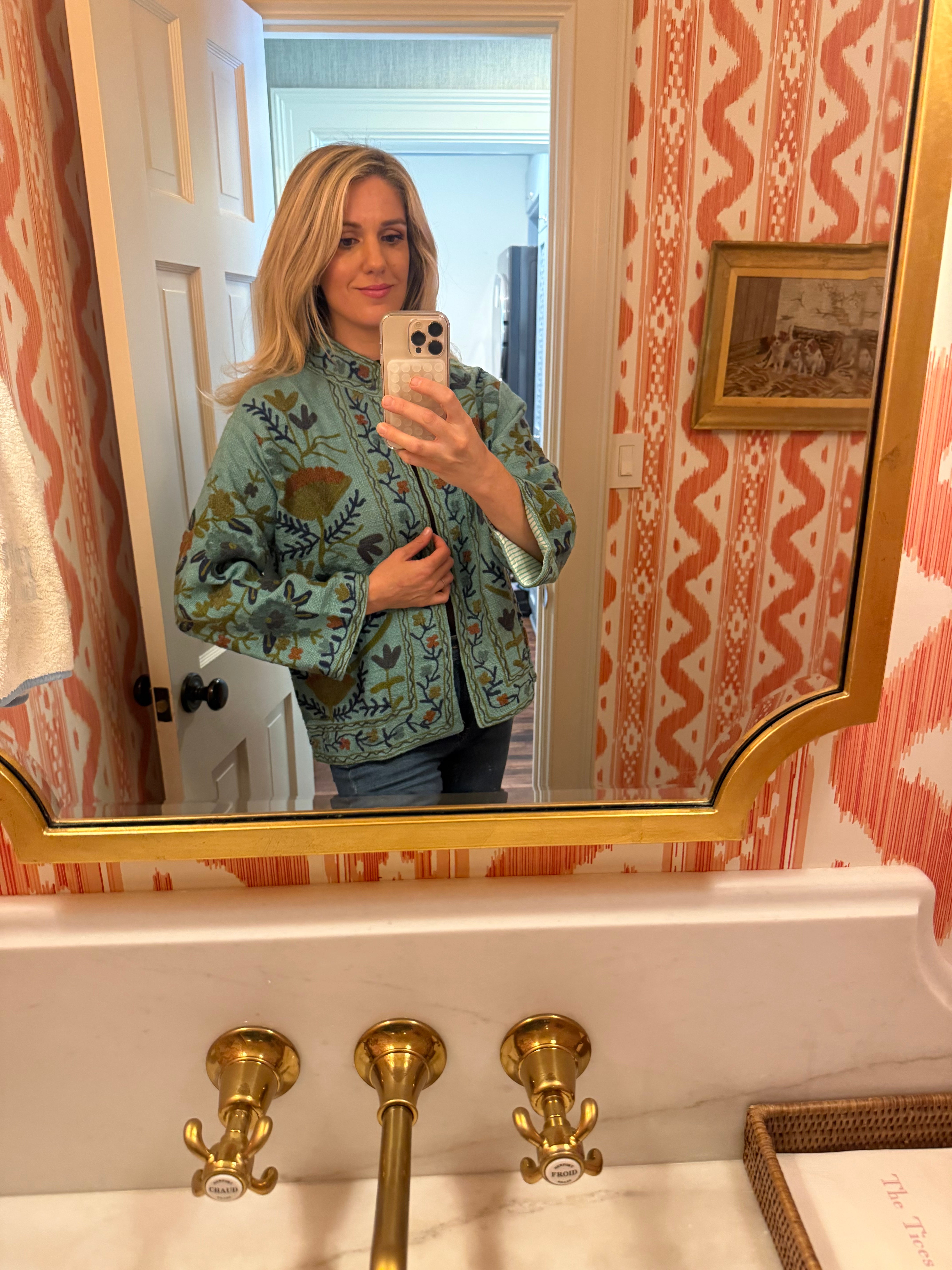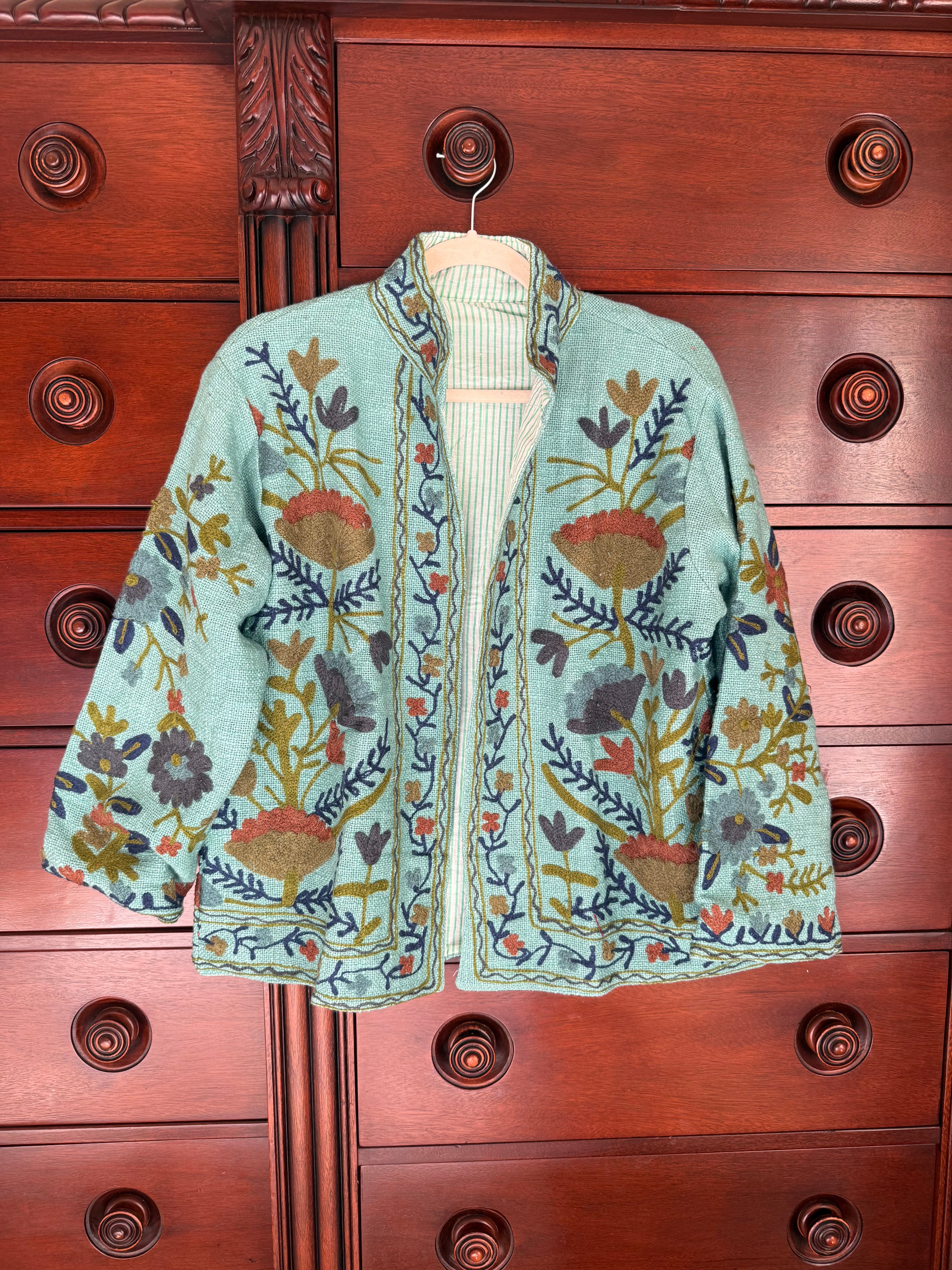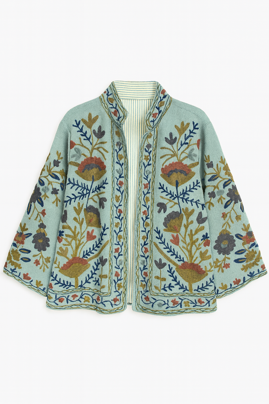 The Isabel is a wearable piece of art — intricately embroidered and beautifully made by hand. Crafted by skilled artisans in India, this jacket features rich embroidery inspired by heritage textile traditions and is fully lined in a soft, striped cotton for a polished finish.
