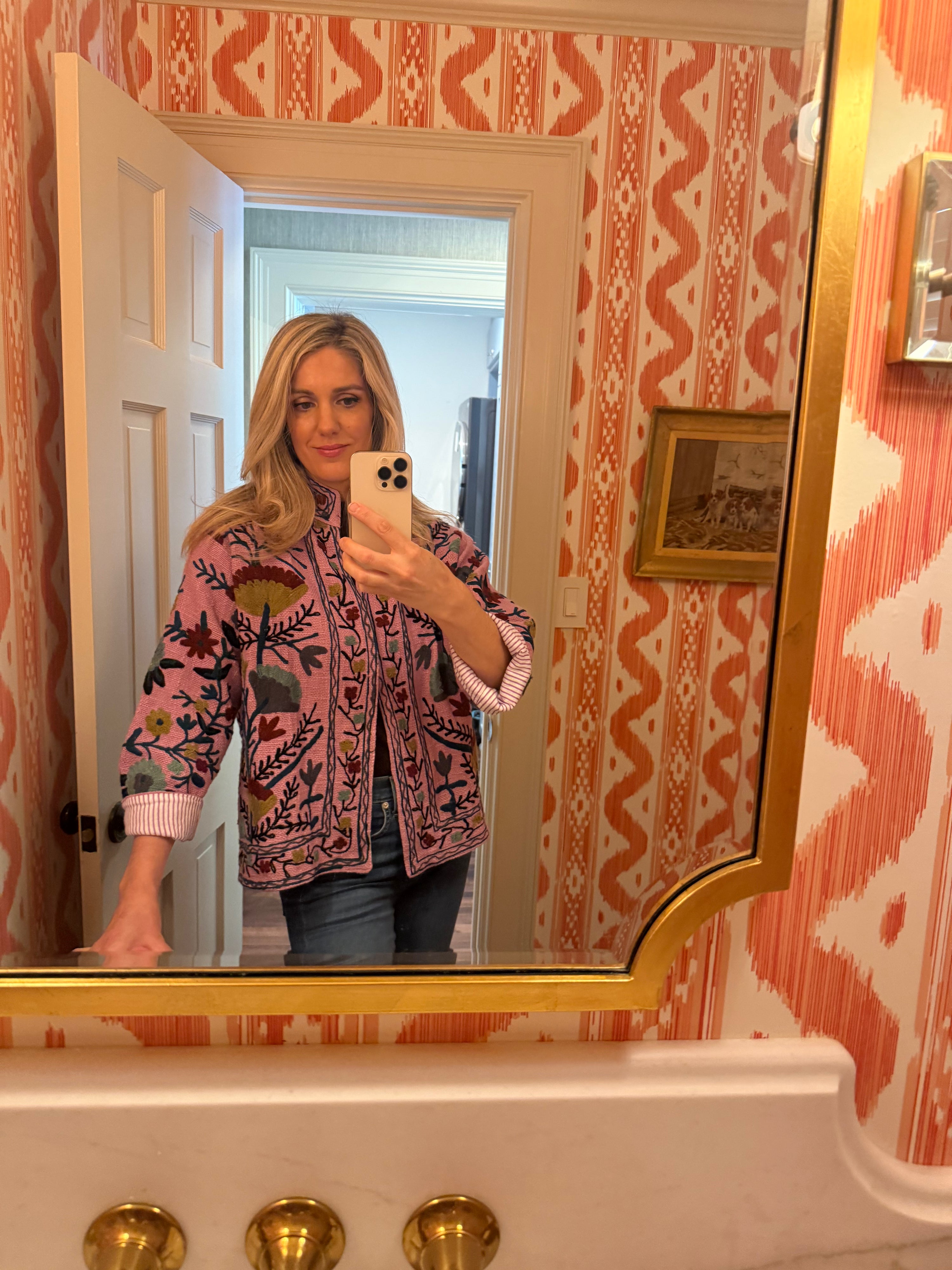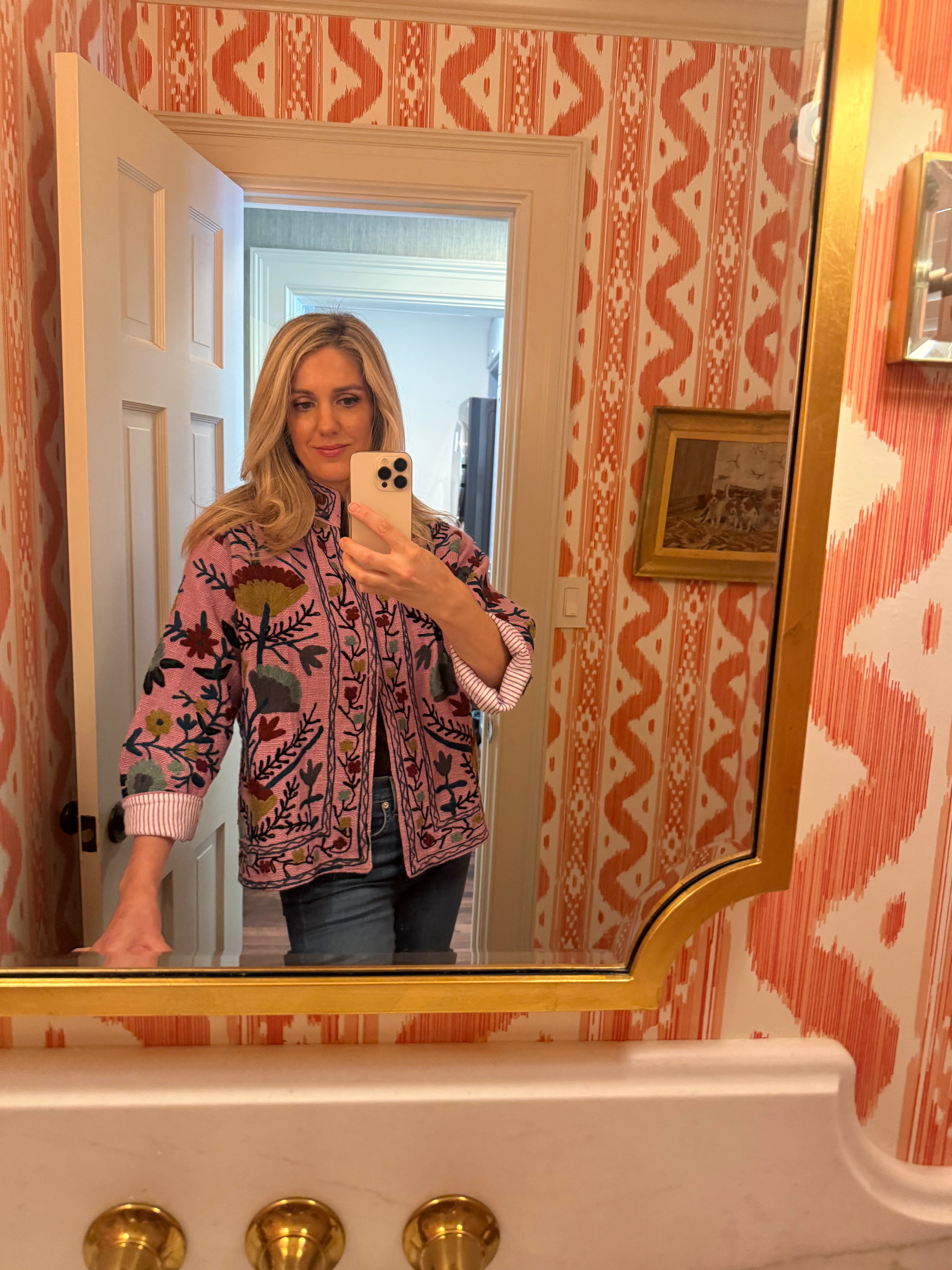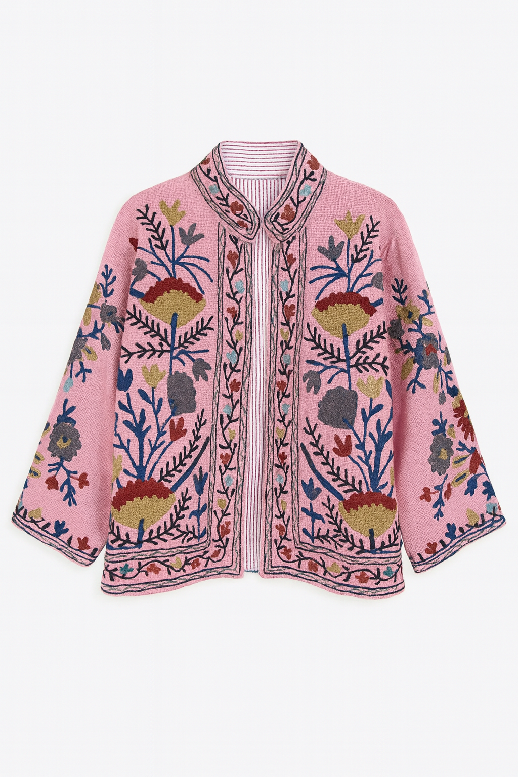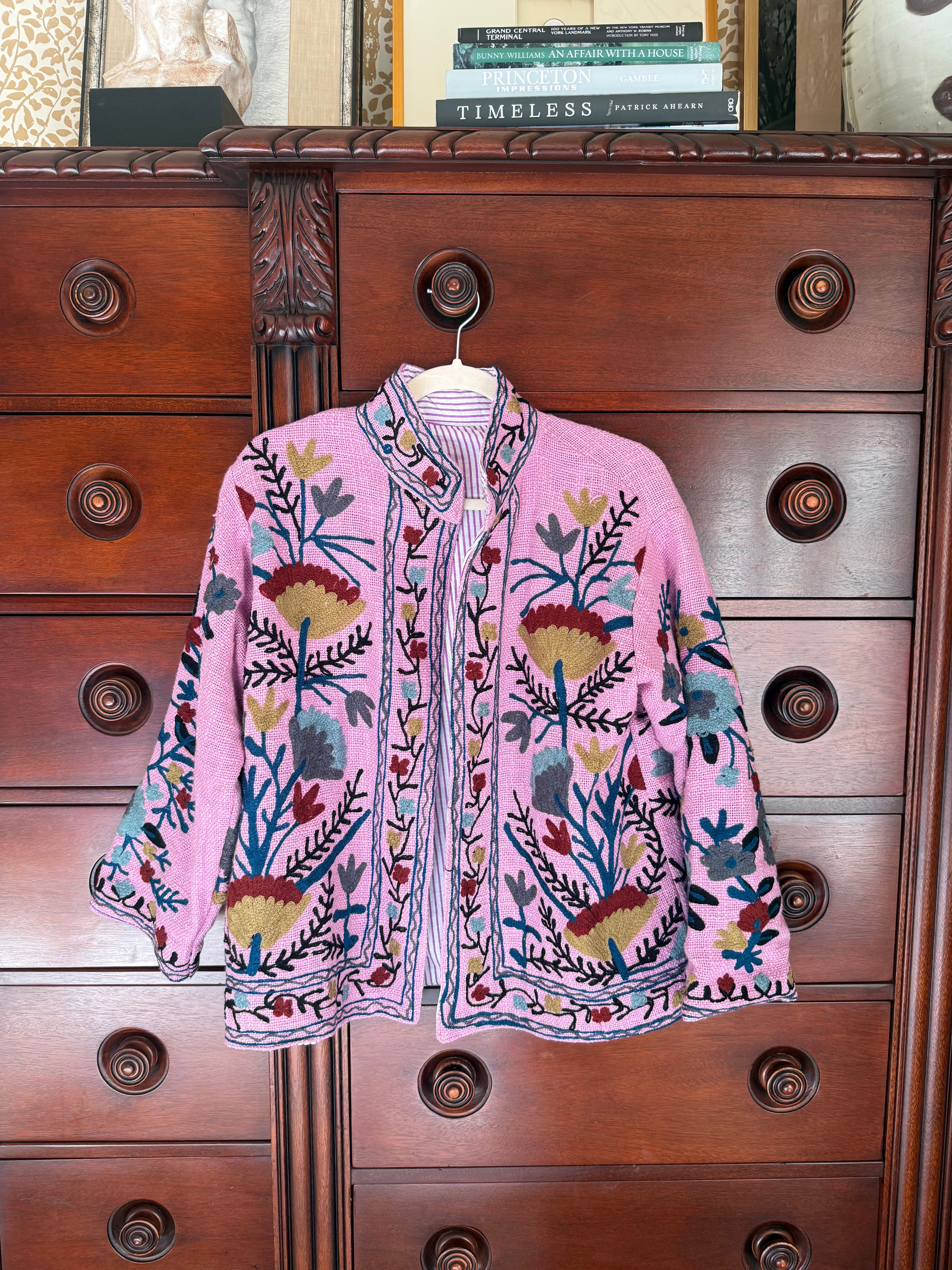 The Isabel is a wearable piece of art — intricately embroidered and beautifully made by hand. Crafted by skilled artisans in India, this jacket features rich embroidery inspired by heritage textile traditions and is fully lined in a soft, striped cotton for a polished finish.