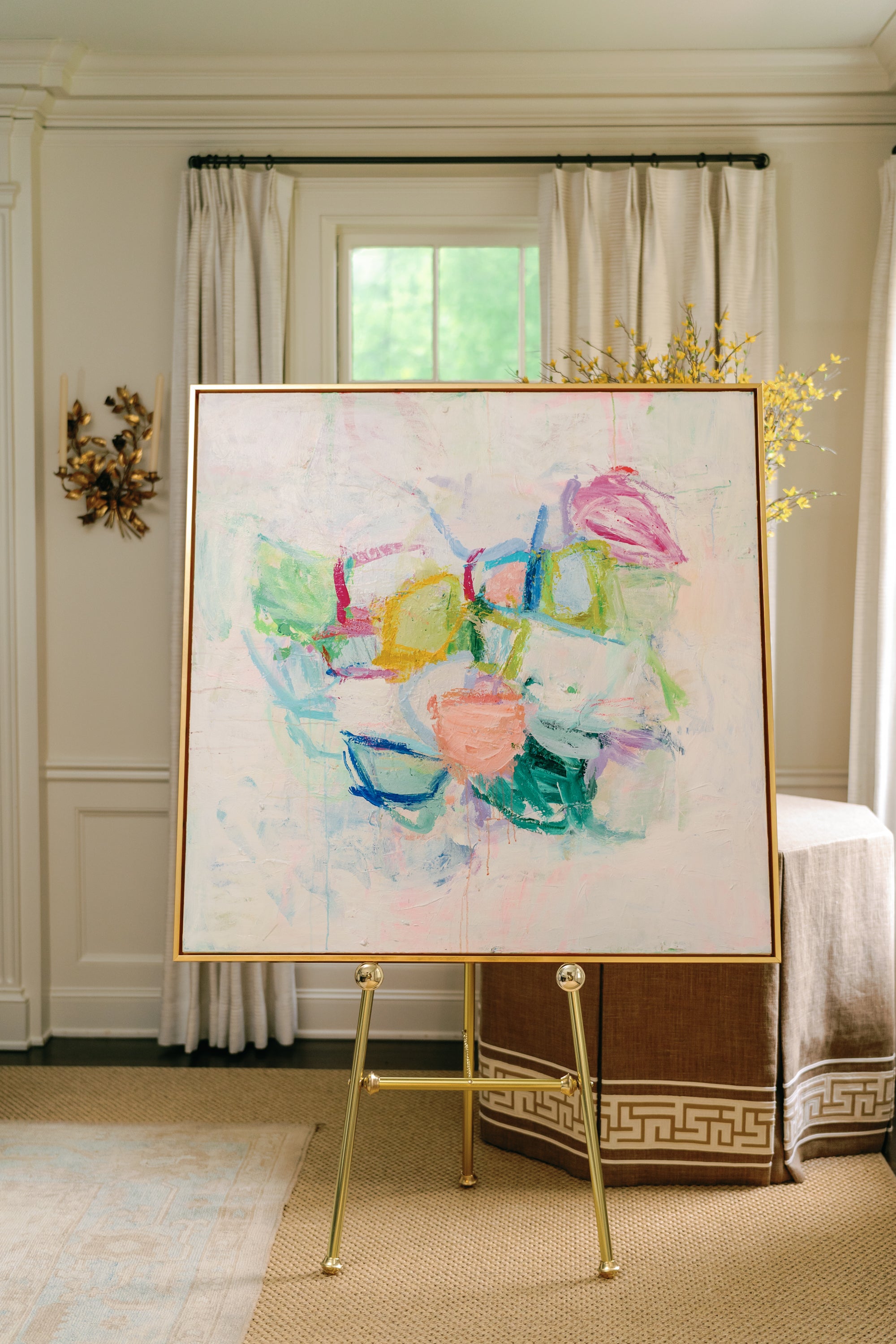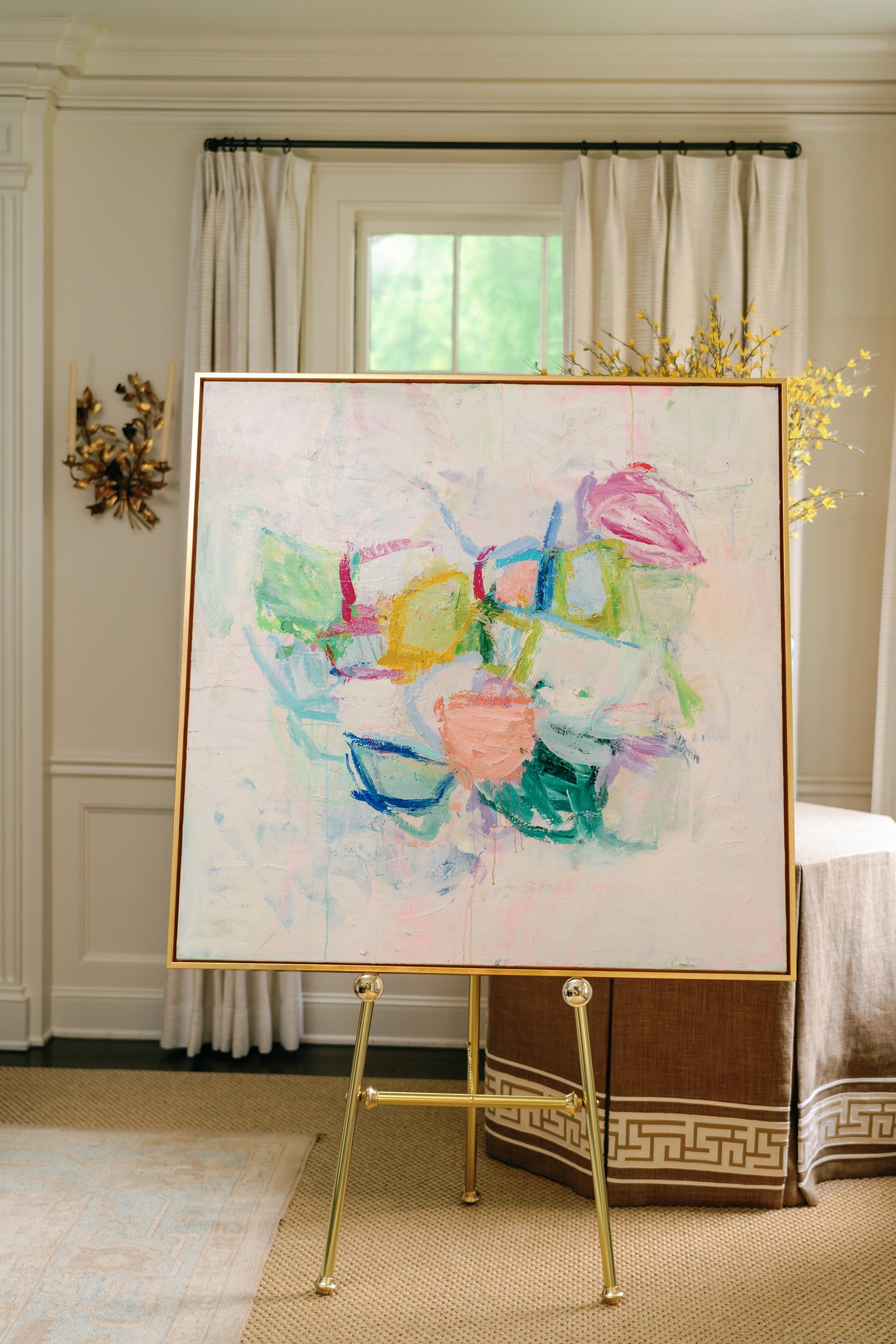 This is an original mixed media panting created by Erin Donahue Tice. It's 48x48 inches and framed in a professional, custom gold float frame and is wired to hang. The artist will sign the front unless otherwise specified.