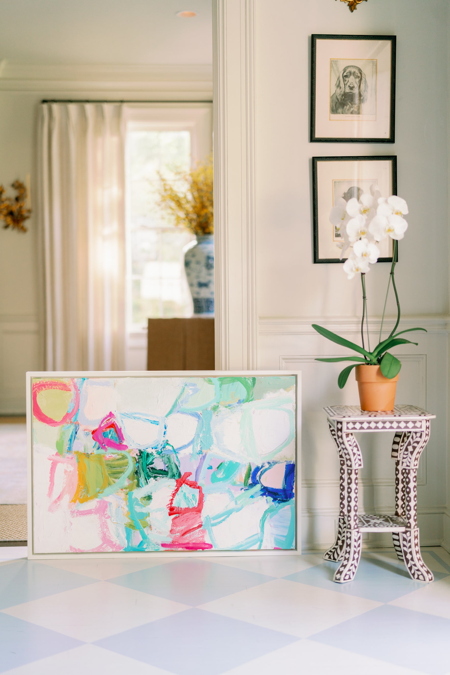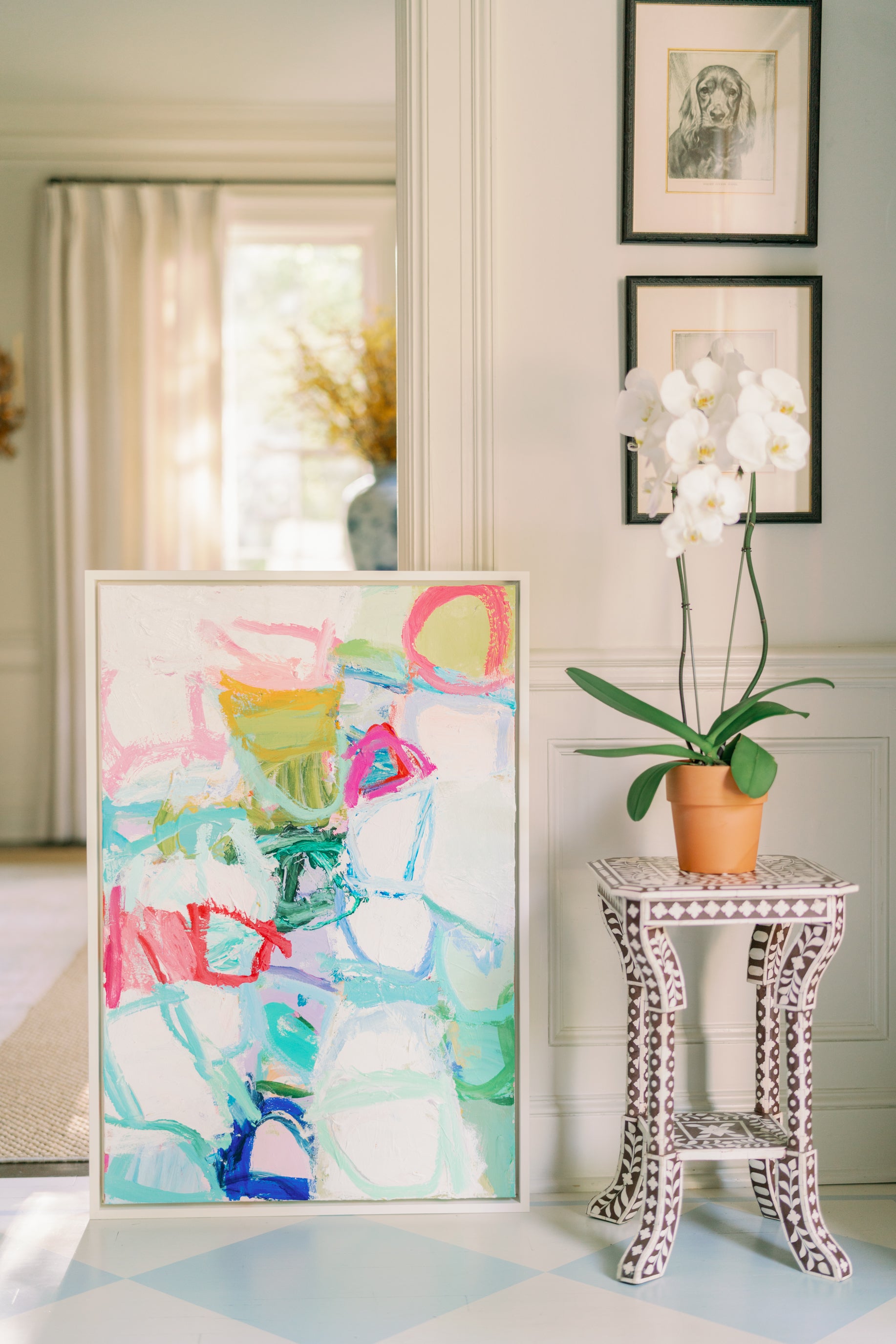 This is an original mixed media panting created by Erin Donahue Tice. It's 36x24 inches and framed in a professional, custom gold float frame. It can be hung vertically or horizontally and is wired to hang. The artist will sign the front unless otherwise specified.