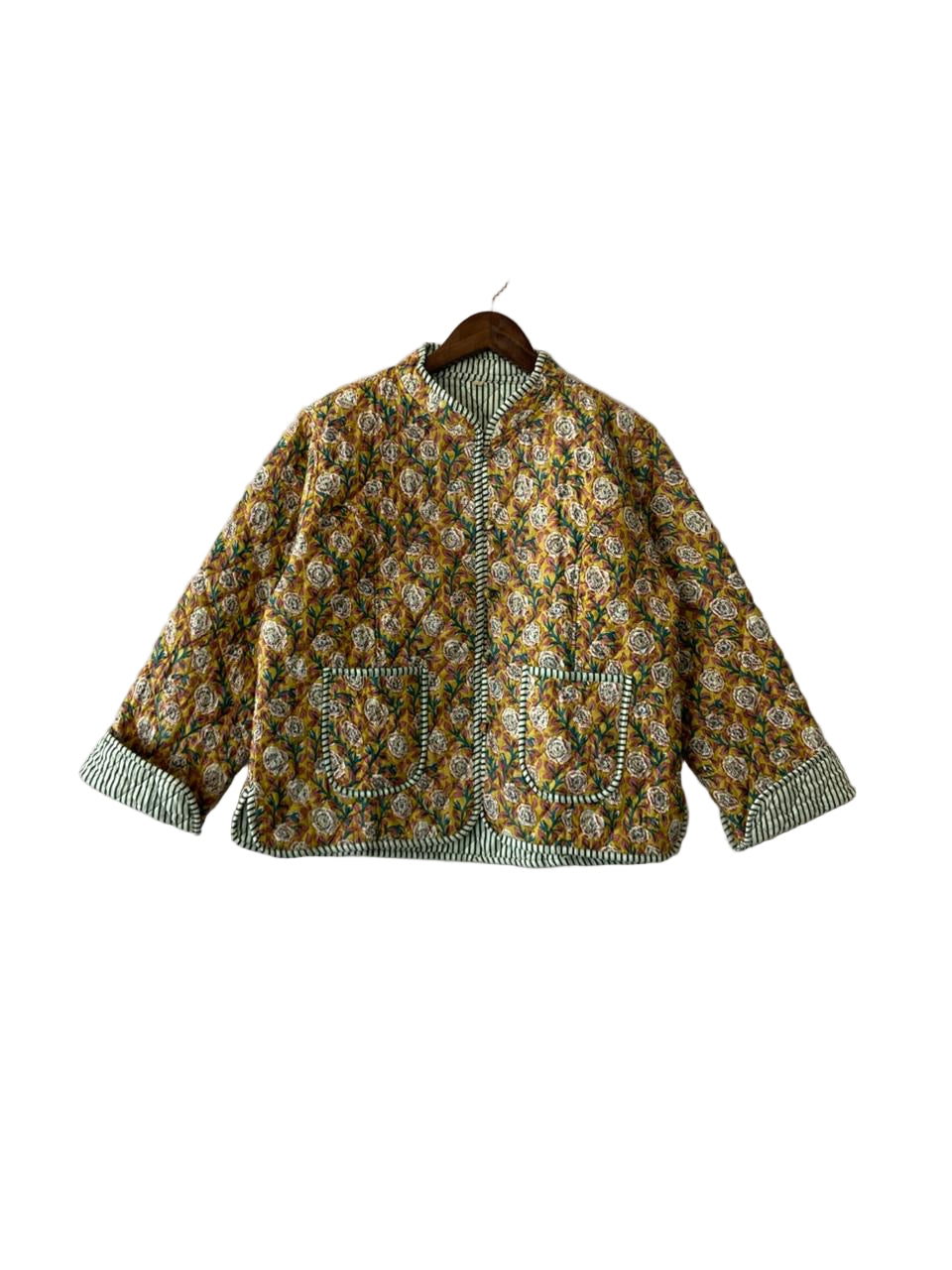 Each jacket is handmade by our artisan team in India, quilted with care and attention to detail, so no two jackets are exactly alike. Crafted with covered buttons and piped pockets on the patterned side, and a simple, complimentary striped pattern on the reverse side (no pockets), The Charlotte has a timeless shape and is made for women who love classic dressing with a bit of personality.