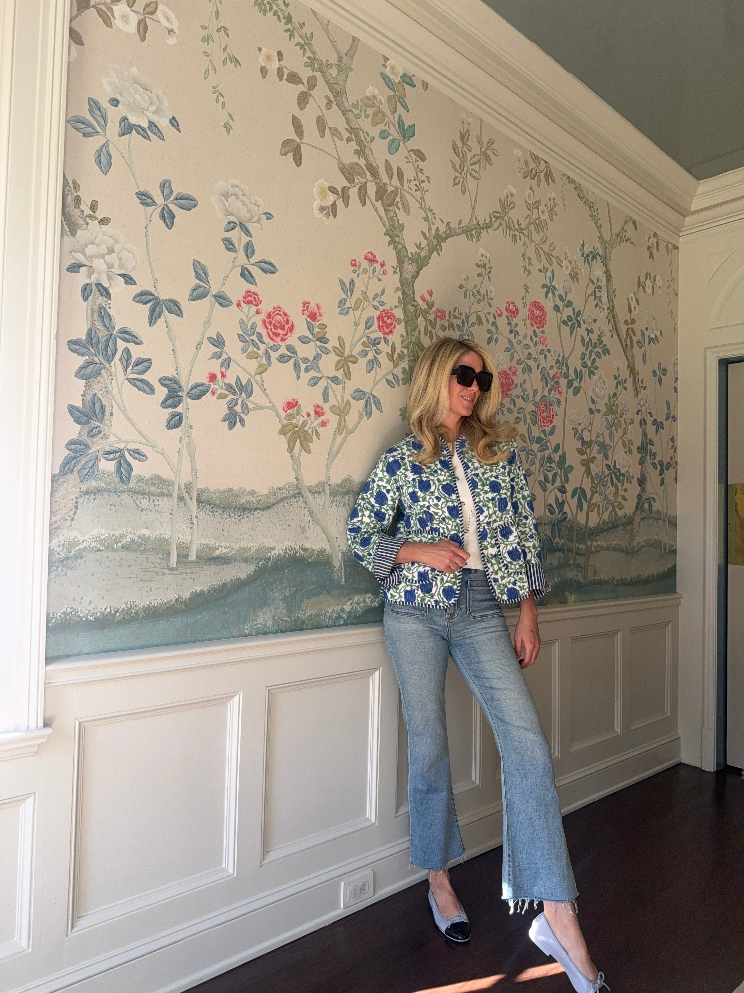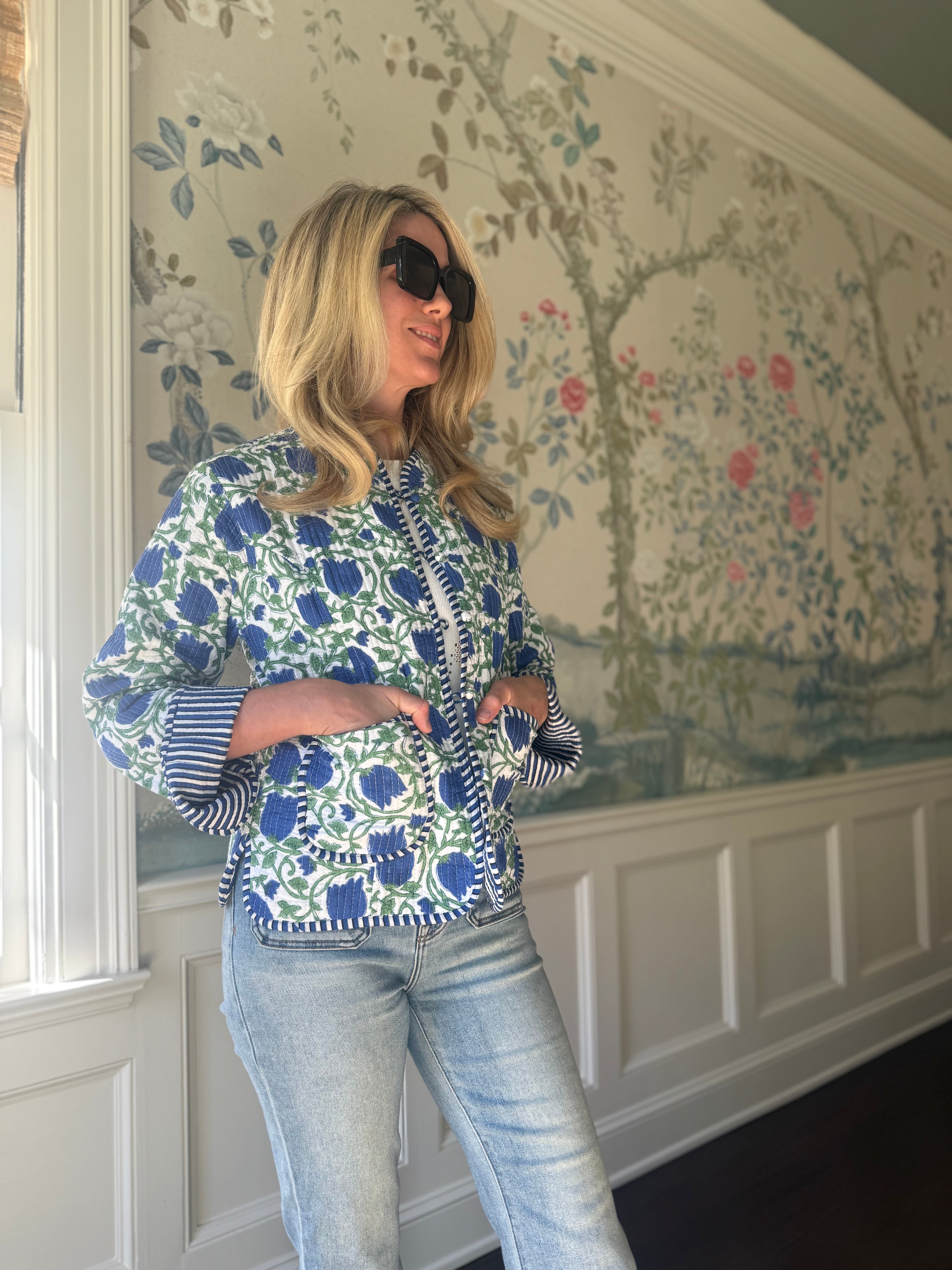 Meet The Charlotte — the spirited sister to our signature quilted jacket. This print has a white background with blue and green floral accents.