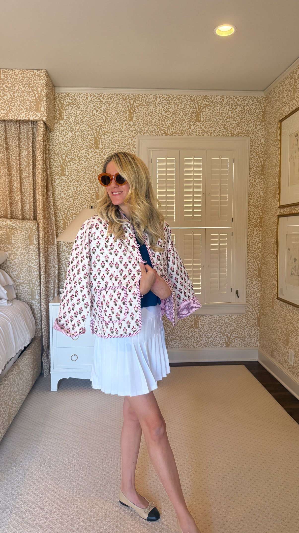 Meet The Charlotte — the spirited sister to our signature quilted jacket. This jacket is features a white background with pink and green floral accents.