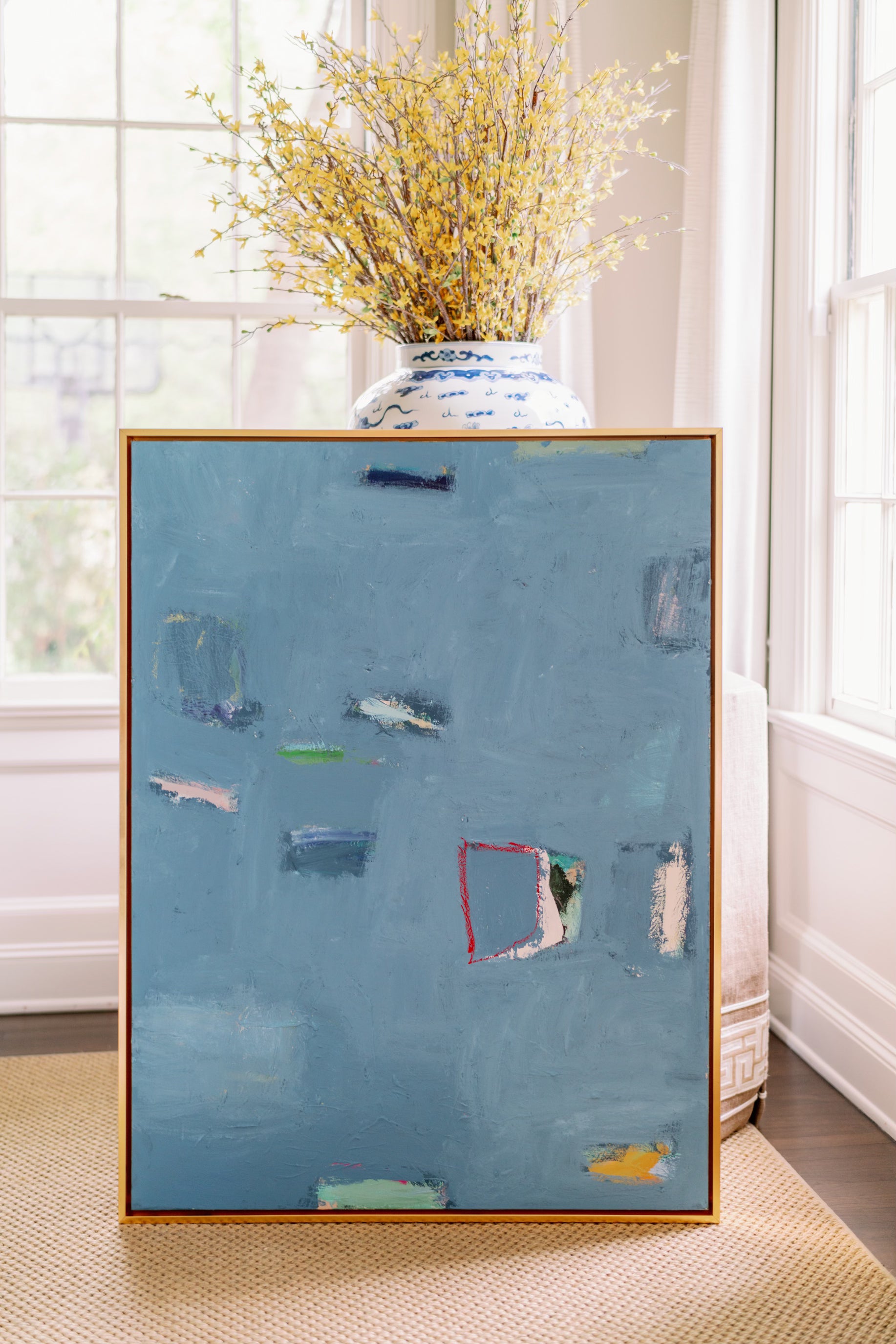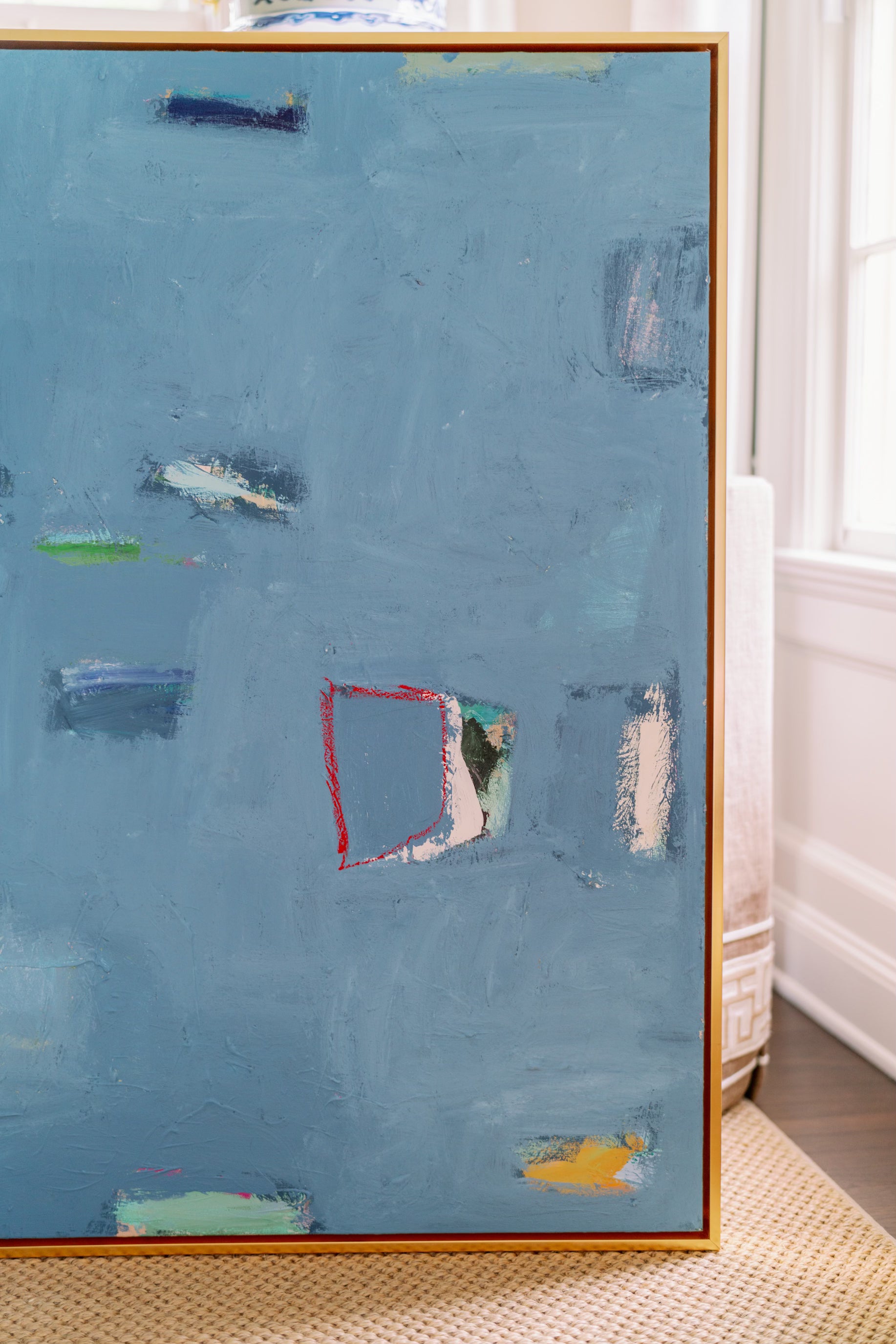 This is an original mixed media panting created by Erin Donahue Tice. It's 48x36 inches and framed in a professional, custom gold float frame and is wired to hang. The artist will sign the front unless otherwise specified.