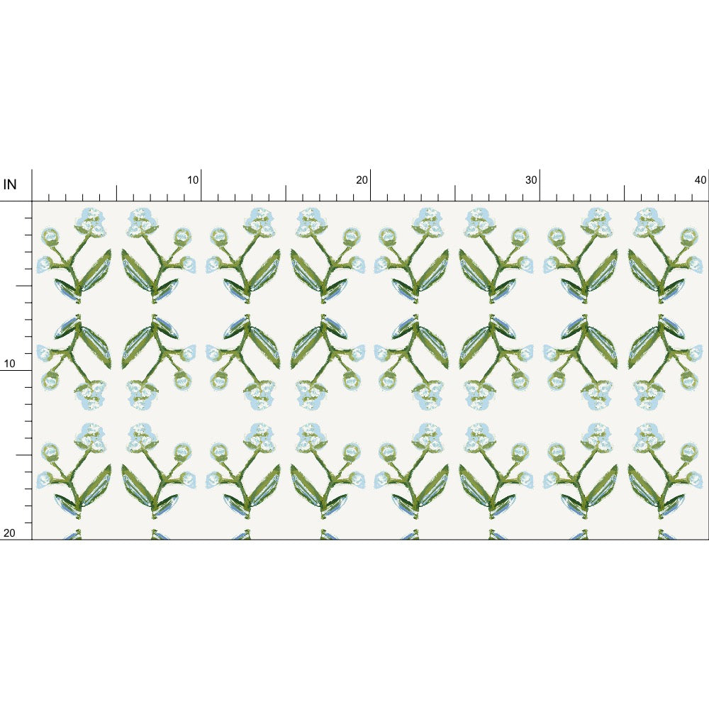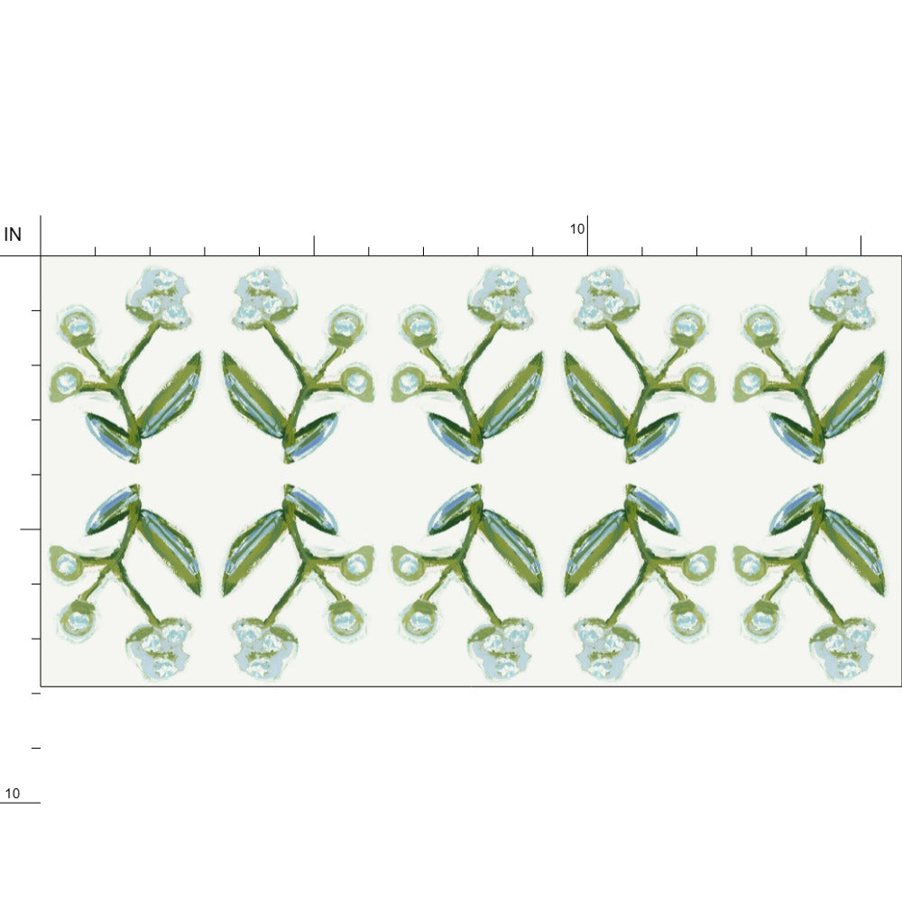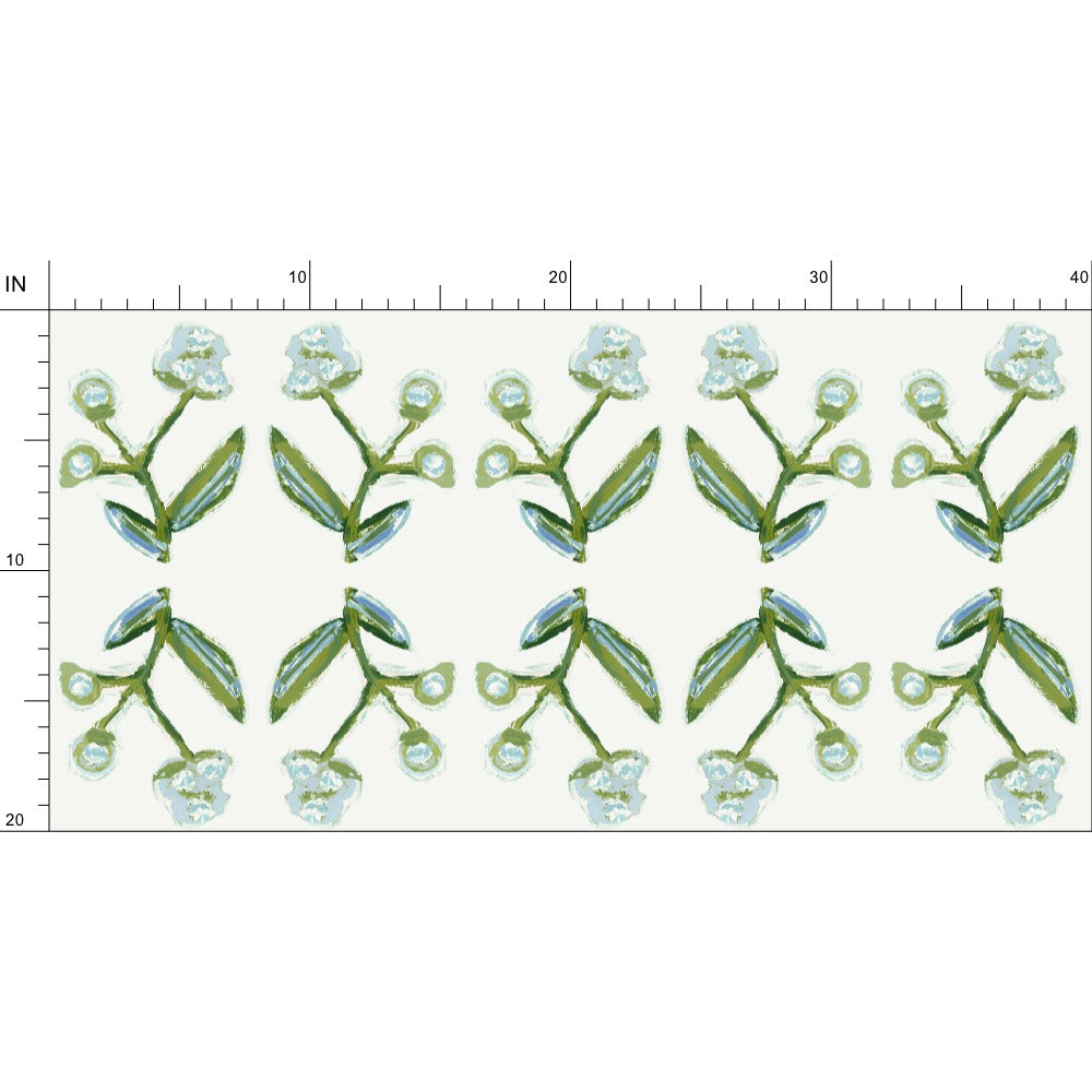 - The Antonia is a custom fabric that is a translation of one original Honeysuckle Painting with a white ground and blue and green accents.