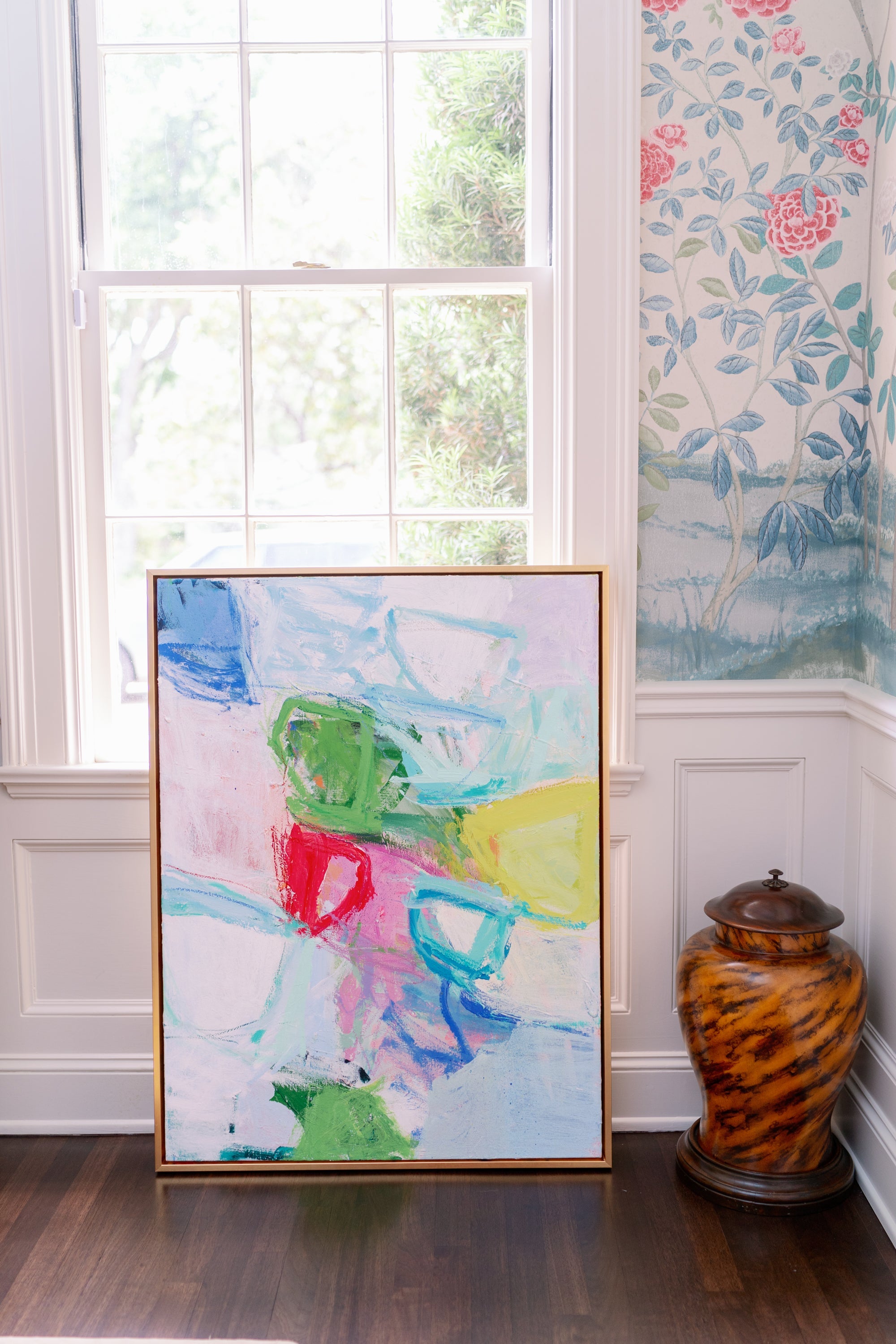 40x30 original painting. Mixed media on canvas. Custom framed in gold float frame. Can be hung vertically or horizontally. Signed by artist on the back of painting. Can be signed on the front upon request.
