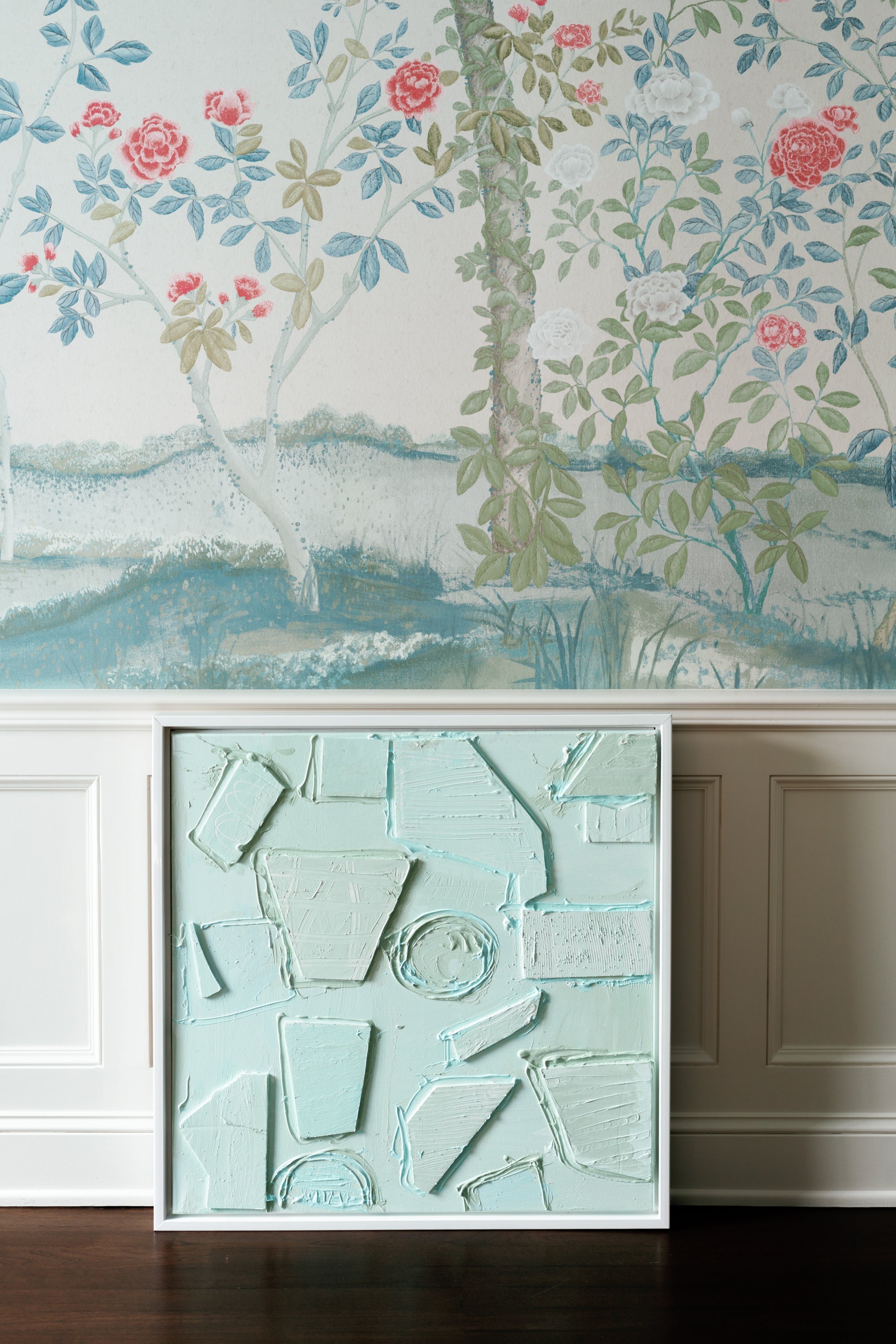 30x30 original painting. Mixed media on canvas. Raised texture and 3D elements. Custom framed in white float frame. Can hang vertically or horizontally. Signed by artist on the back of painting.