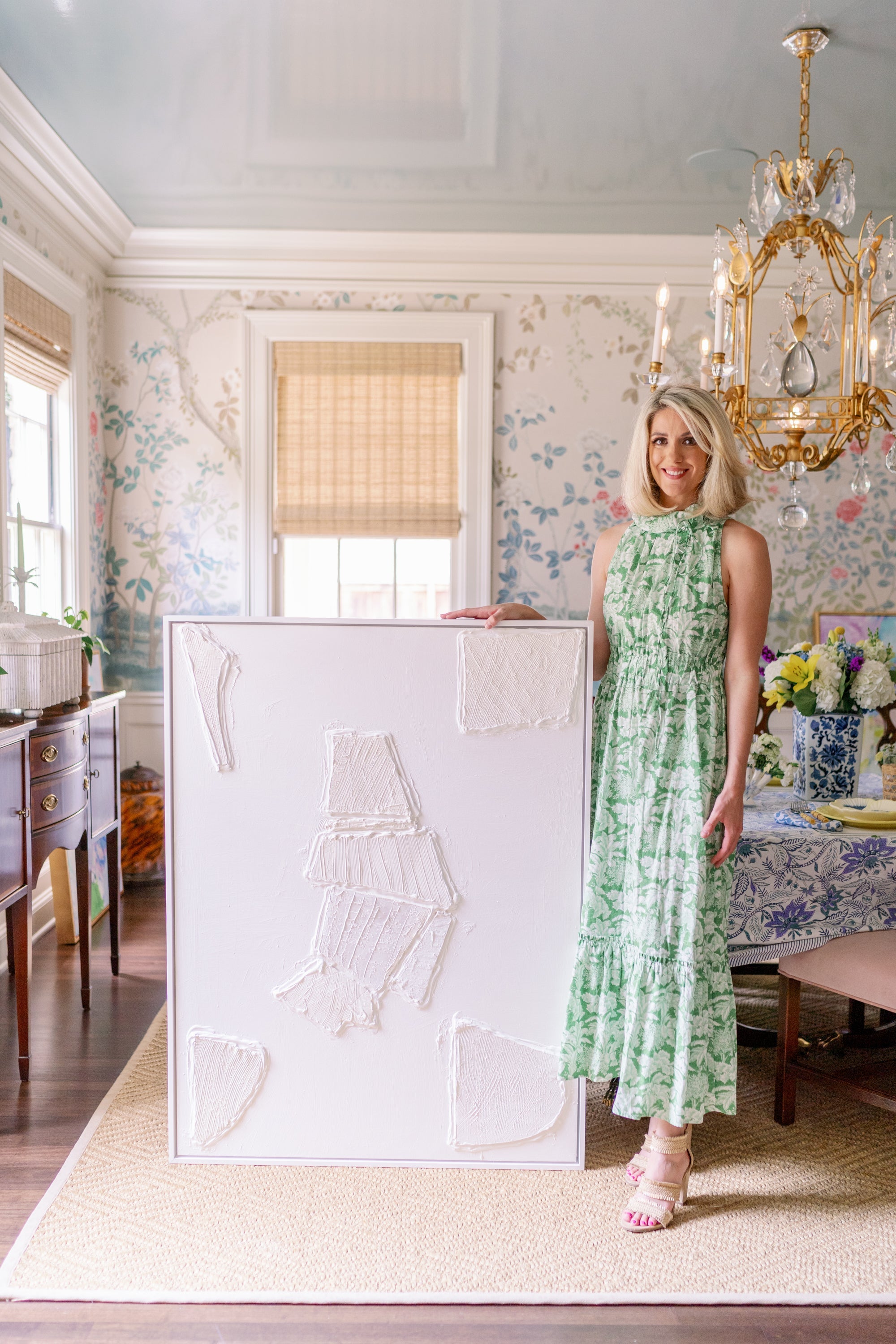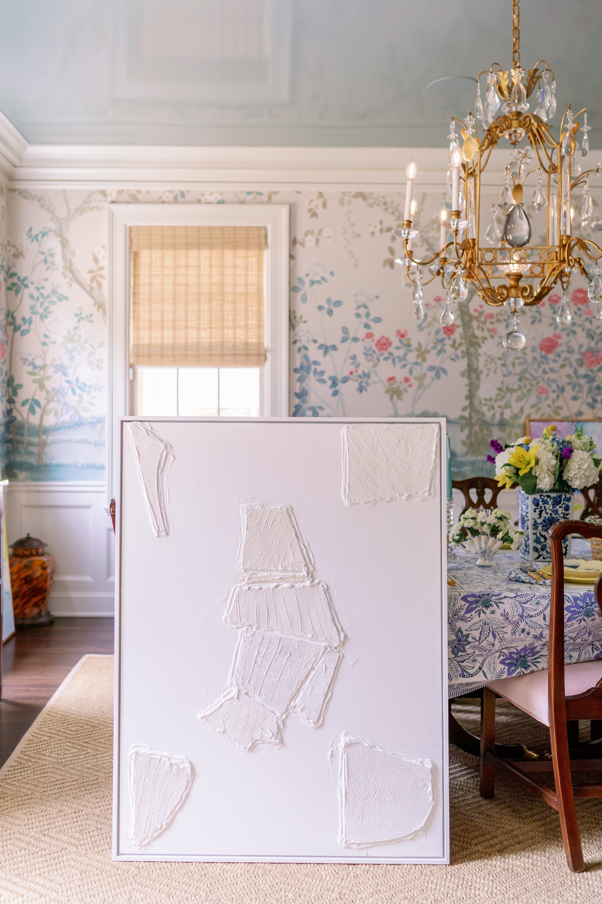 48x36 original painting. Mixed media on canvas. White on white with raised texture and 3D elements. Custom framed in white float frame. Can hang vertically or horizontally. Signed by artist on the back of painting.