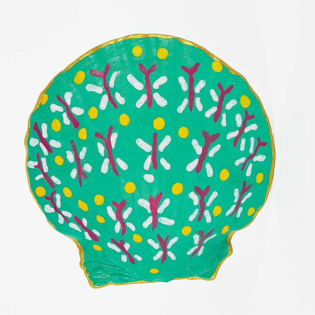 •    Details: A beautiful seashell, carefully decoupaged with intricate designs, sealed for durability, and finished with a hand-painted gold leaf trim.