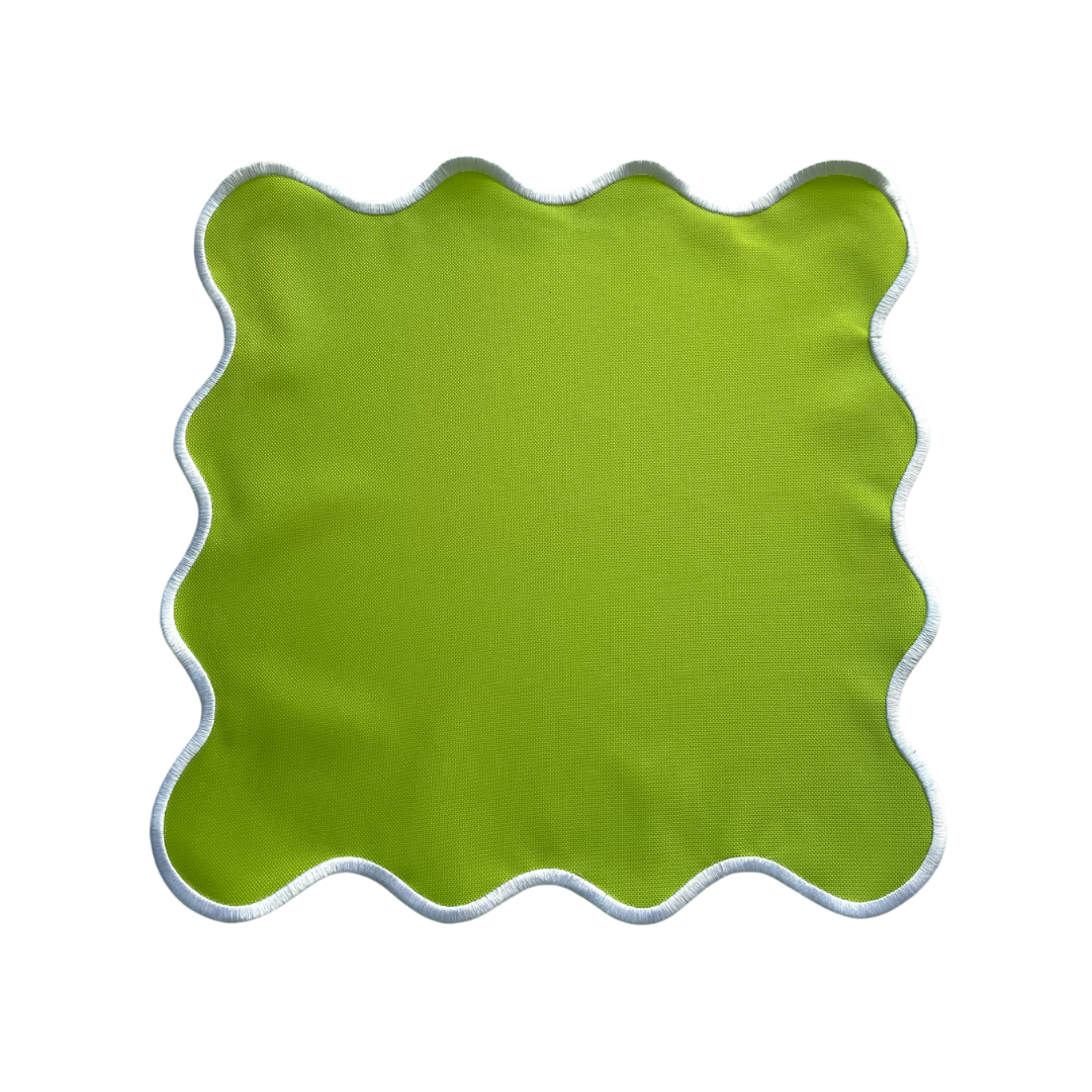 Add a touch of elegance to any table setting with our beautifully crafted square scalloped placemat in lime green with white trim. Designed with a delicate scallop embroidery edge, this durable placemat combines style and practicality with its high-quality, waterproof polyester material, making it perfect for both indoor and outdoor use. Measuring approximately 15”x15”, it provides ample space for any dishware while offering easy care and clean-up.