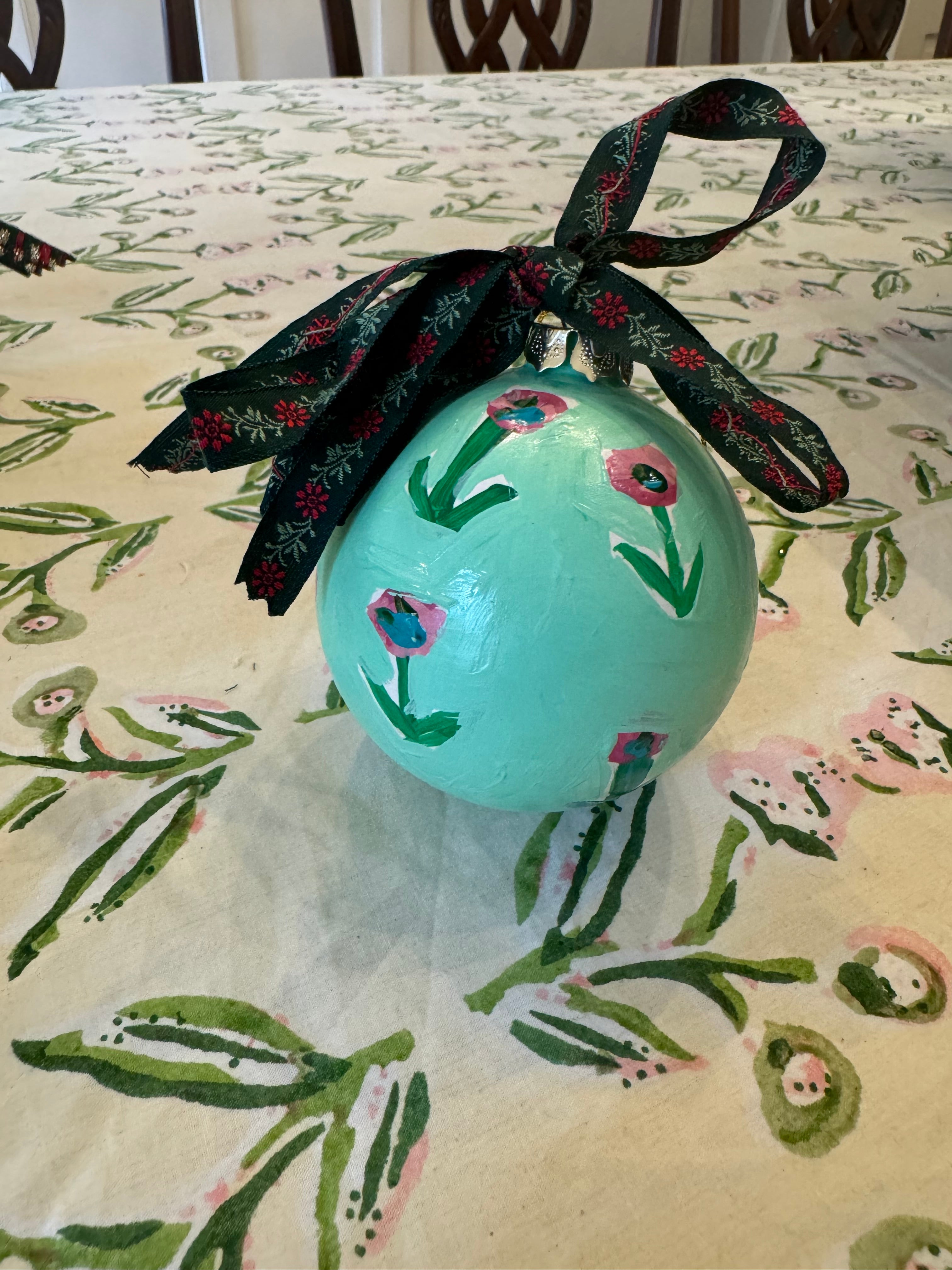 Original, hand-painted, one-of-a-kind ceramic ornament painted by Erin in her signature abstract style with a painterly look and feel. Tied with a coordinating ribbon. Varnished and sealed with a satin finish.