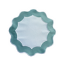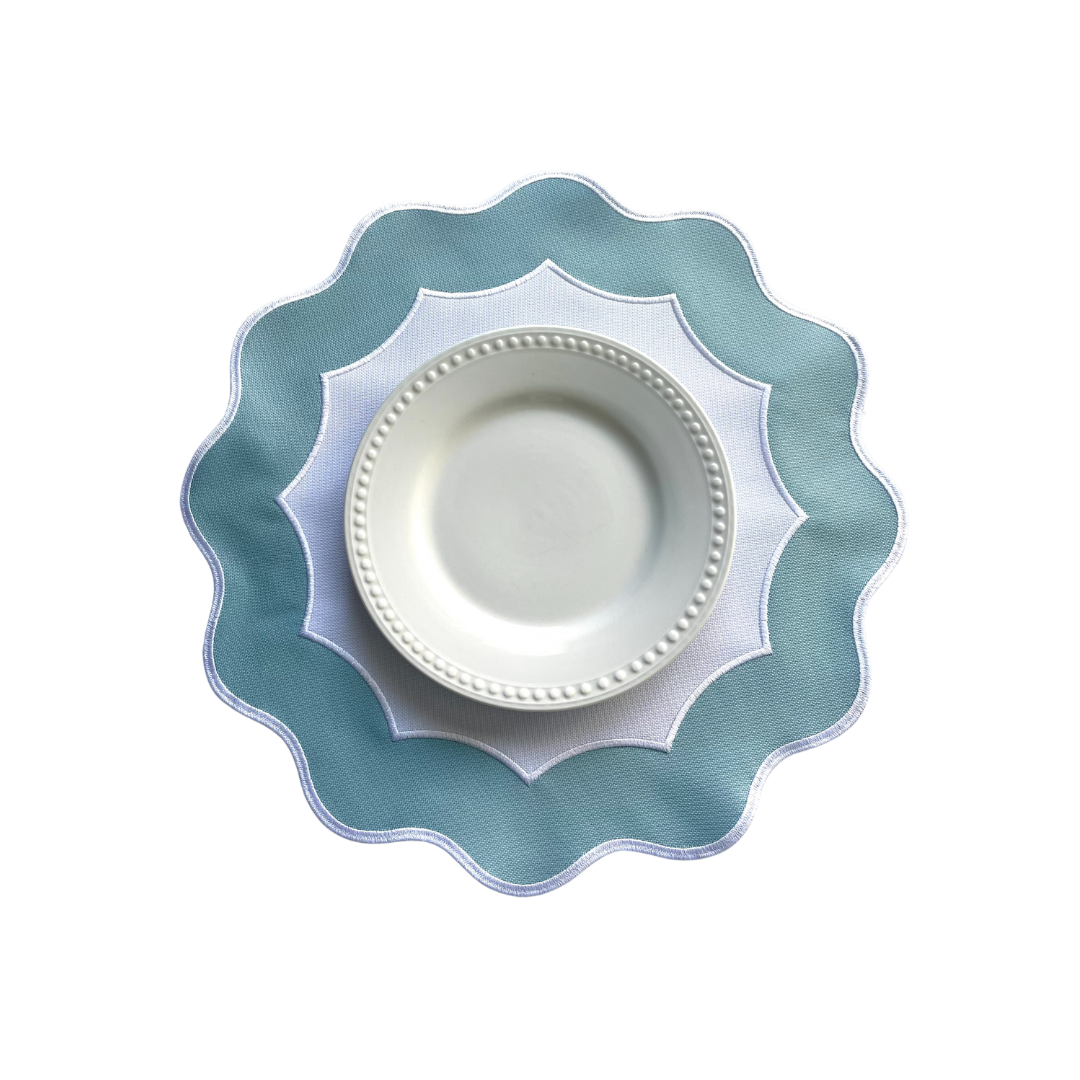 Add a touch of elegance to any table setting with our beautifully crafted round scalloped placemat in white and teal with white trim. Designed with a delicate scallop embroidery edge, this durable placemat combines style and practicality with its high-quality, waterproof polyester material, making it perfect for both indoor and outdoor use. Measuring approximately 15”x15”, it provides ample space for any dishware while offering easy care and clean-up.