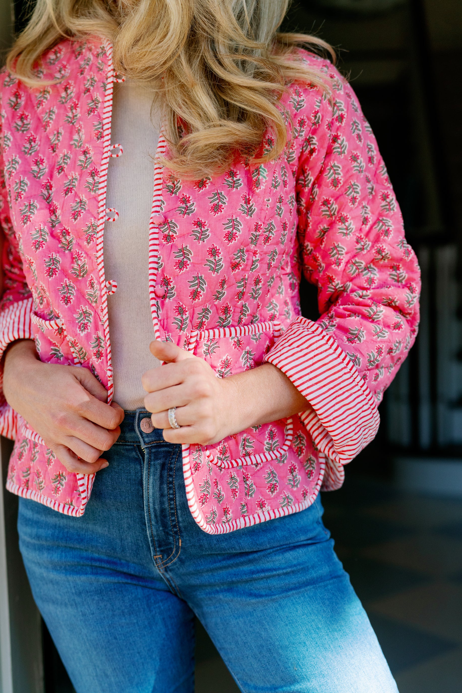 Meet The Charlotte — the spirited sister to our signature quilted jacket. This jacket features a medium pink background and dark pink and dark green floral accents.