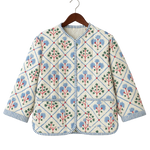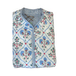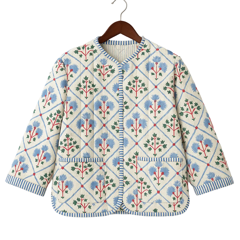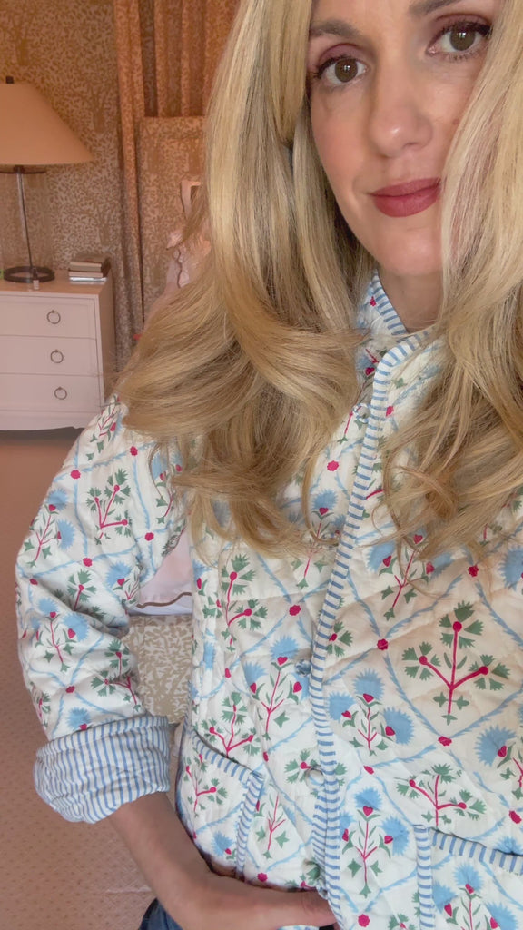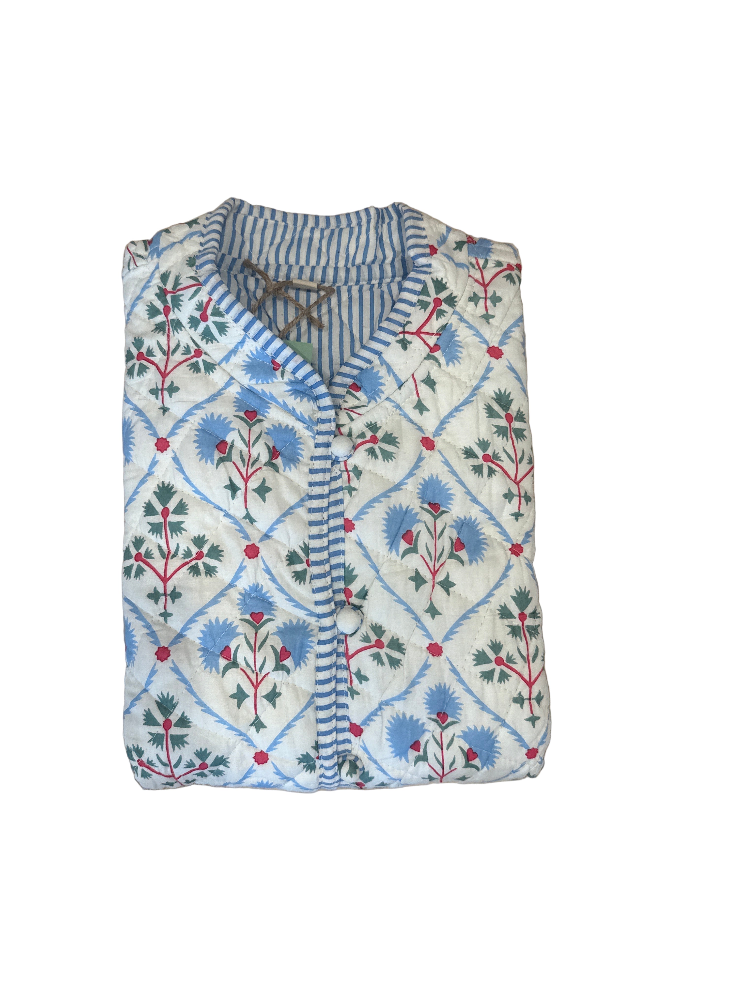 Each jacket is handmade by our artisan team in India, quilted with care and attention to detail, so no two jackets are exactly alike. Crafted with covered buttons and piped pockets on the patterned side, and a simple, complimentary striped pattern on the reverse side (no pockets).