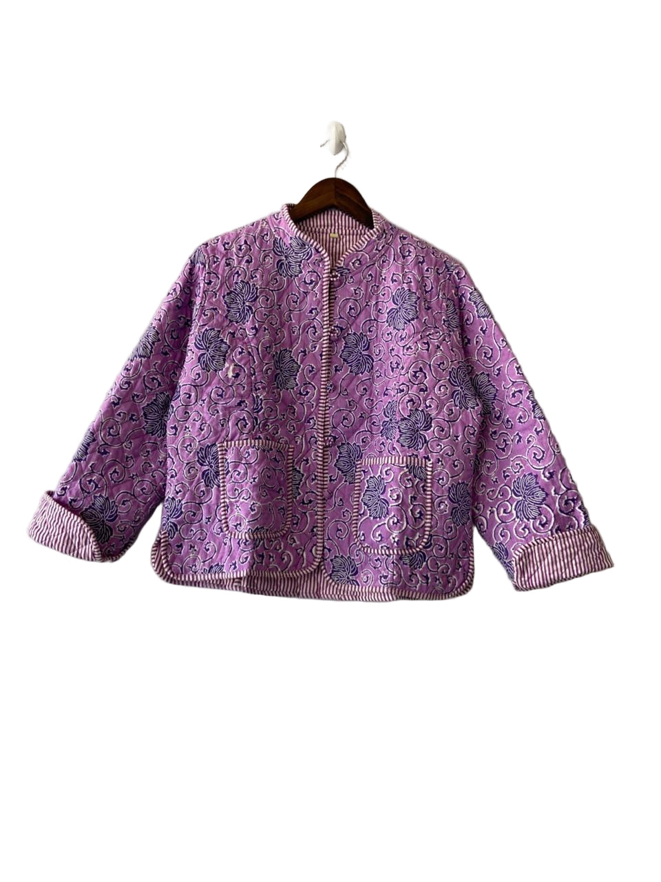 Each jacket is handmade by our artisan team in India, quilted with care and attention to detail, so no two jackets are exactly alike. Crafted with covered buttons and piped pockets on the patterned side, and a simple, complimentary striped pattern on the reverse side (no pockets).