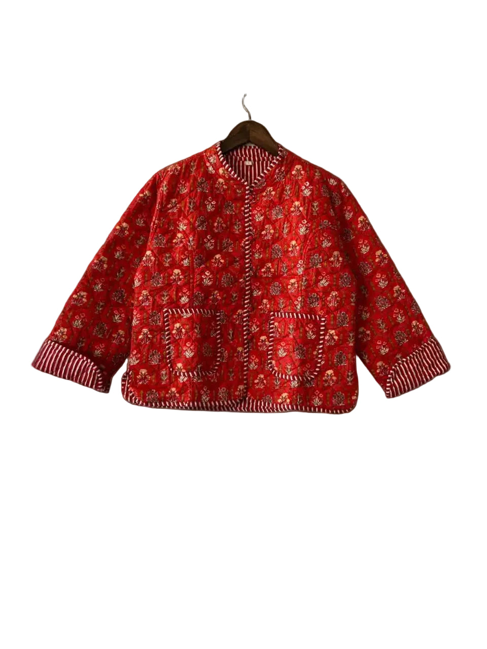 Each jacket is handmade by our artisan team in India, quilted with care and attention to detail, so no two jackets are exactly alike. Crafted with covered buttons and piped pockets on the patterned side, and a simple, complimentary striped pattern on the reverse side (no pockets).