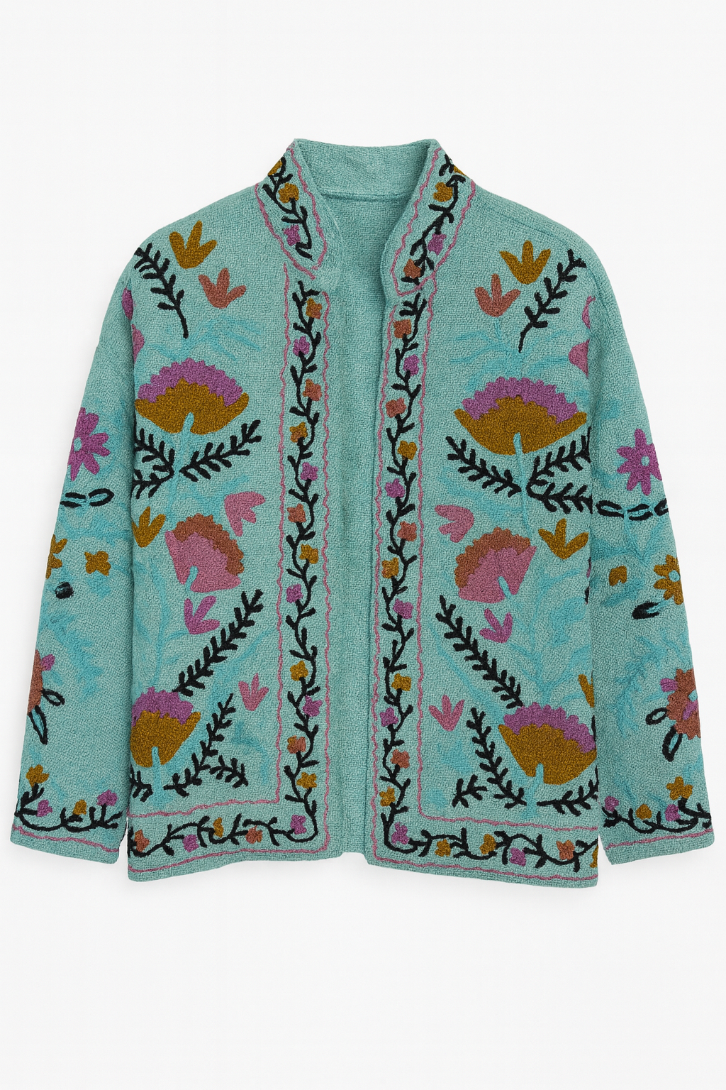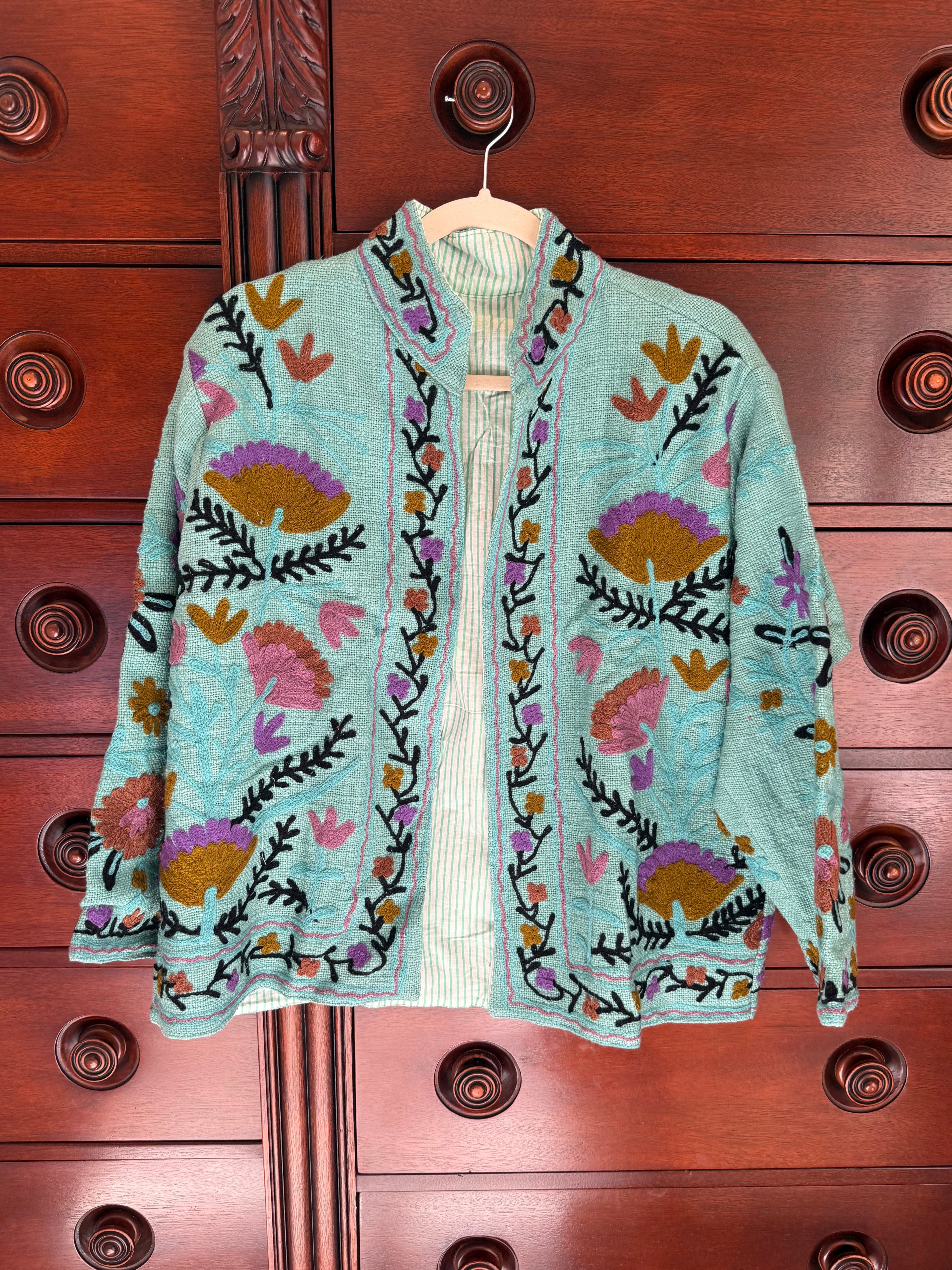 Each jacket is handmade by our artisan team in India, quilted with care and attention to detail, so no two jackets are exactly alike. Crafted with covered buttons and piped pockets on the patterned side, and a simple, complimentary striped pattern on the reverse side (no pockets).