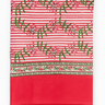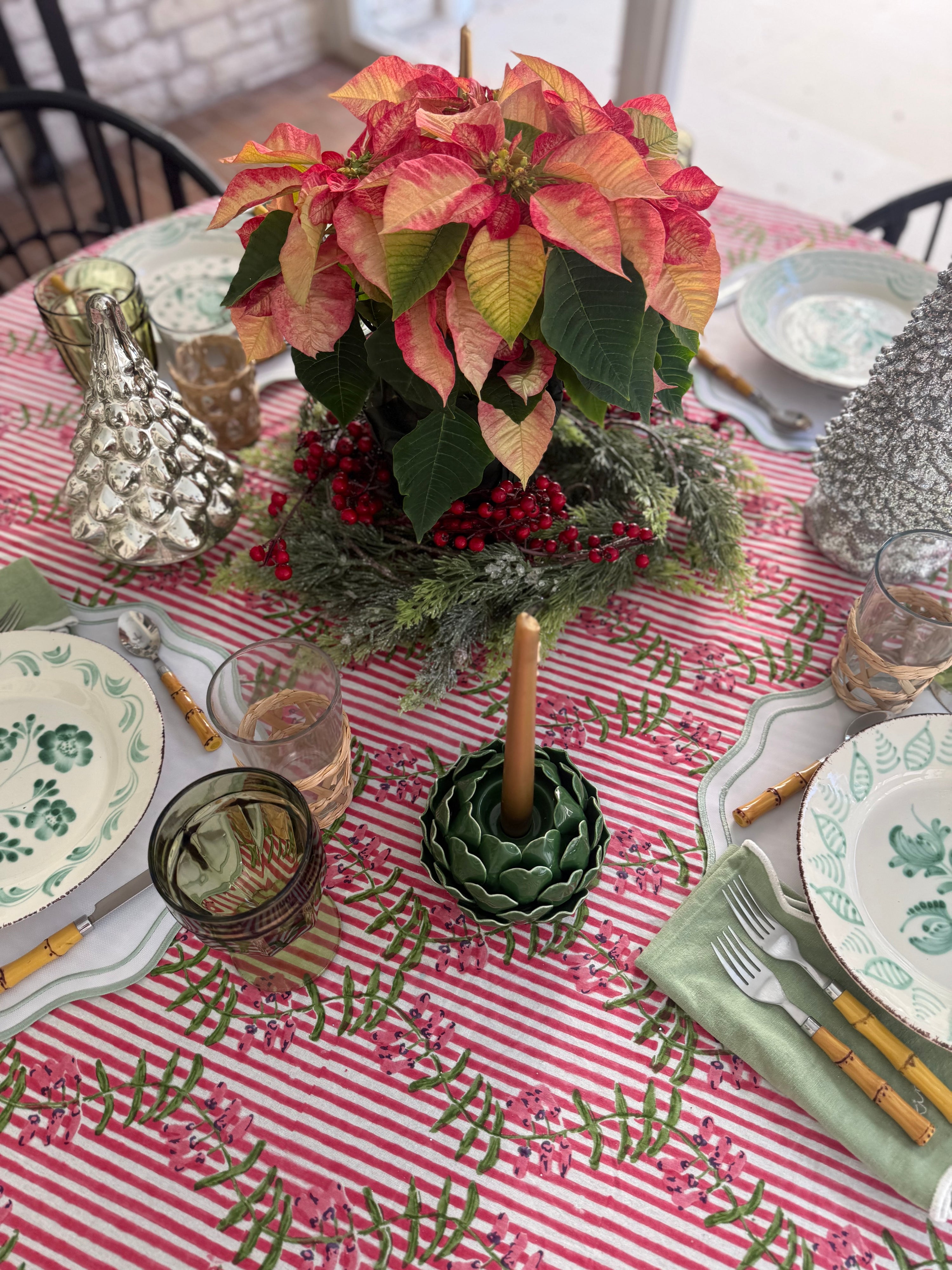 - Thick Scalloped trim (green) on round version, block print pattern as trim on rectangular version.