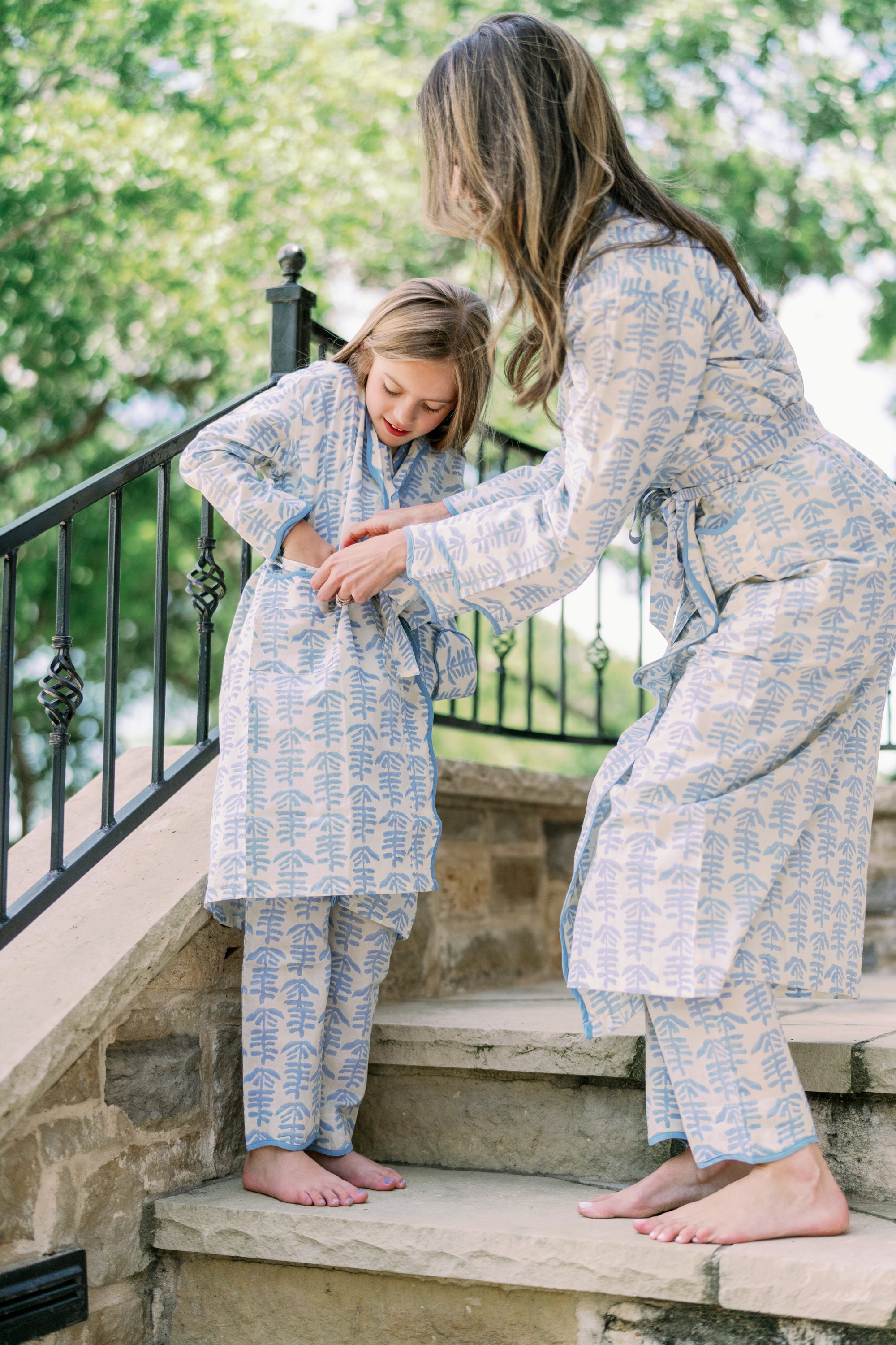 To minimize wrinkles, wash the garments in warm water (not hot) with a small load on the gentle cycle. Once the wash cycle is complete, promptly remove the items and turn them inside-out before hanging to maintain their shape. Light ironing, particularly on the scalloping, enhances the appearance of our cotton garments.
