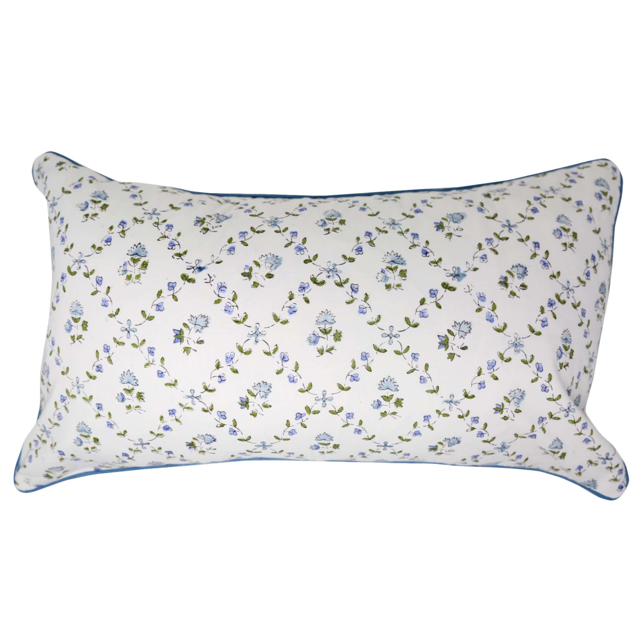 Our newest addition to the pillow line up is here! A whimsical botanical with delicate blue flowers and a latticed green vine. We find this print is easy to insert into any room but we especially love the soothing hues in a bedroom. Try it as a Euro size, lumbar, or traditional square throw pillow.
