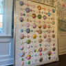 A collage of hand painted seashells, starfish and sand dollars collaged on a light pink painted canvas, custom framed in a clear UV-protected acrylic box frame. Wired and ready to hang. 60x48 inches.