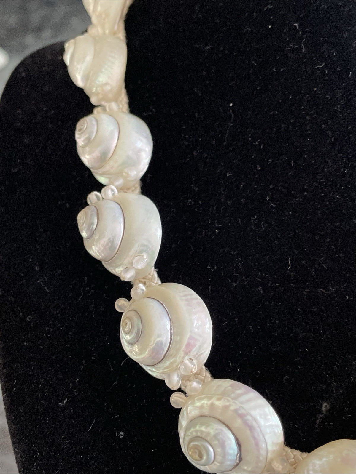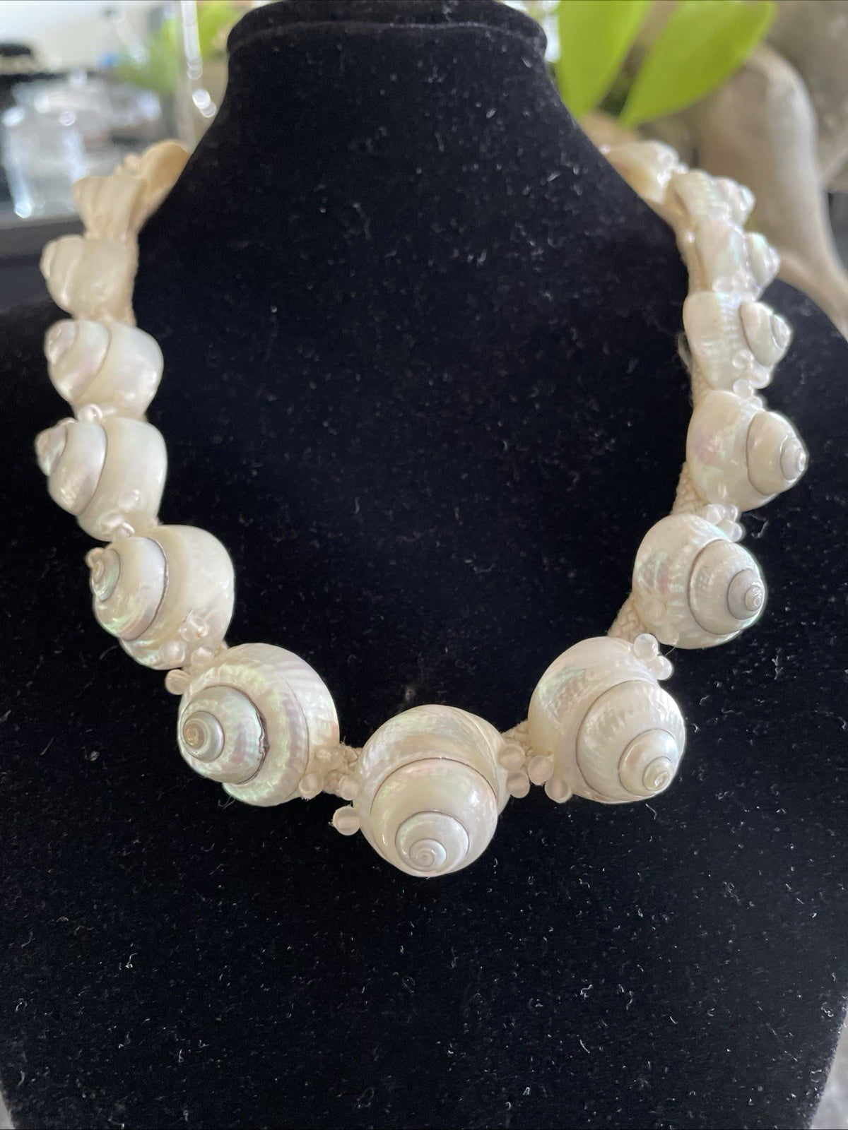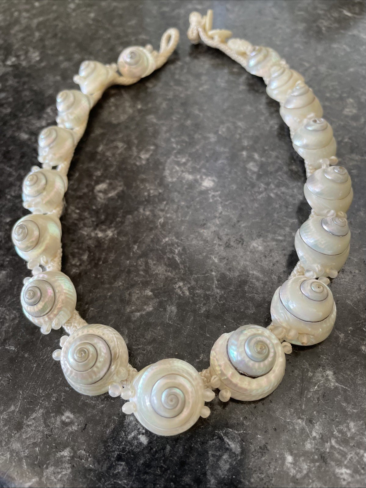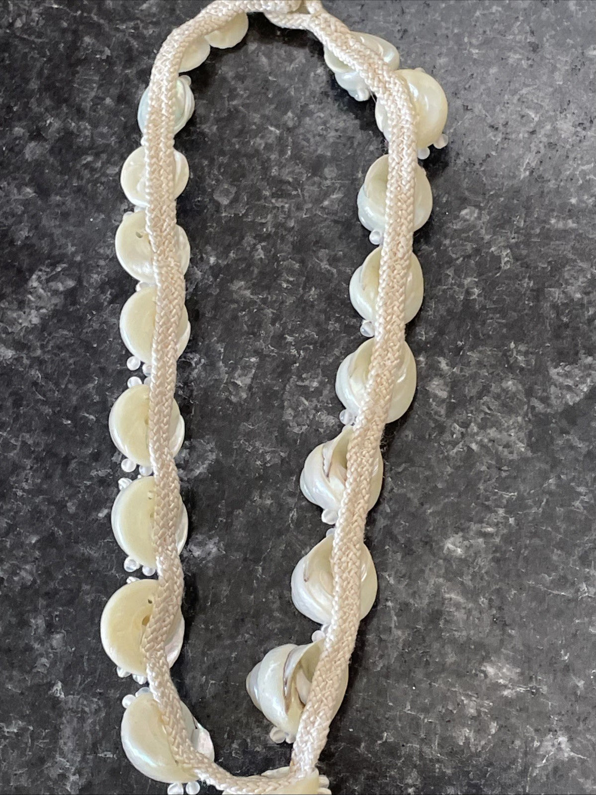 Mother of pearl closure. Perfect for a tropical wedding or Hawaiian wedding necklace. Excellent condition.