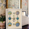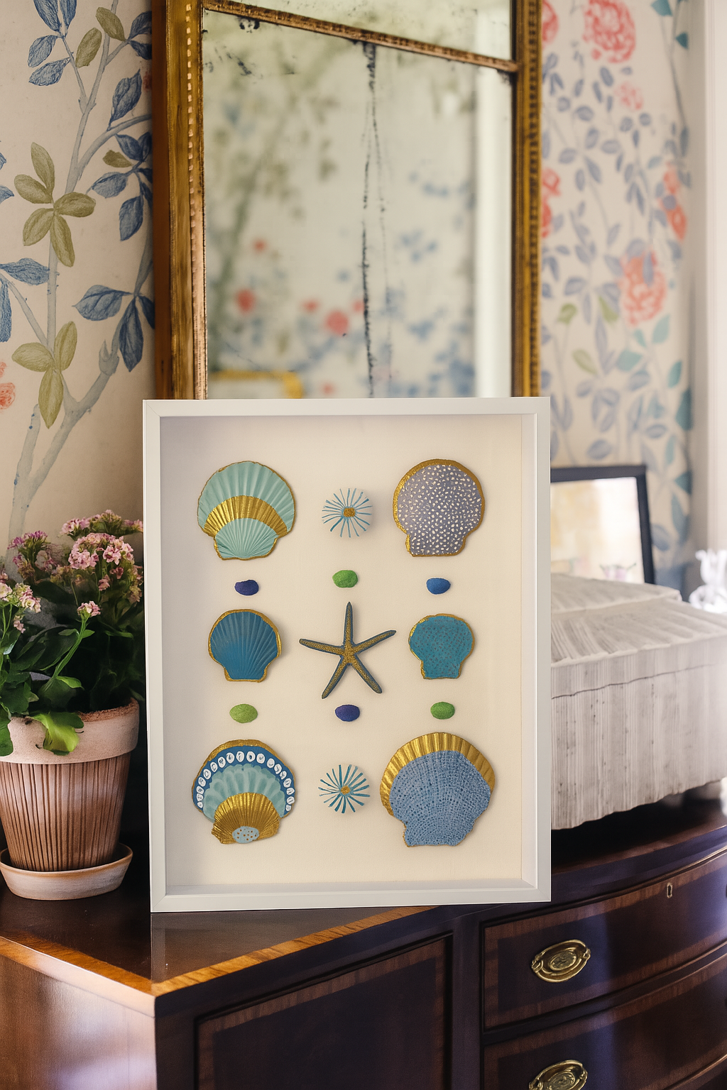 Hand painted shells arranged on canvas in a custom framed in a white frame.