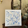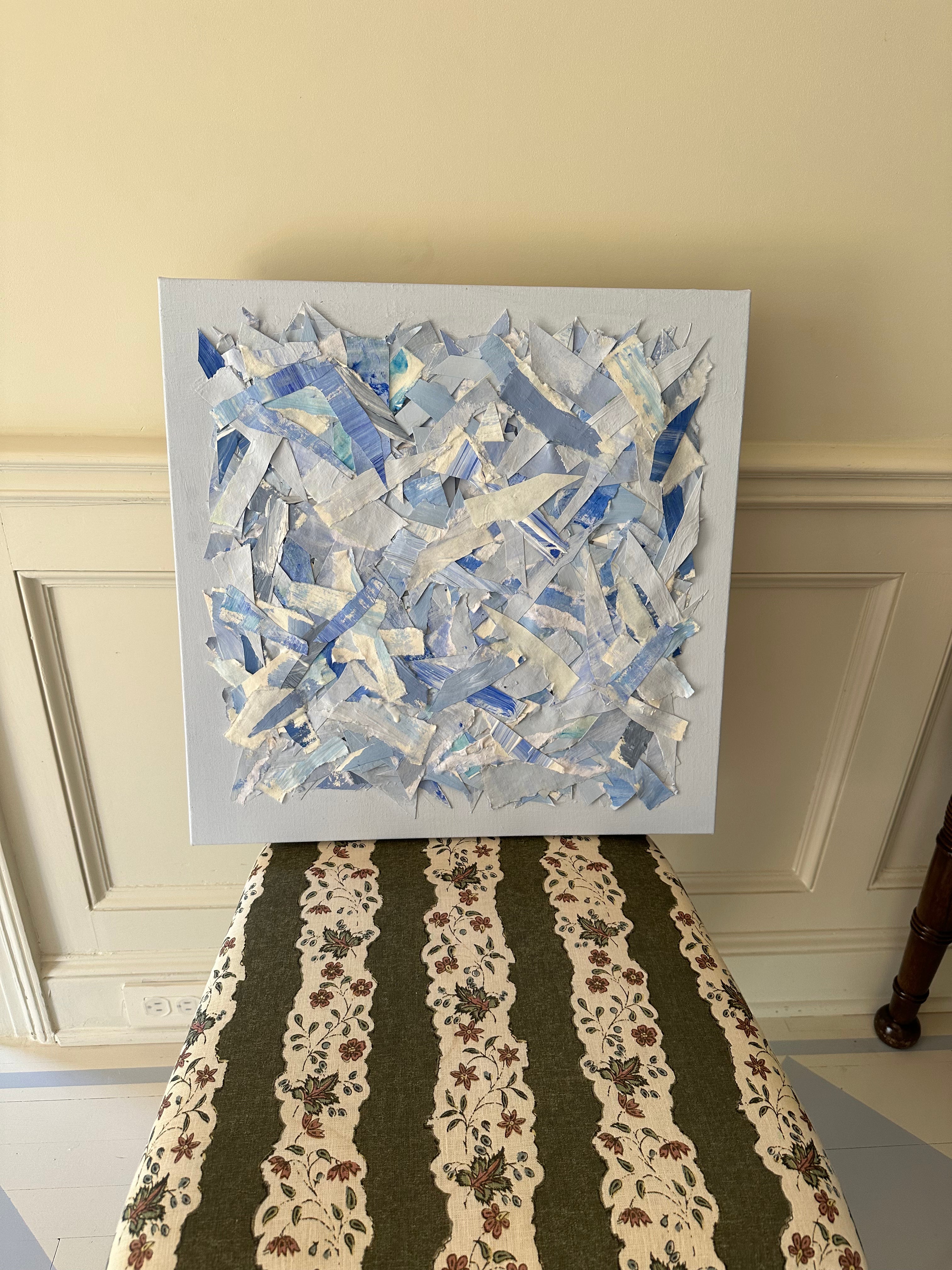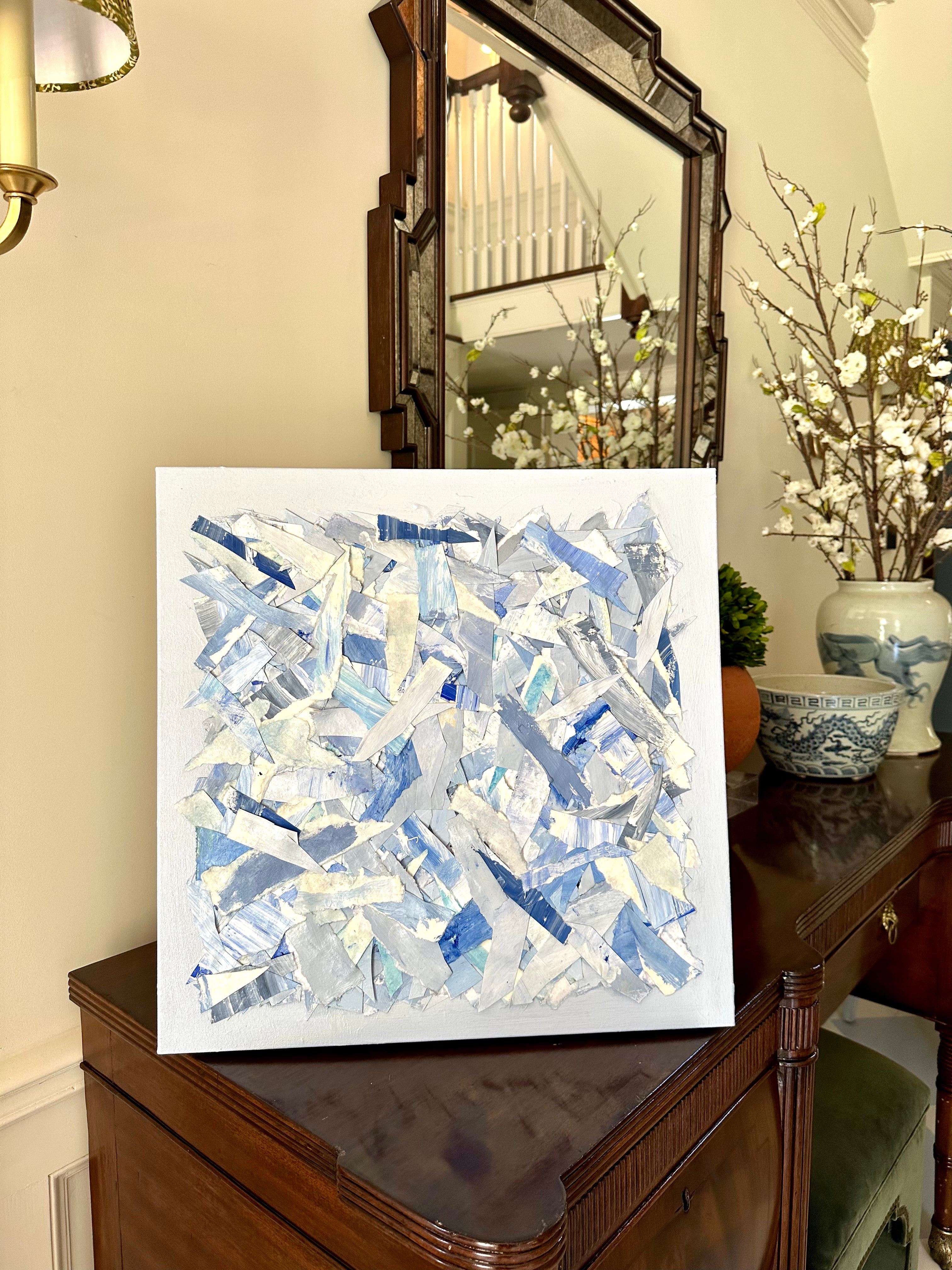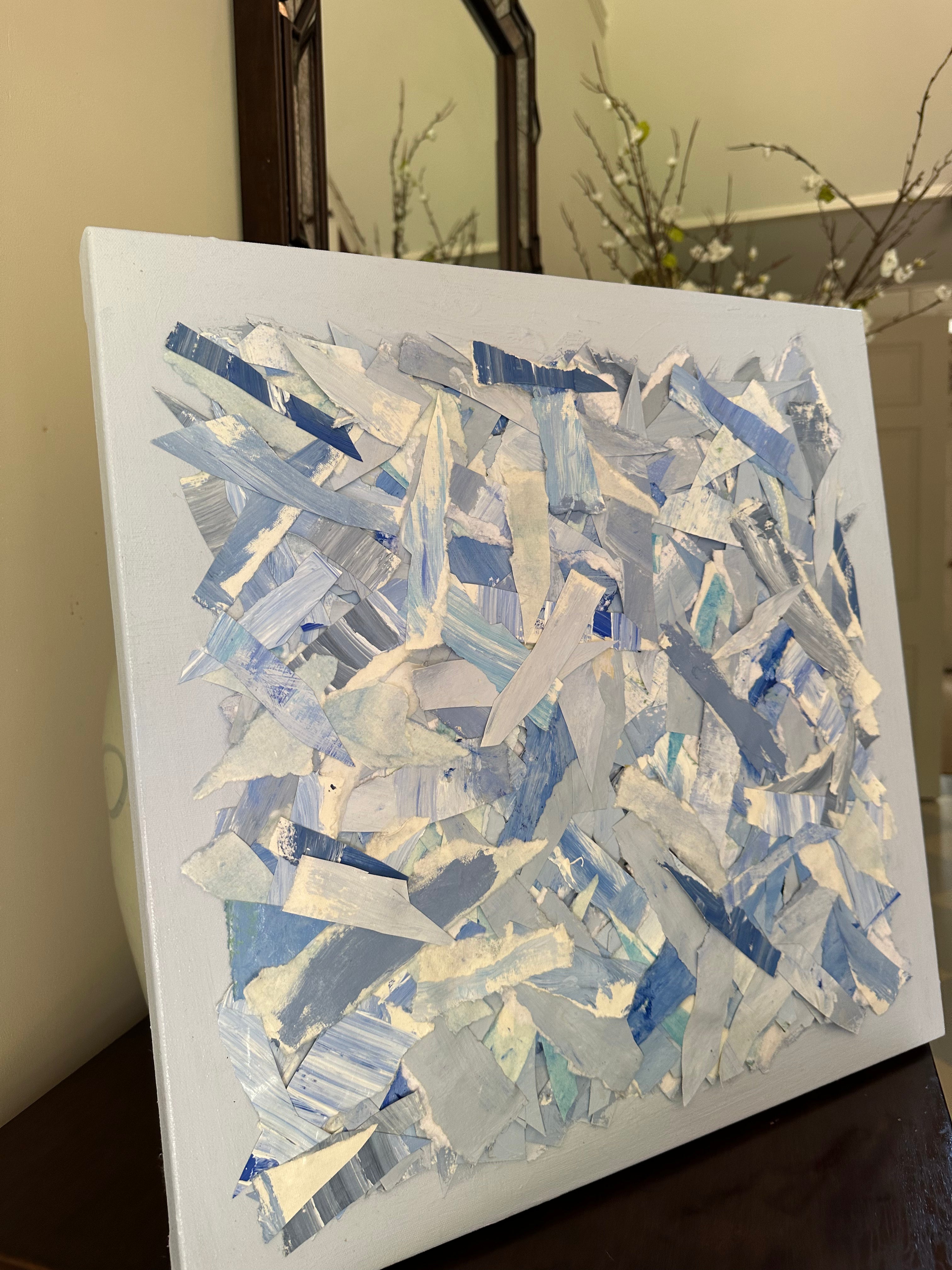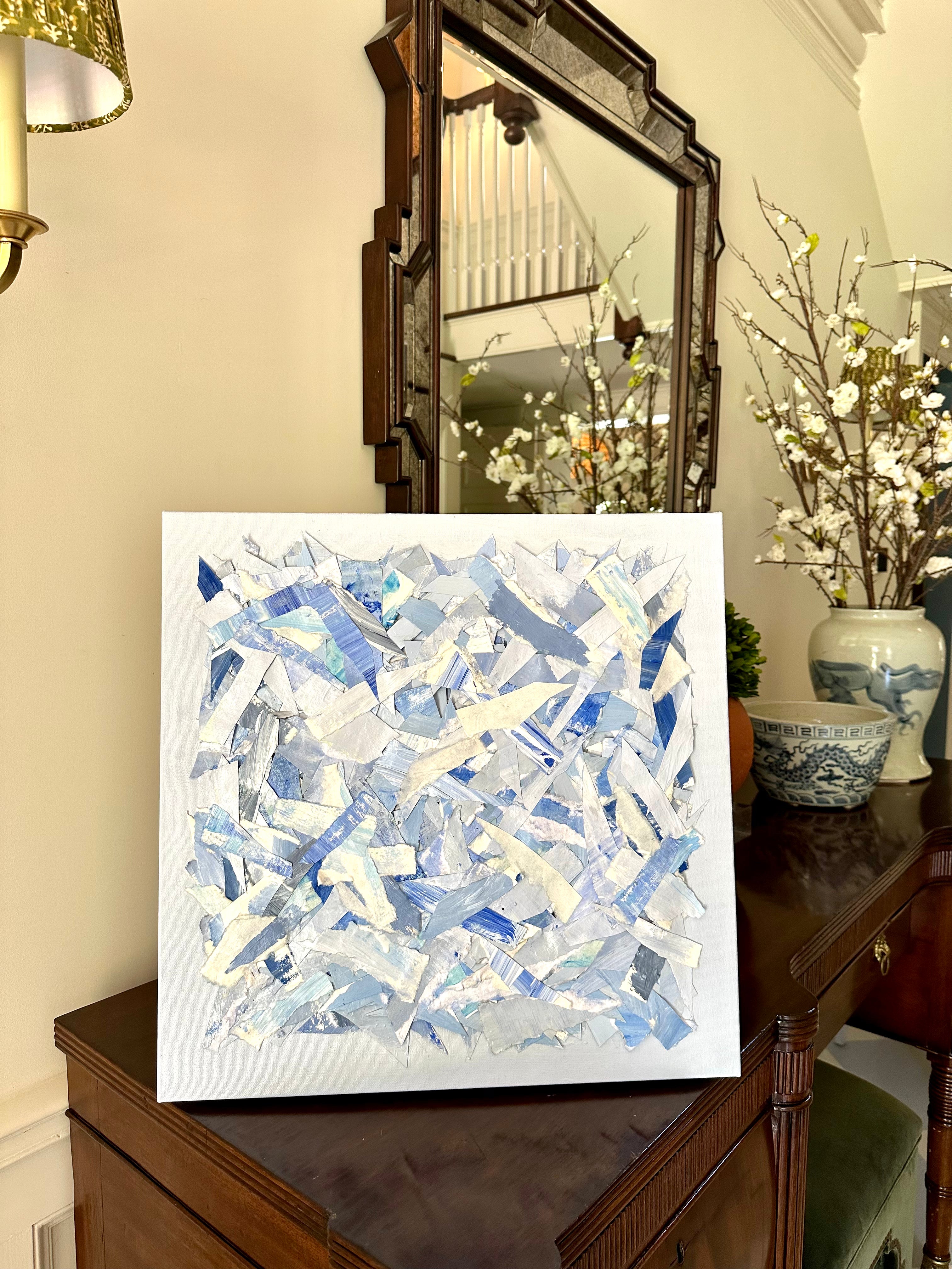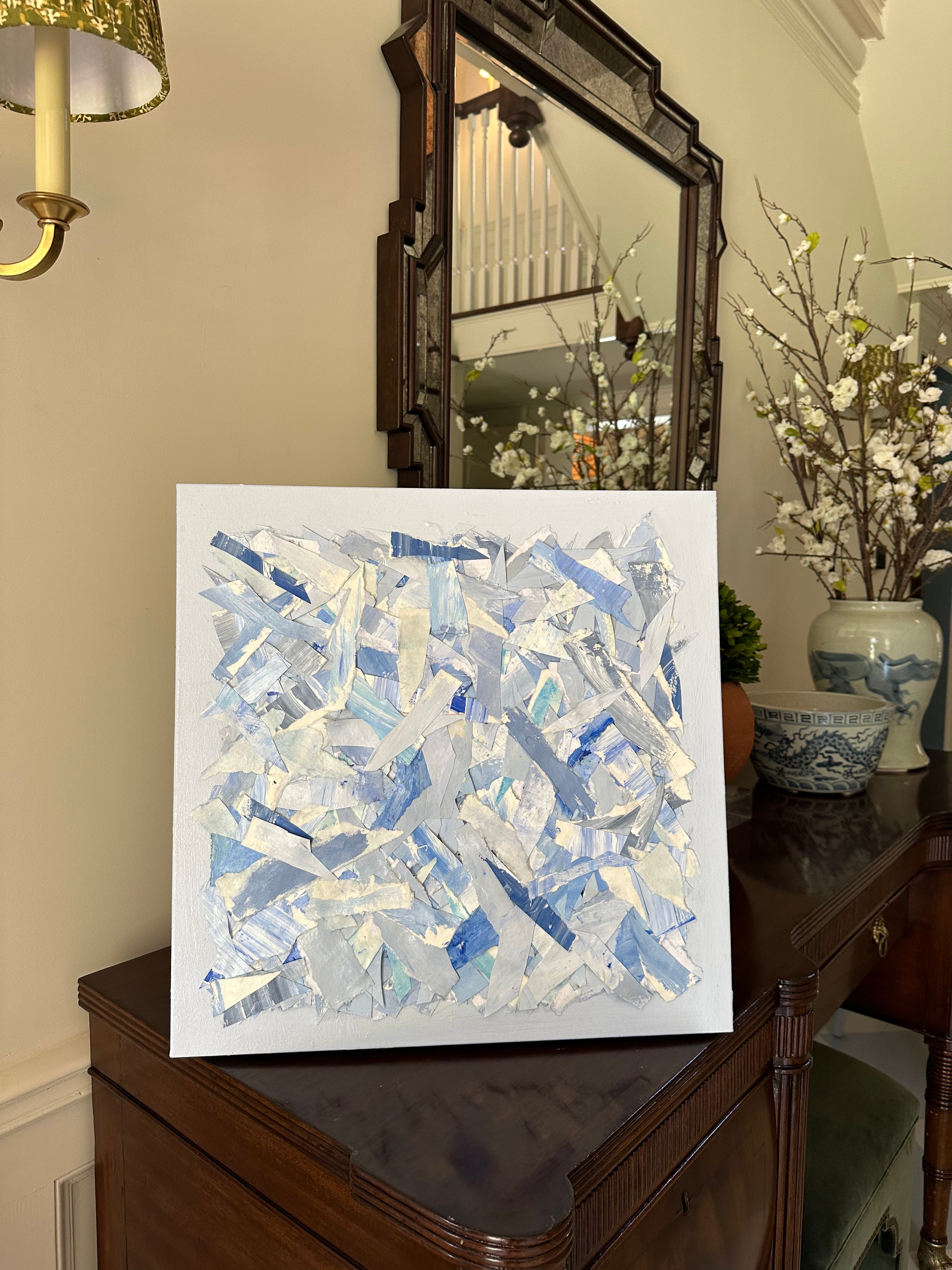 20x20 original painting. Mixed media collage on canvas. Can be hung horizontally or vertically. This piece has hundreds of torn and cut shreds of paper on top of it. From watercolor paper to handmade paper to other materials, this layered collage makes an impact based on its layers alone. The background color is a light blue with a soft grey undertone. Unframed. A white, gold or silver float frame is available for an additional $500. Signed by artist on the back of painting.