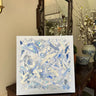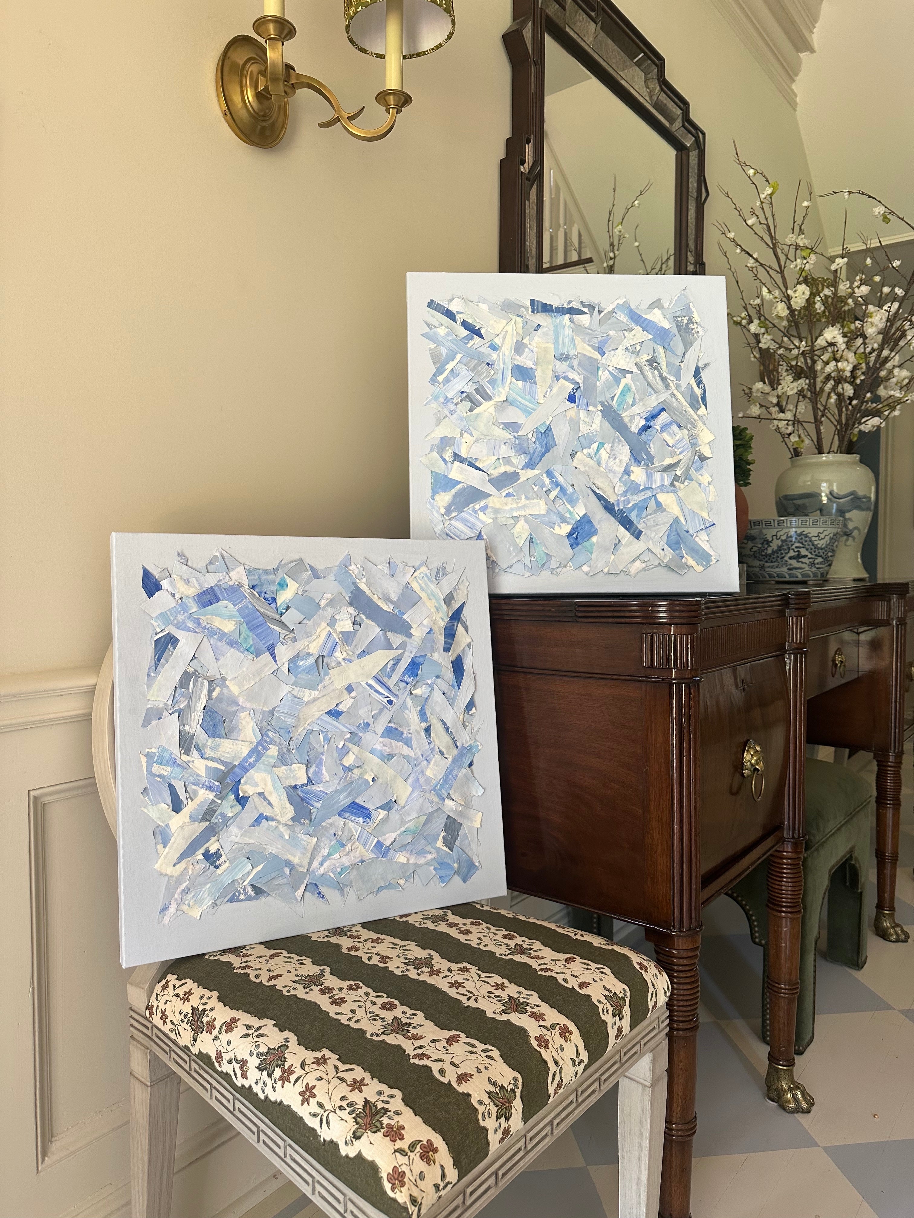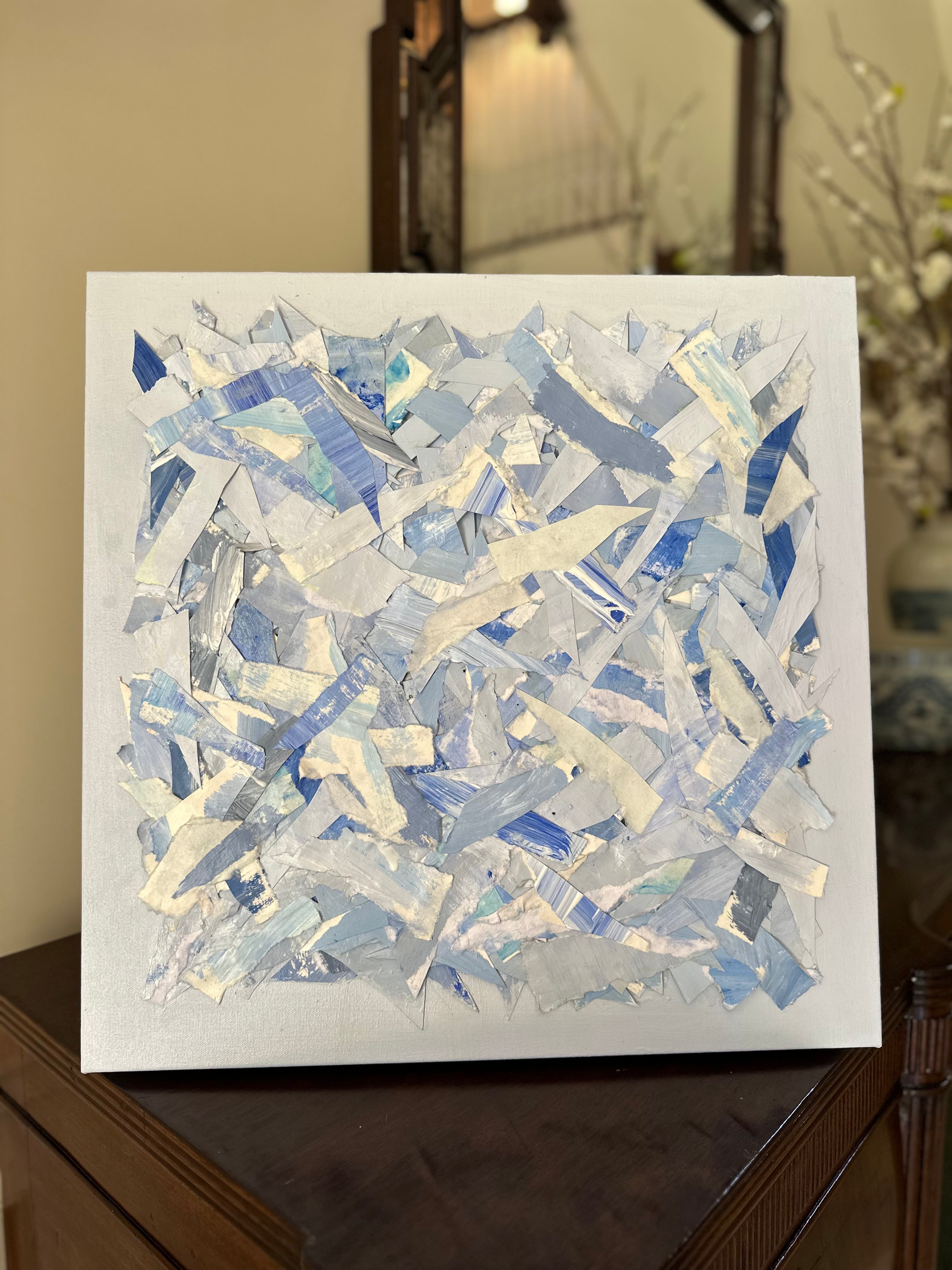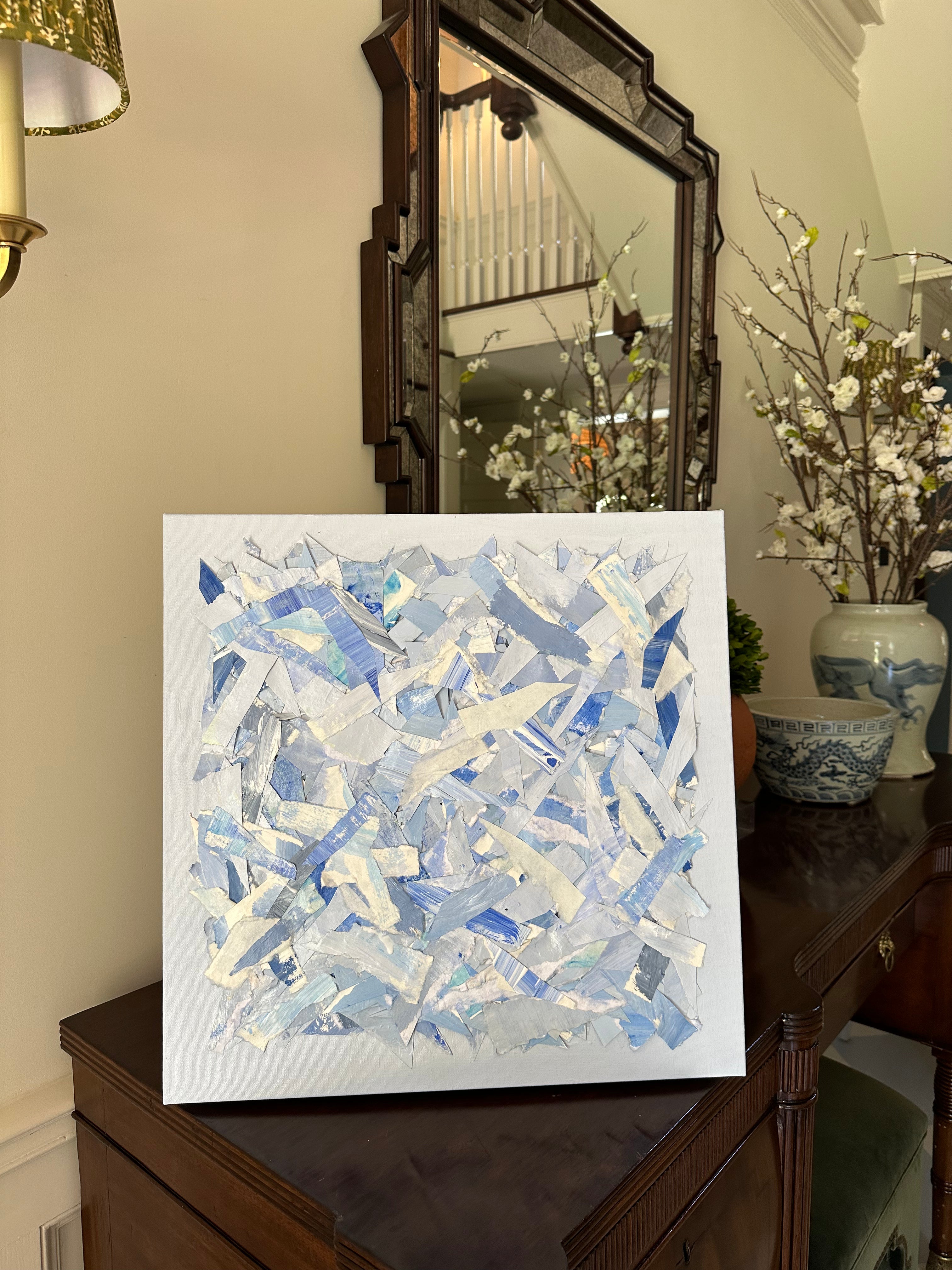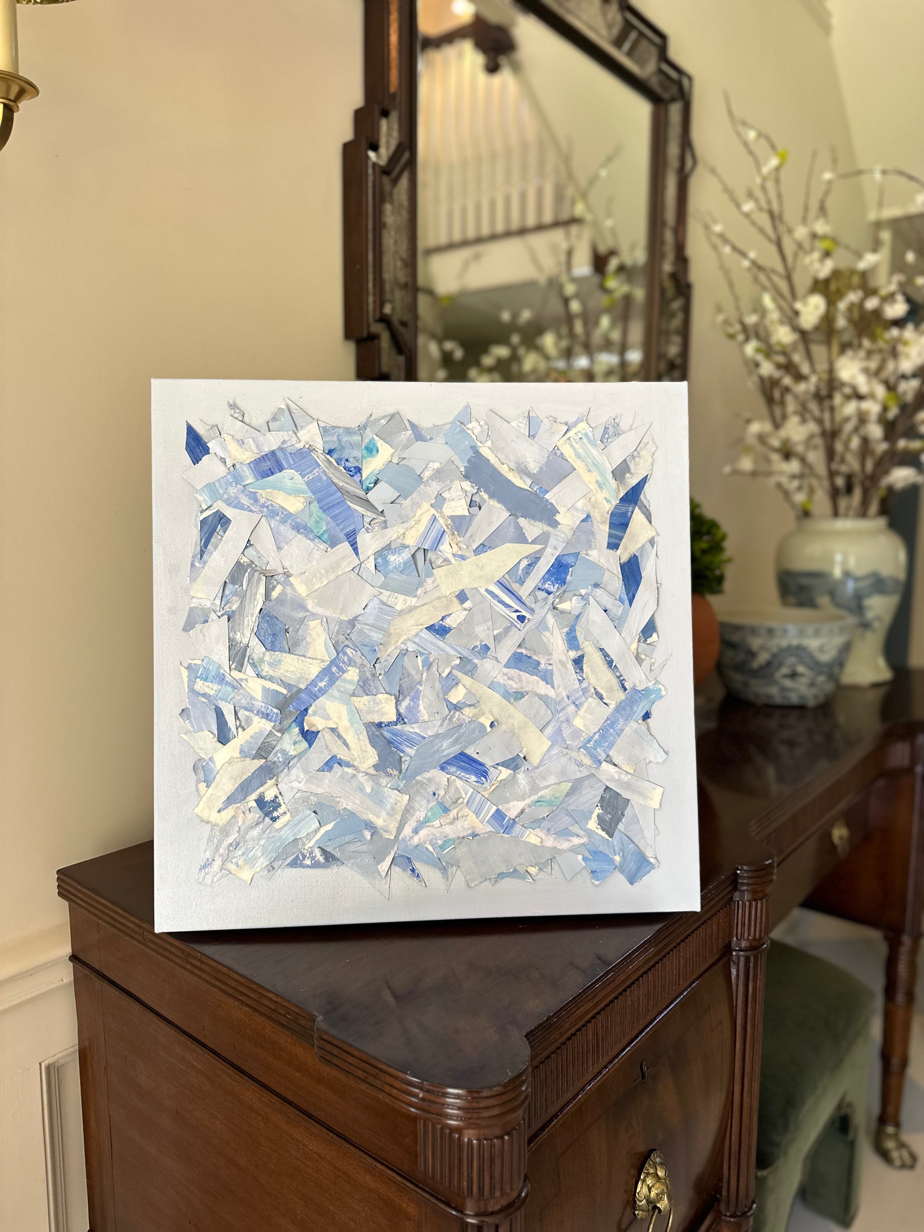 20x20 original painting. Mixed media collage on canvas. Can be hung horizontally or vertically. This piece has hundreds of torn and cut shreds of paper on top of it. From watercolor paper to handmade paper to other materials, this layered collage makes an impact based on its layers alone. The background color is a light blue with a soft grey undertone. Unframed. A white, gold or silver float frame is available for an additional $400. Signed by artist on the back of painting.