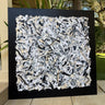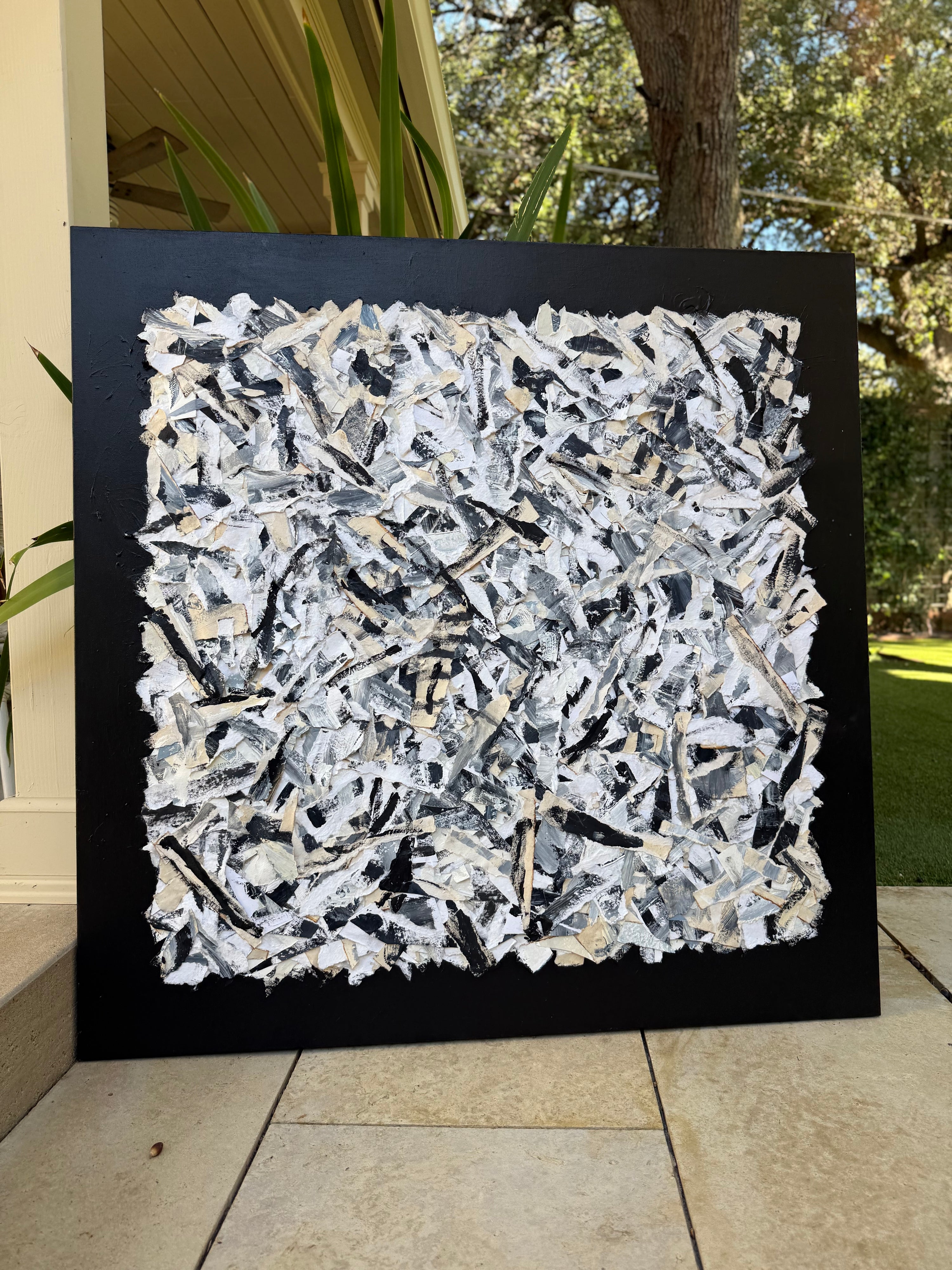 48x48 collaged canvas, layered with strips of cut and ripped paper artwork, all created by Erin Donahue Tice. Signed on the back of the canvas. Green background. Unframed.
