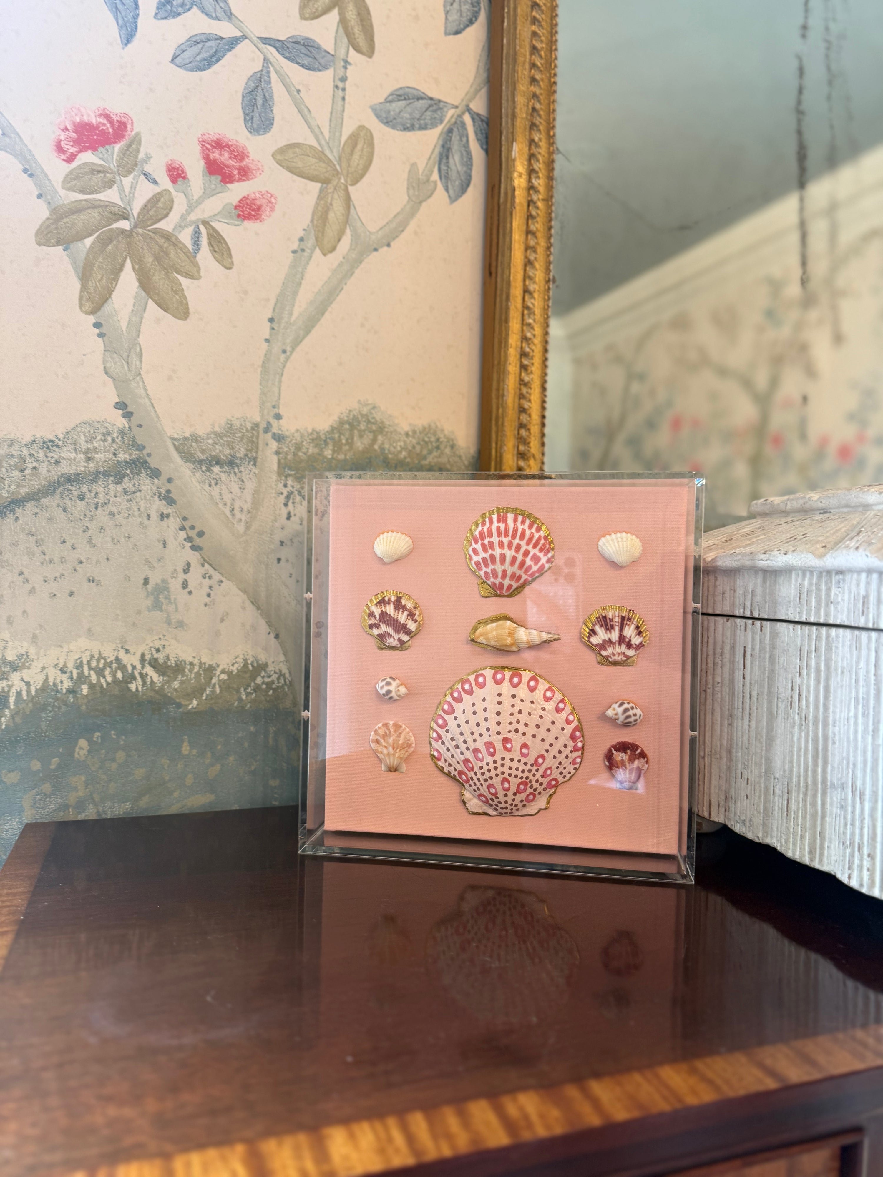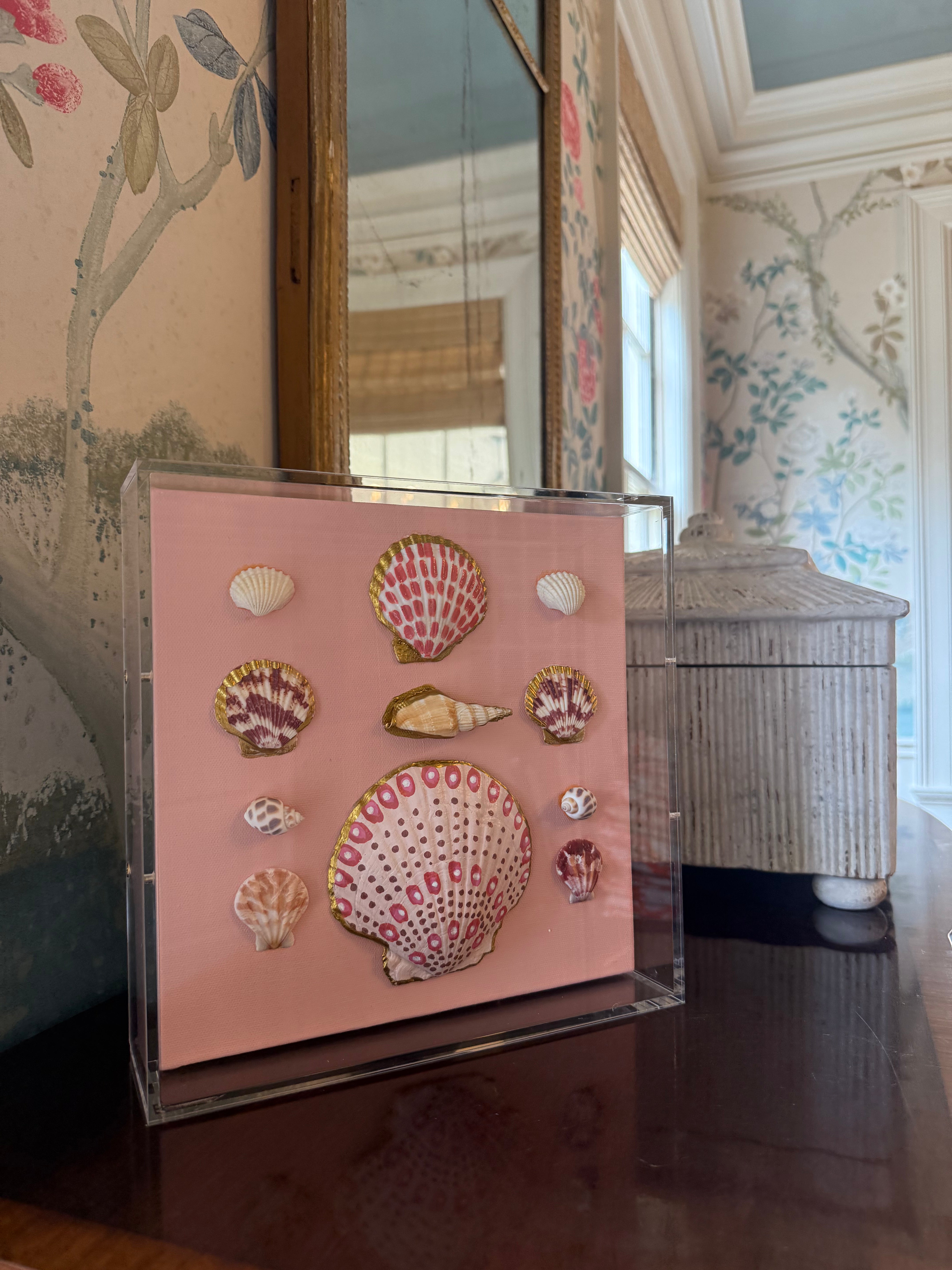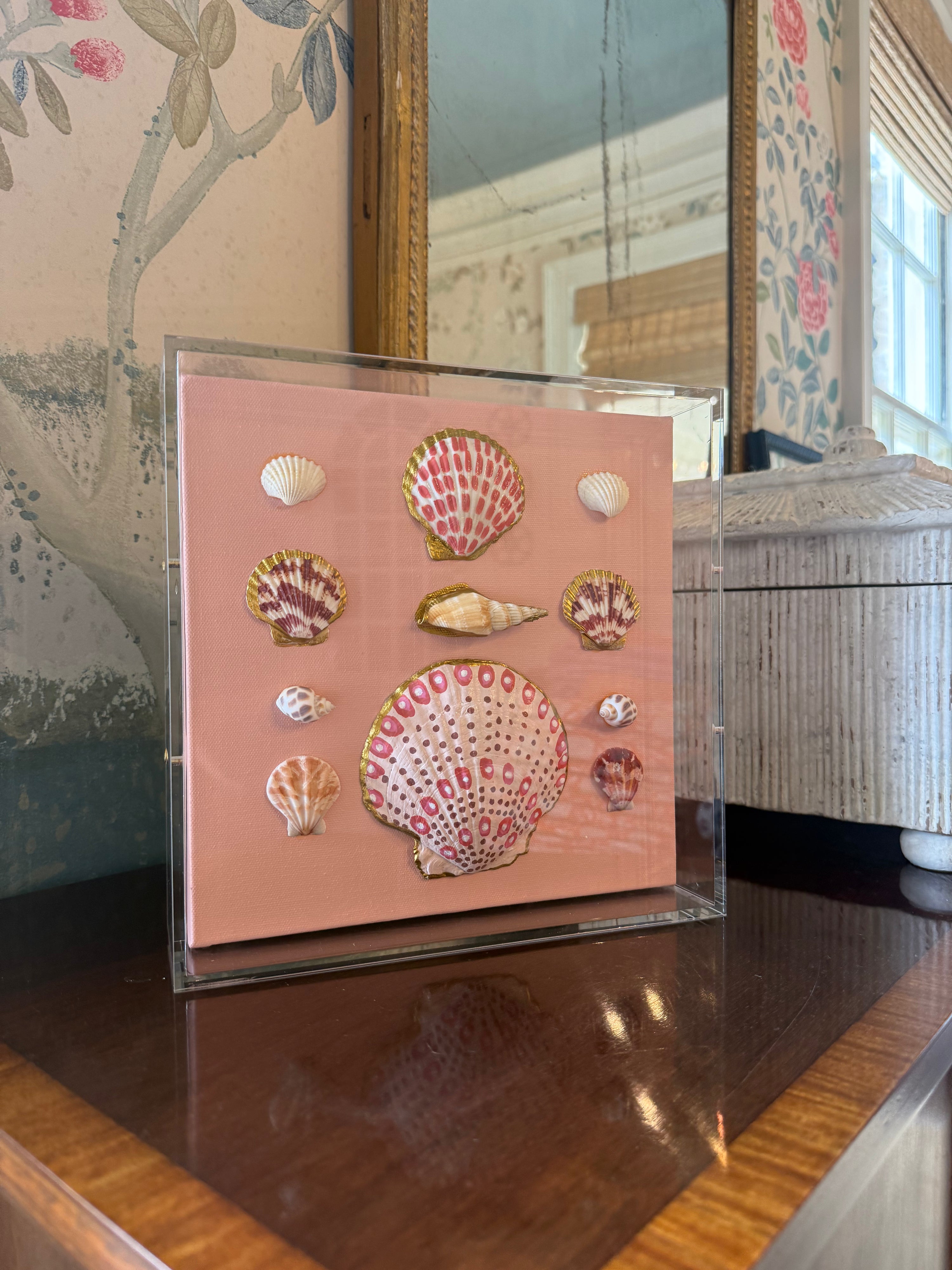 Hand painted shells arranged on canvas in a custom framed in a clear UV-protected acrylic box frame. 10x10.