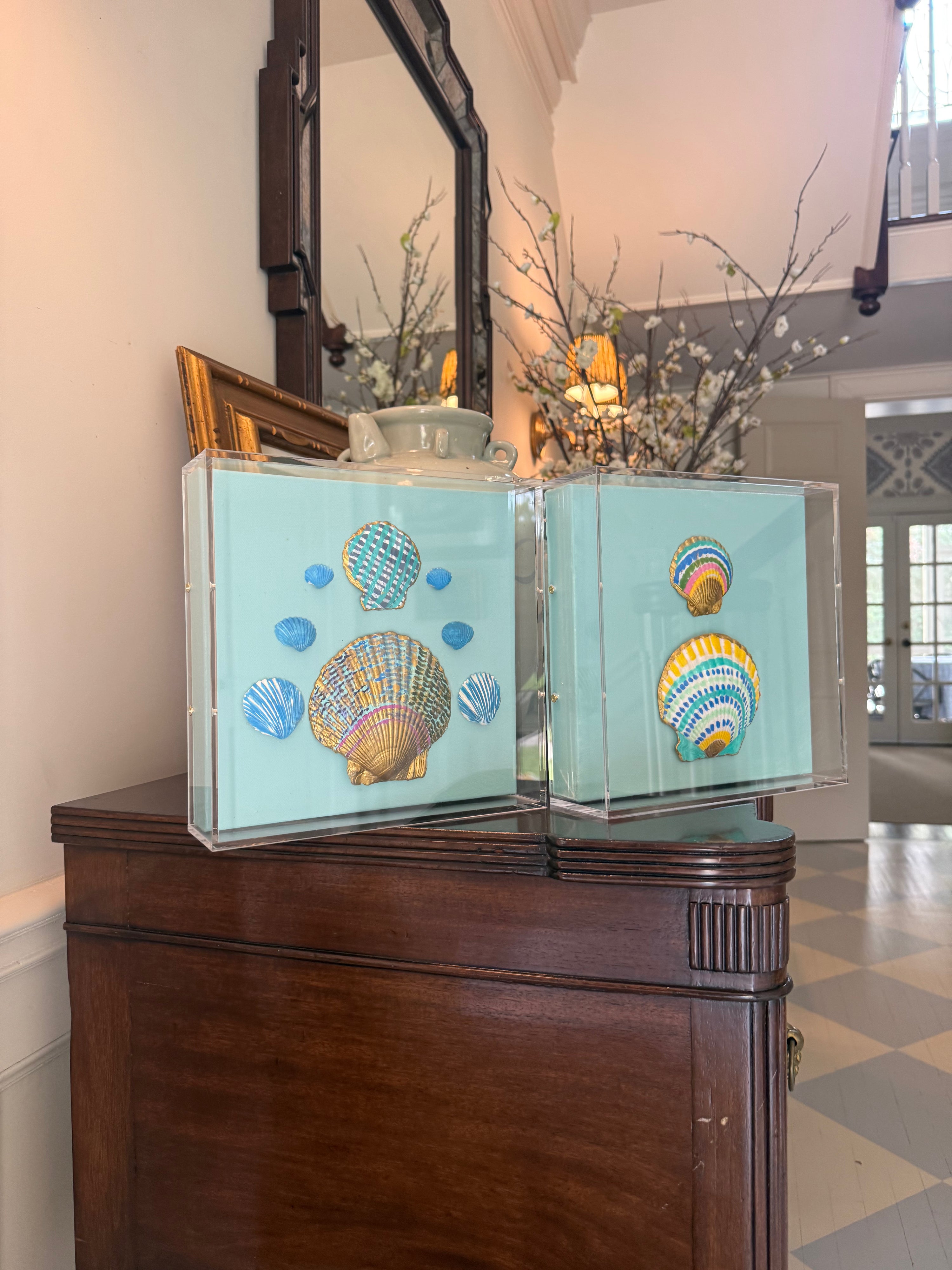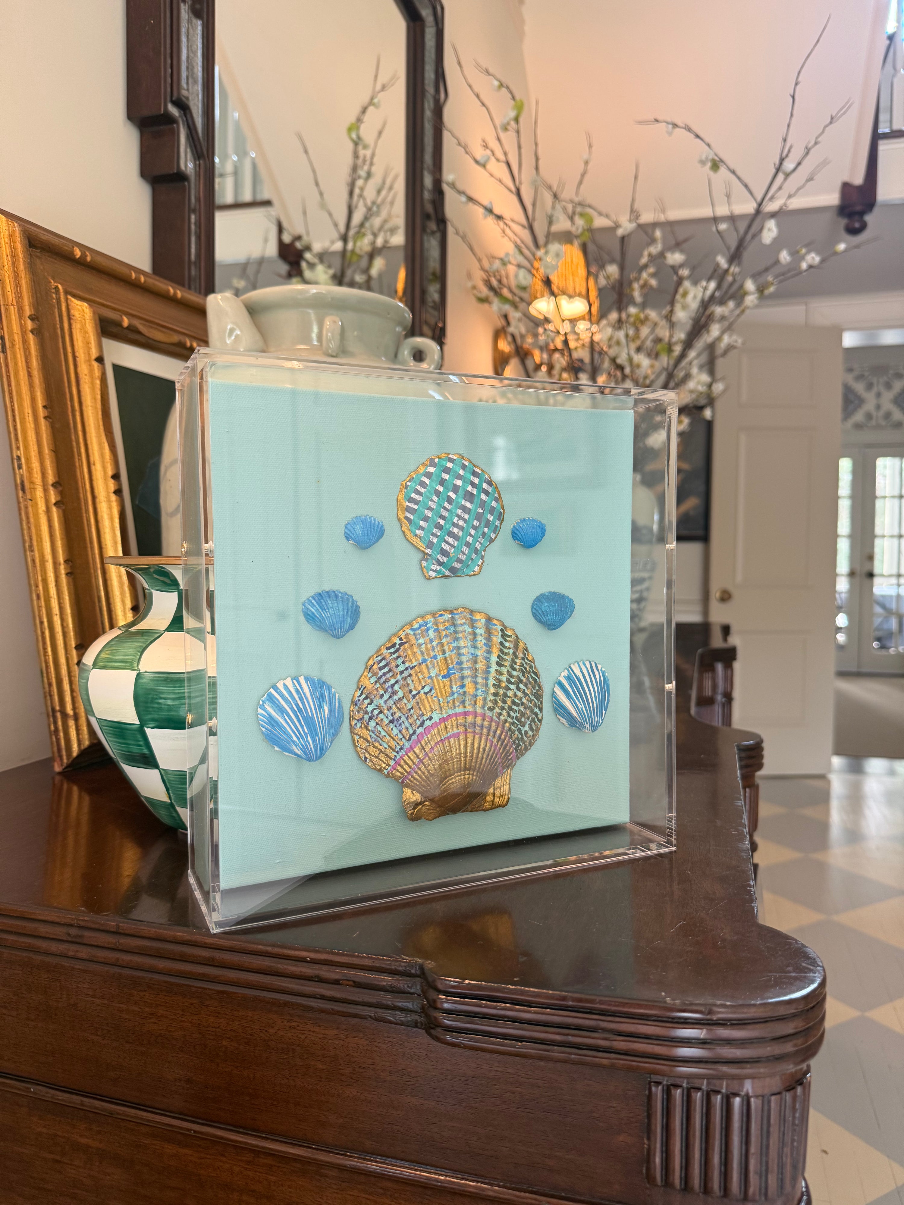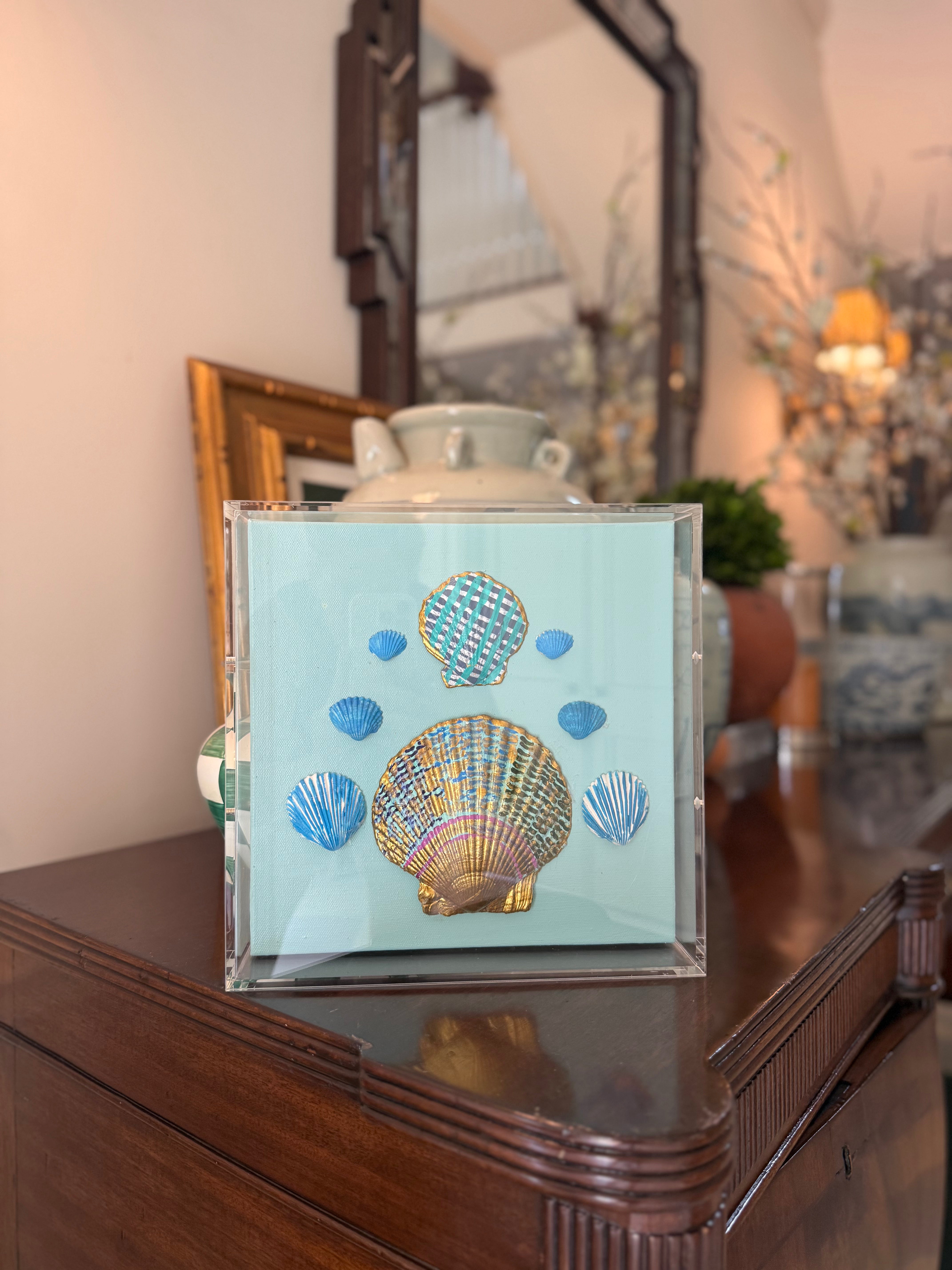 Hand painted shells arranged on canvas in a custom framed in a clear UV-protected acrylic box frame. 10x10.