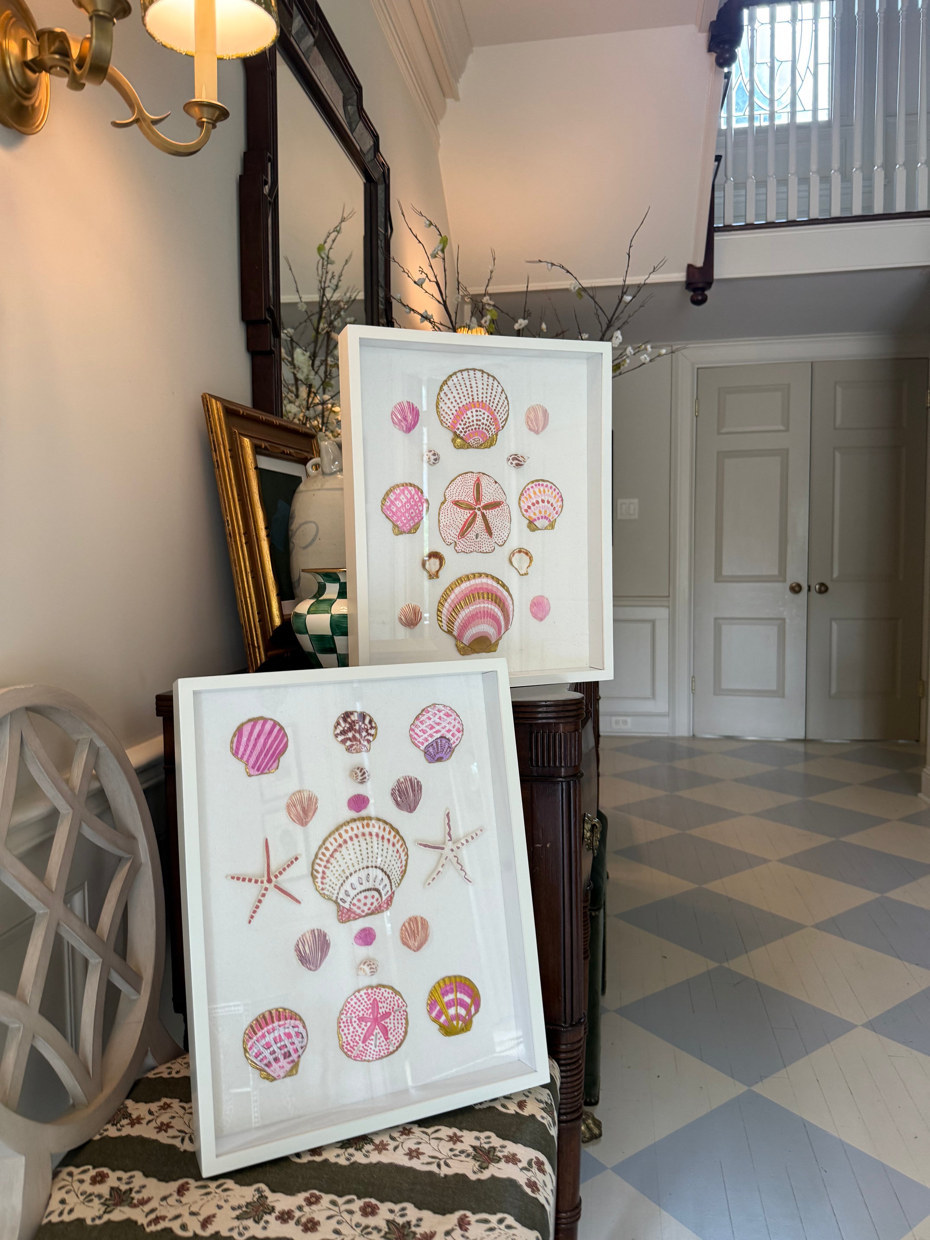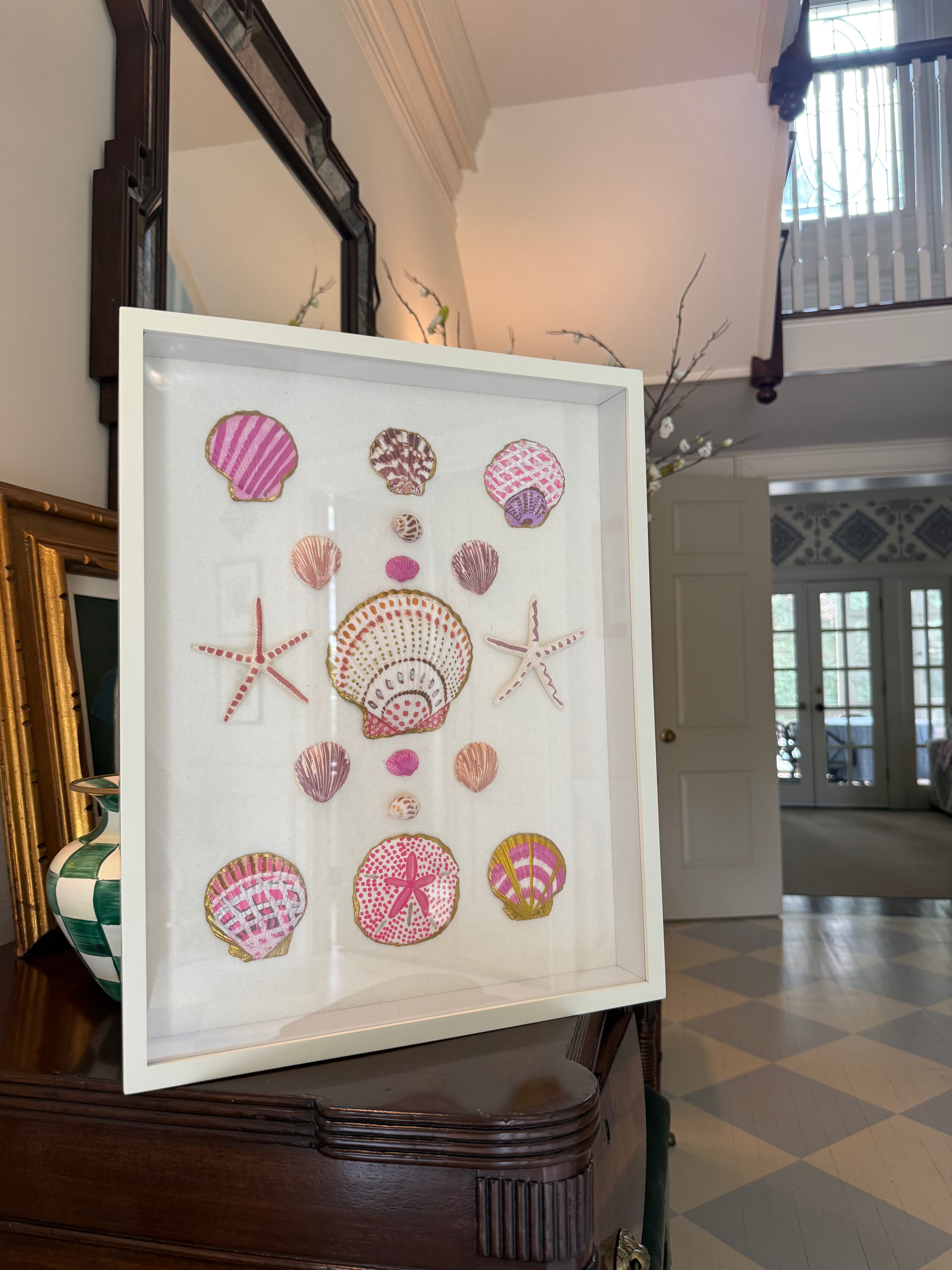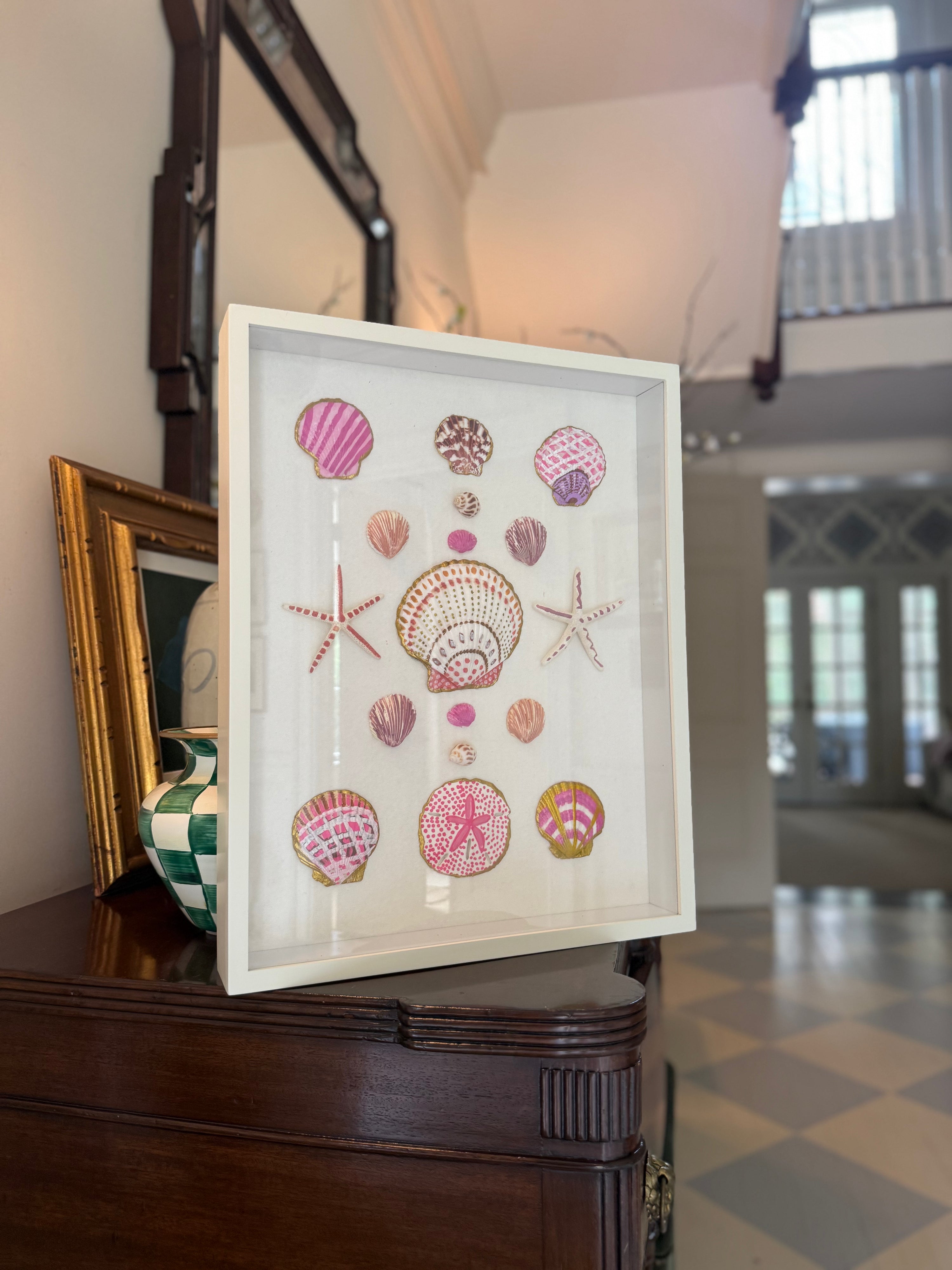 Hand painted shells arranged on canvas in a custom framed in a white frame.