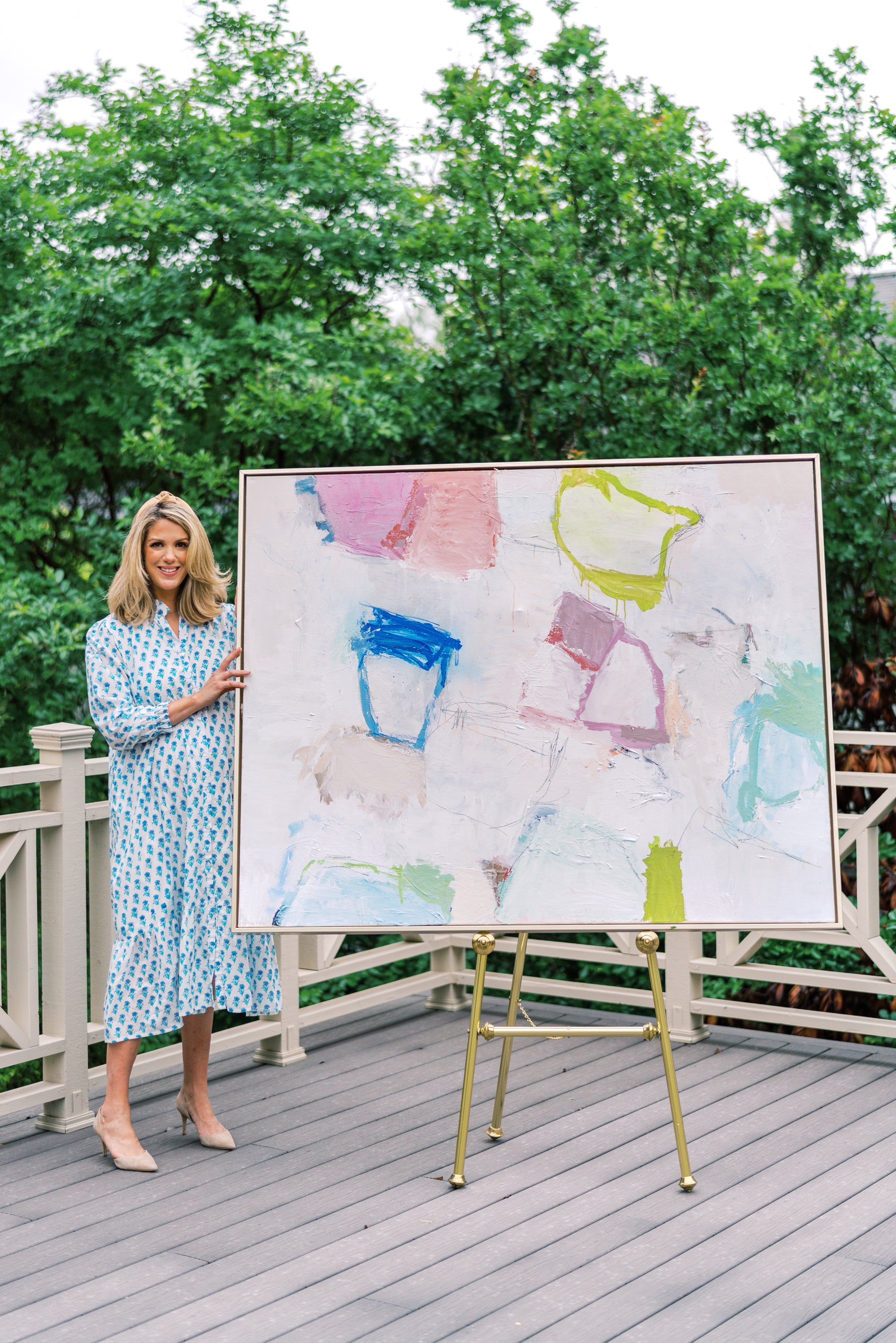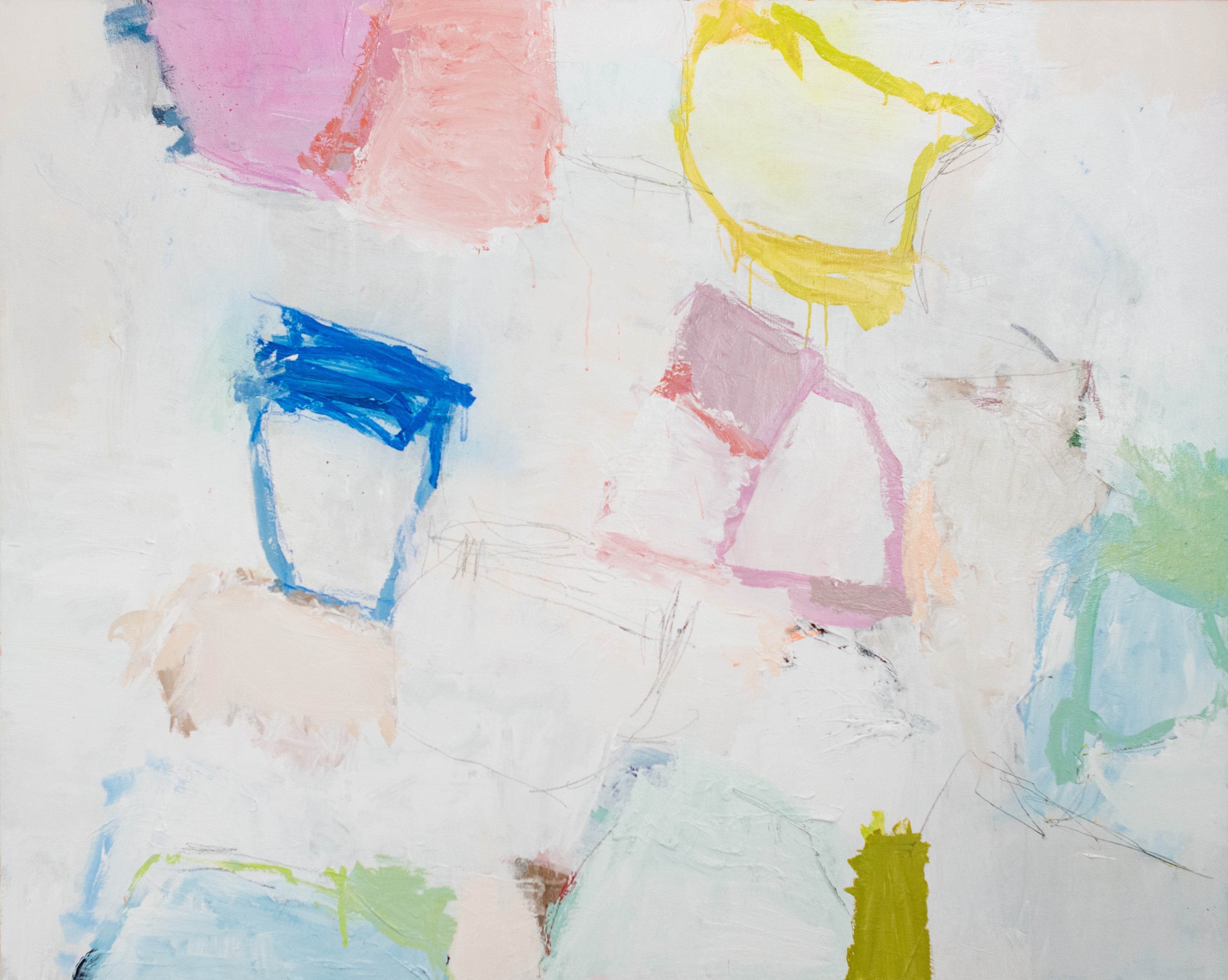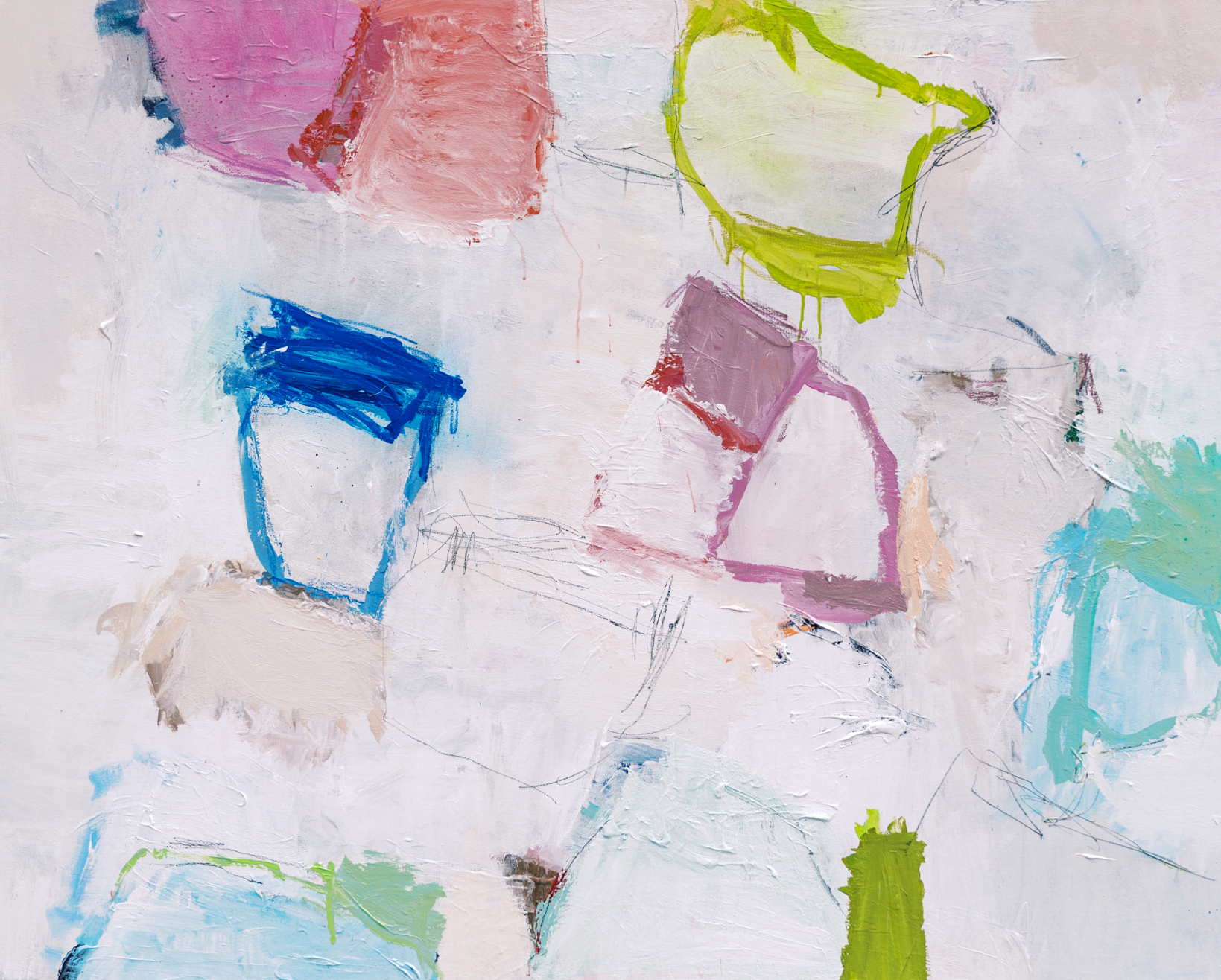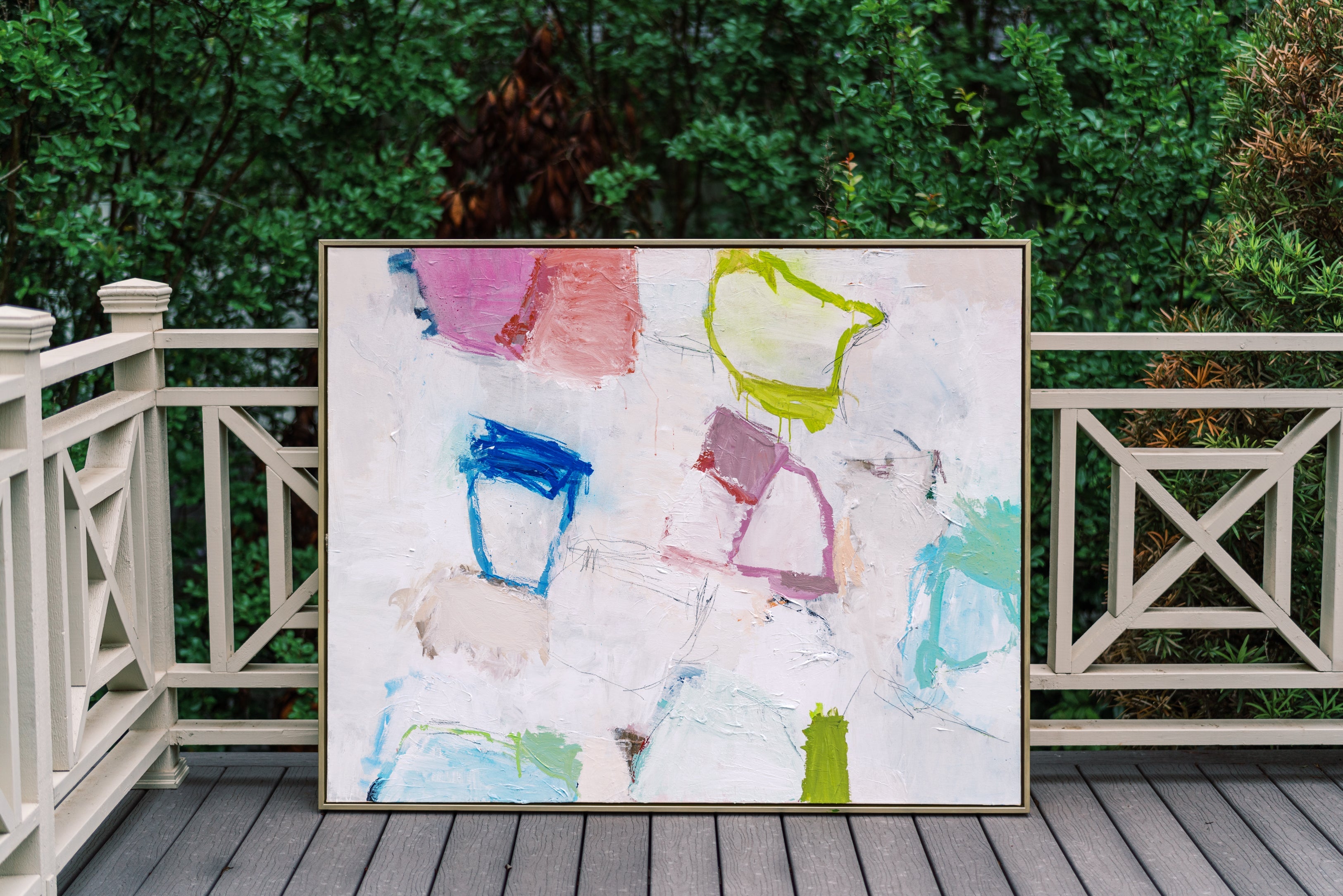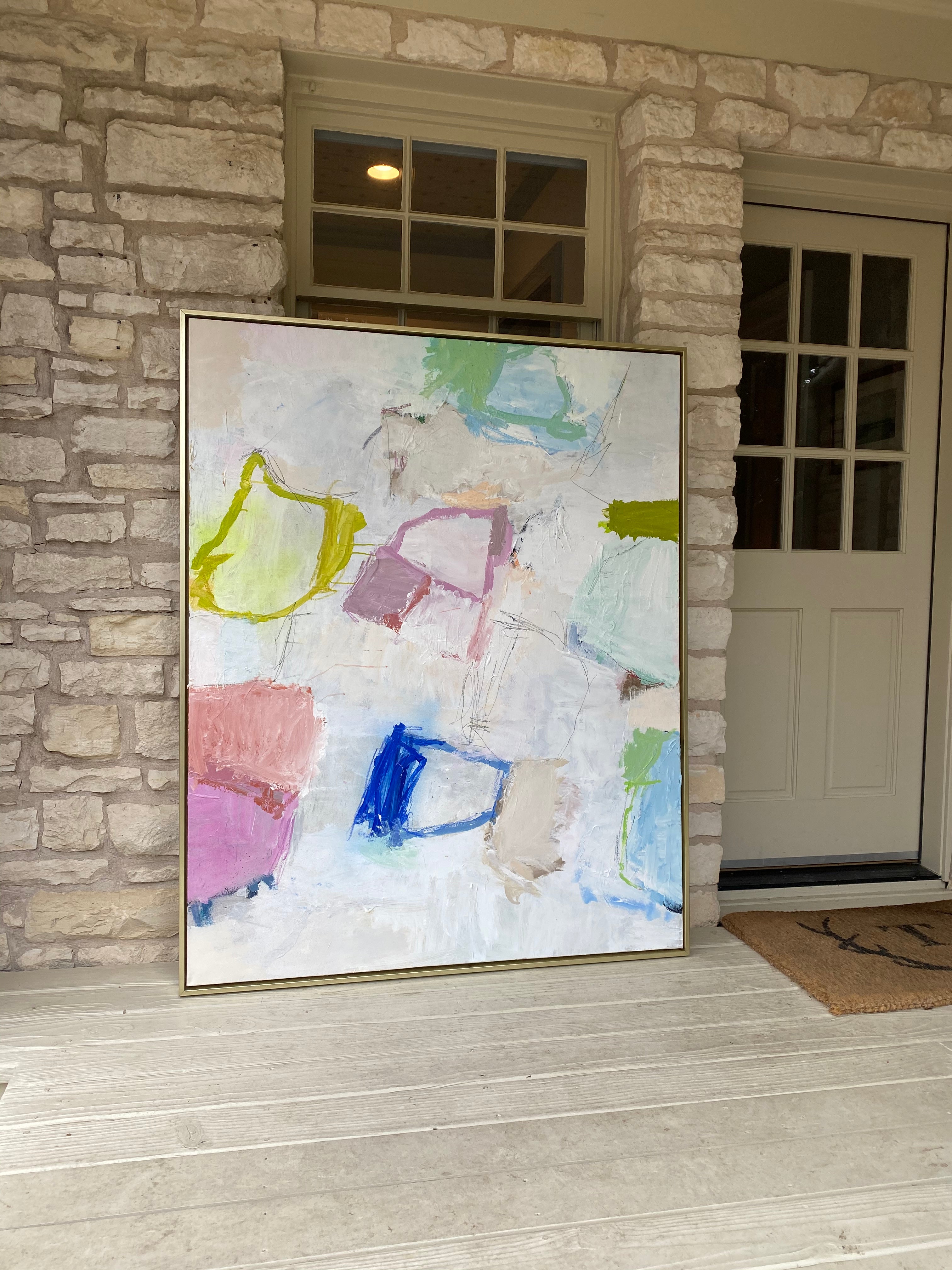 48x60 mixed media on canvas framed in champagne float frame. Acrylic, gouache, oil pastel and charcoal. Can be oriented and signed to hang horizontally or vertically.