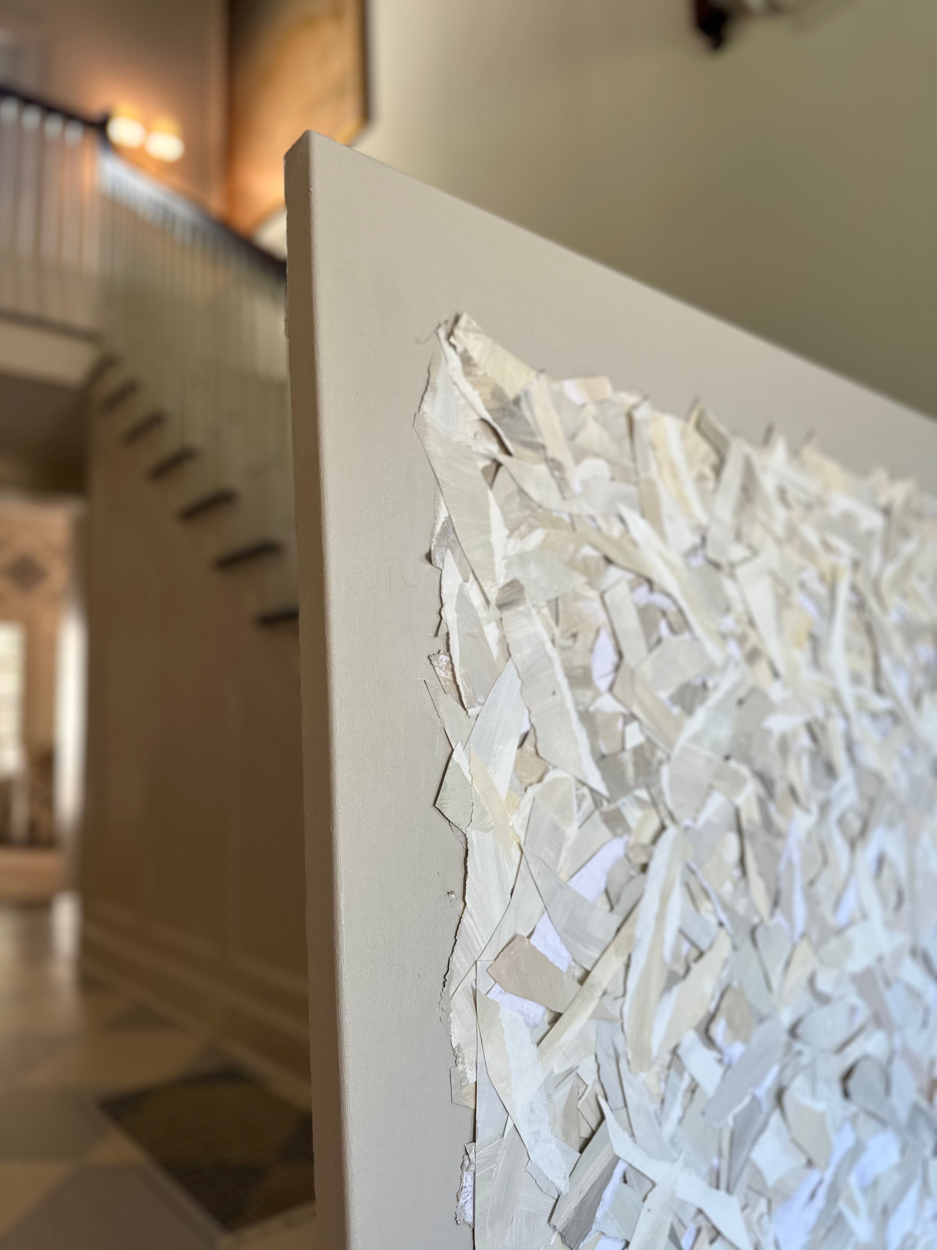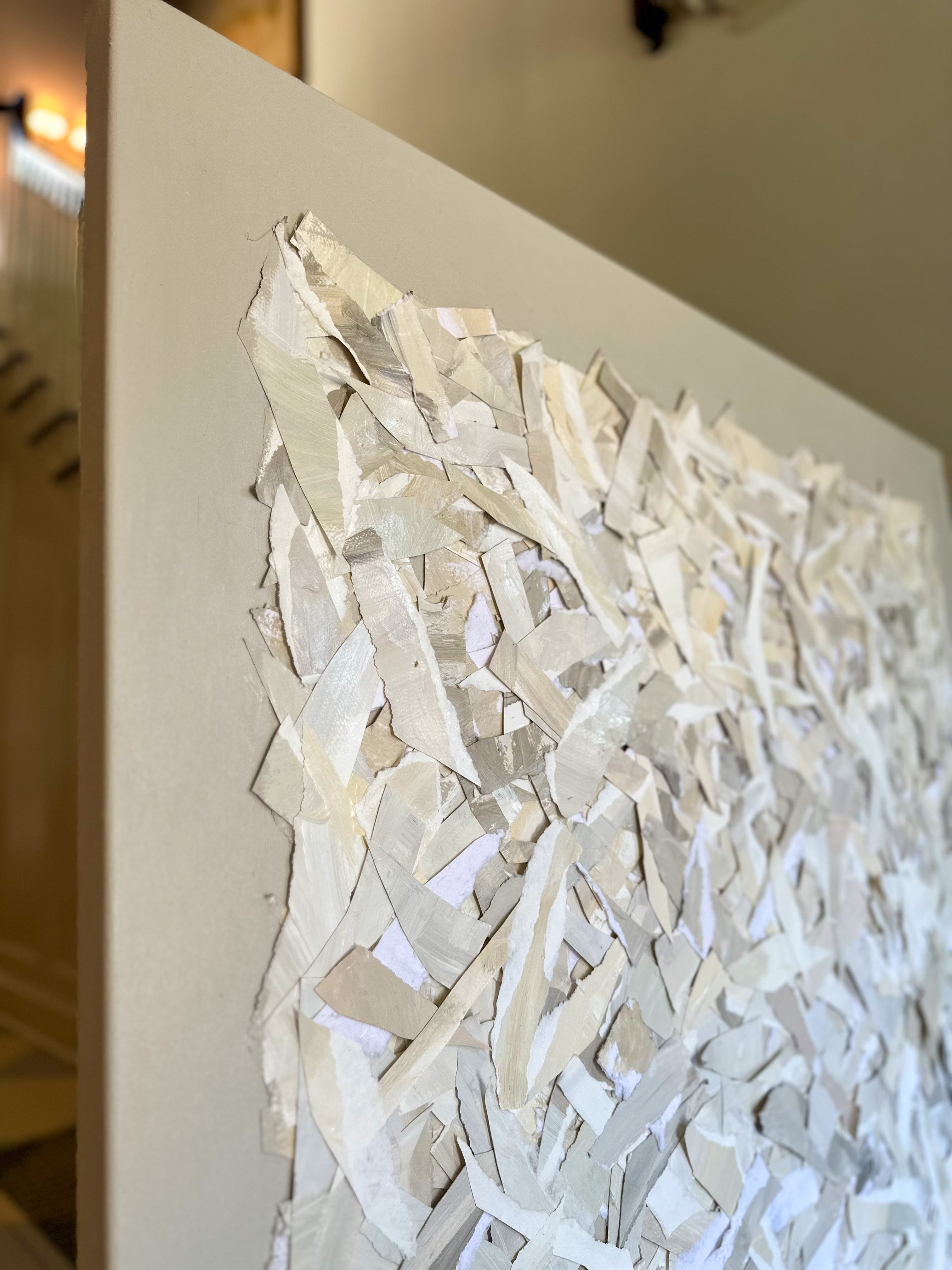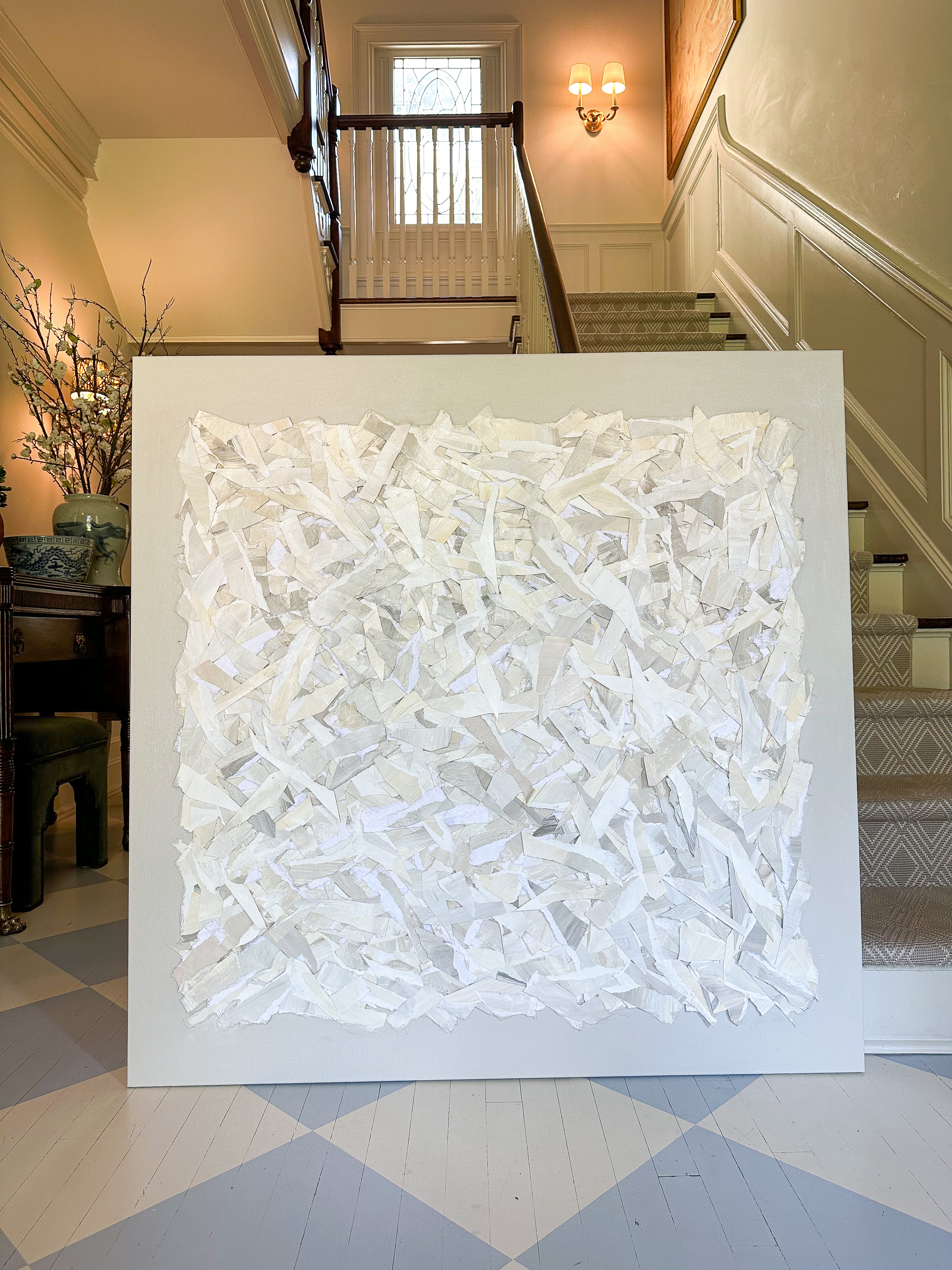 48x48 original painting. Mixed media collage on canvas. This piece has hundreds of torn and cut shreds of paper on top of it. From watercolor paper to handmade paper to other materials, this layered collage makes an impact based on its layers alone. The background color is a light taupe. Unframed. A white, gold or silver float frame is available for an additional $800. Signed by artist on the back of painting.