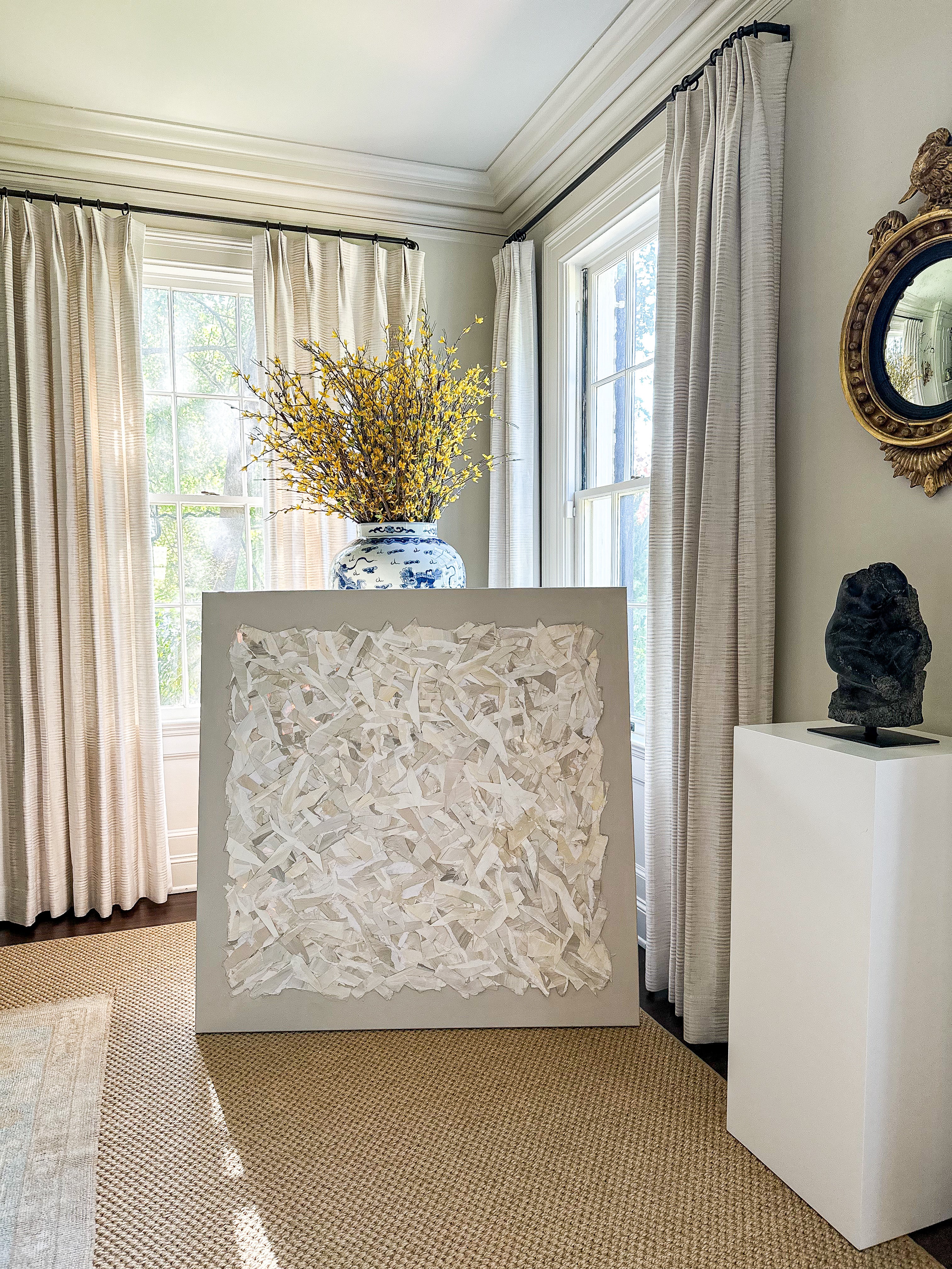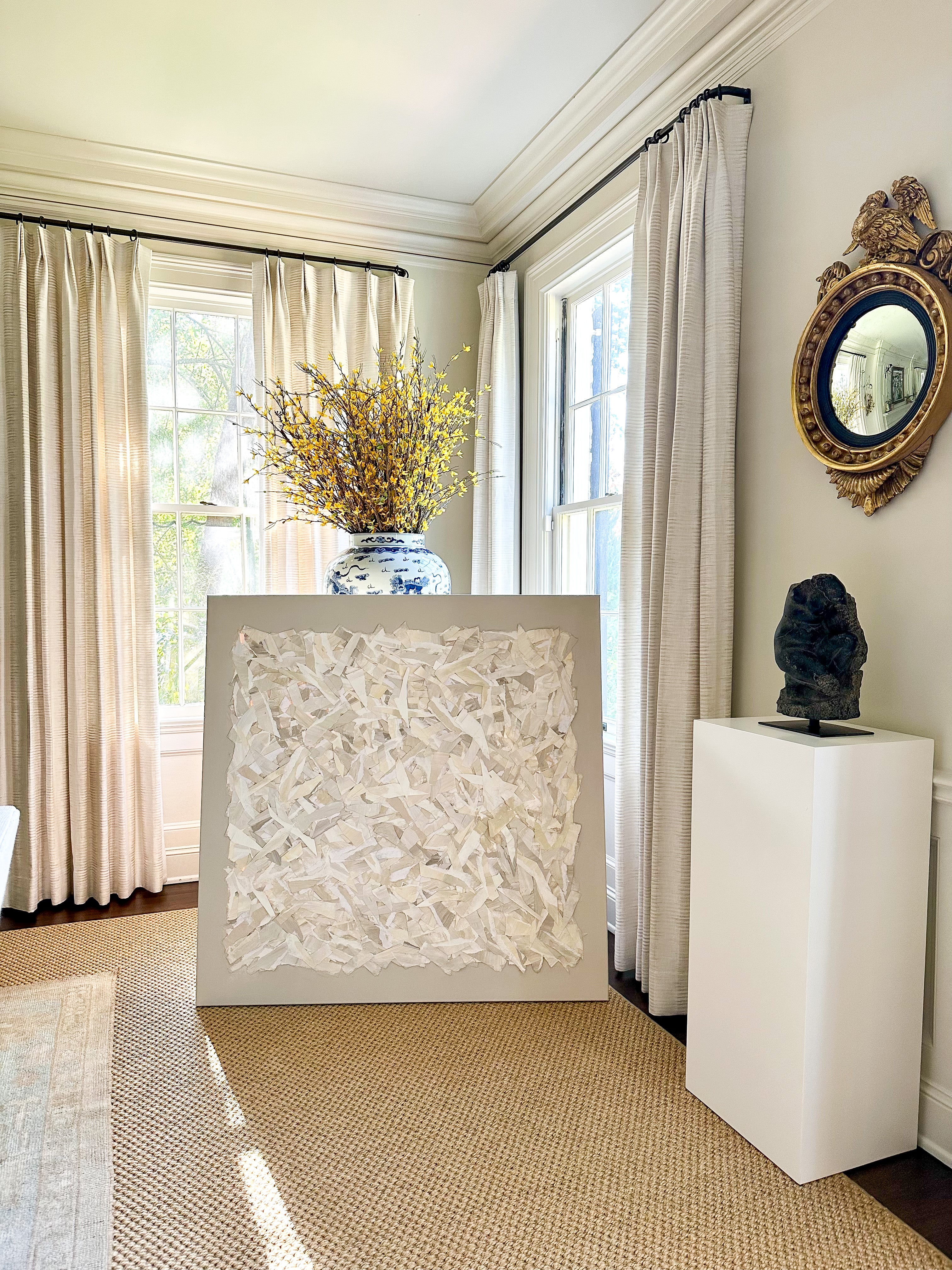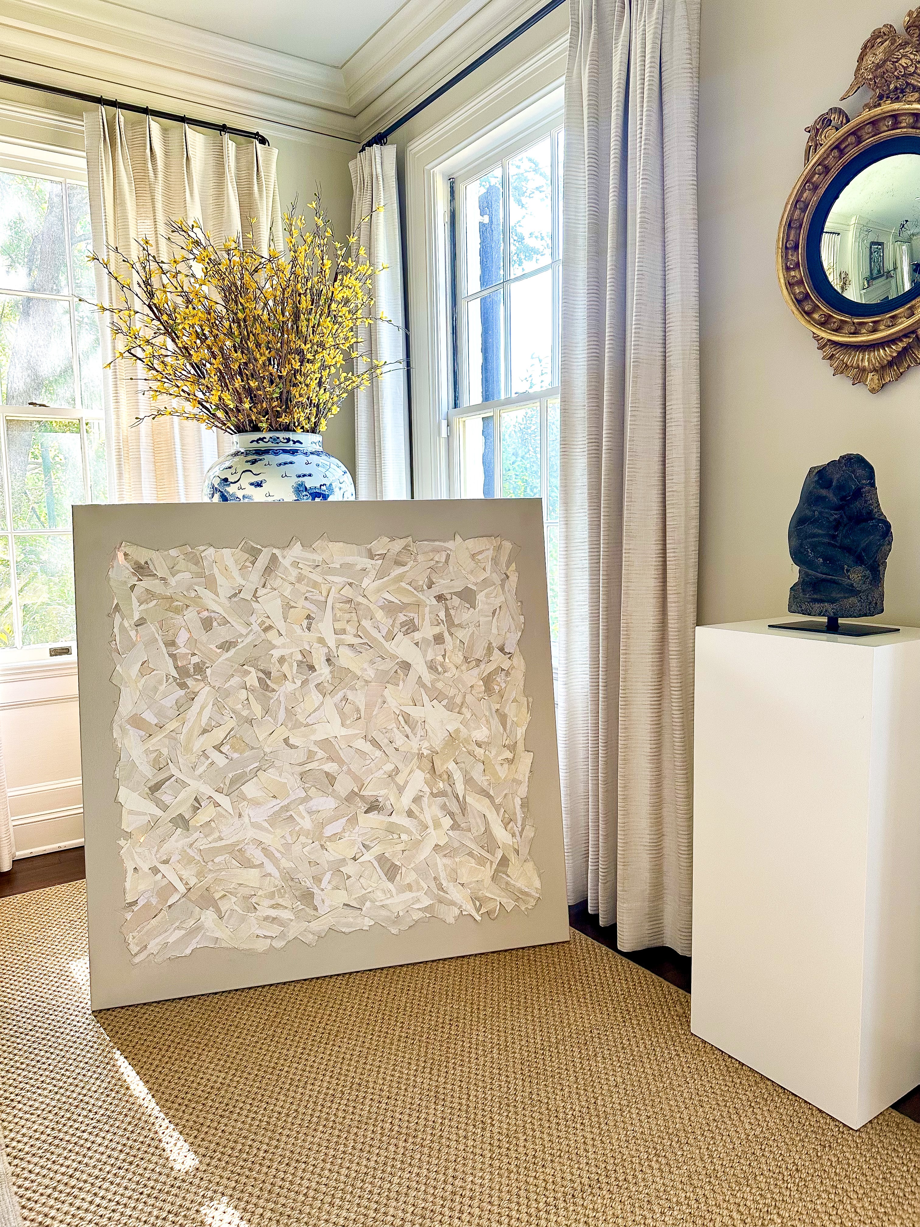 48x48 original painting. Mixed media collage on canvas. This piece has hundreds of torn and cut shreds of paper on top of it. From watercolor paper to handmade paper to other materials, this layered collage makes an impact based on its layers alone. The background color is a light taupe. Unframed. A white, gold or silver float frame is available for an additional $800. Signed by artist on the back of painting.