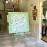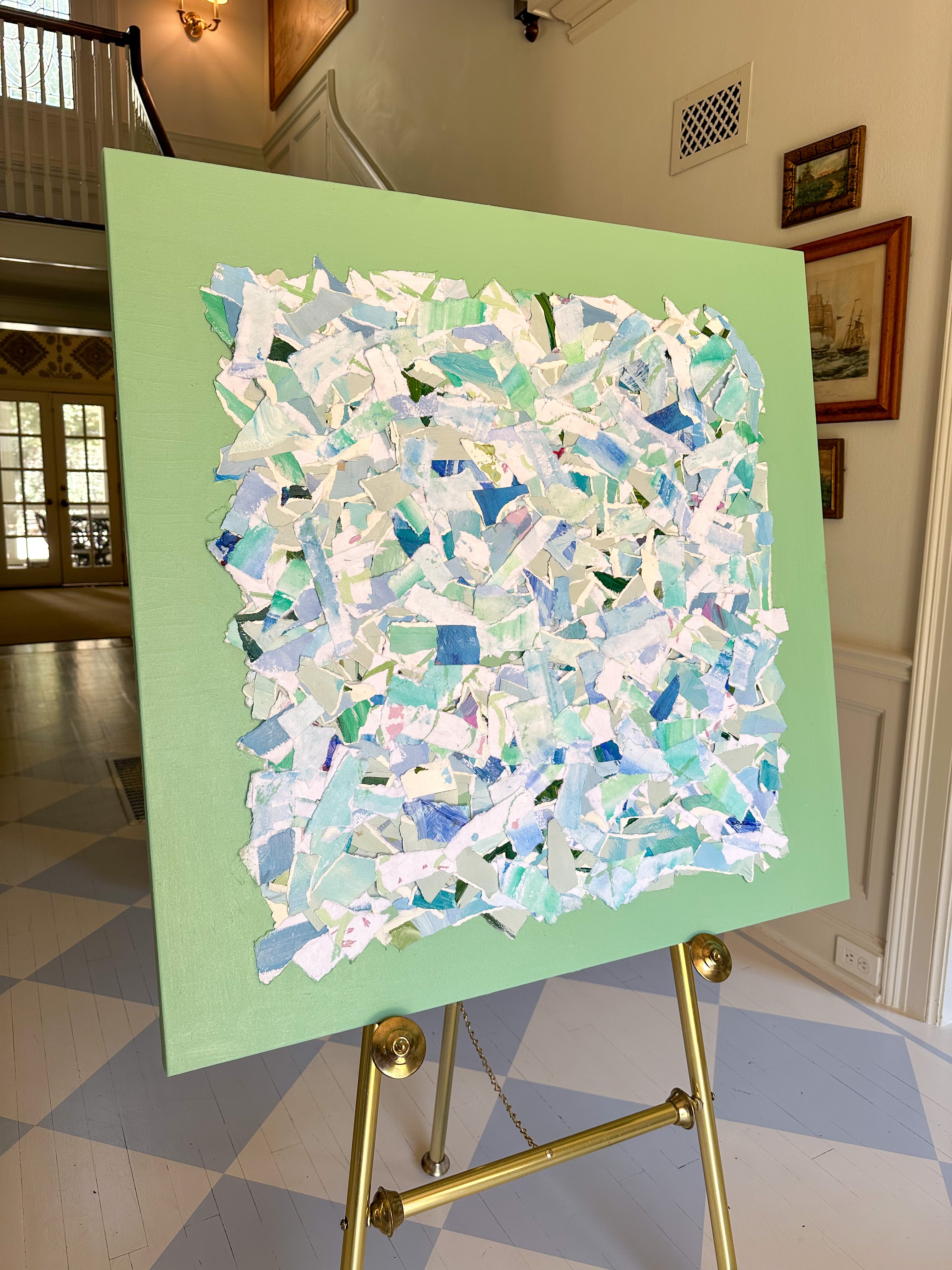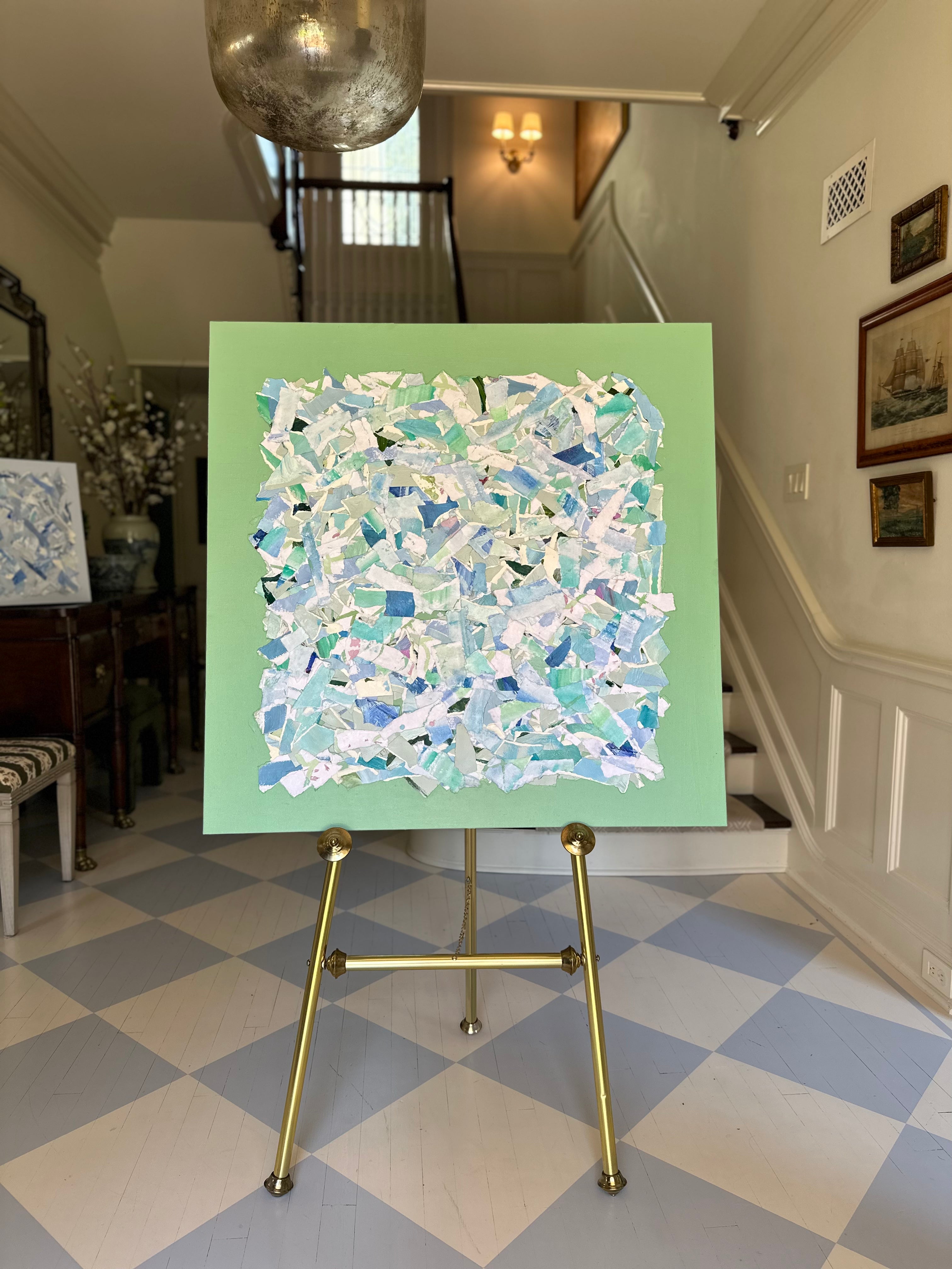 36x36 original painting. Mixed media collage on canvas. Can be hung horizontally or vertically. This piece has hundreds of torn and cut shreds of paper on top of it. From watercolor paper to handmade paper to other materials, this layered collage makes an impact based on its layers alone. The background color is a jade green. Unframed. A white, gold or silver float frame is available for an additional $500. Signed by artist on the back of painting.