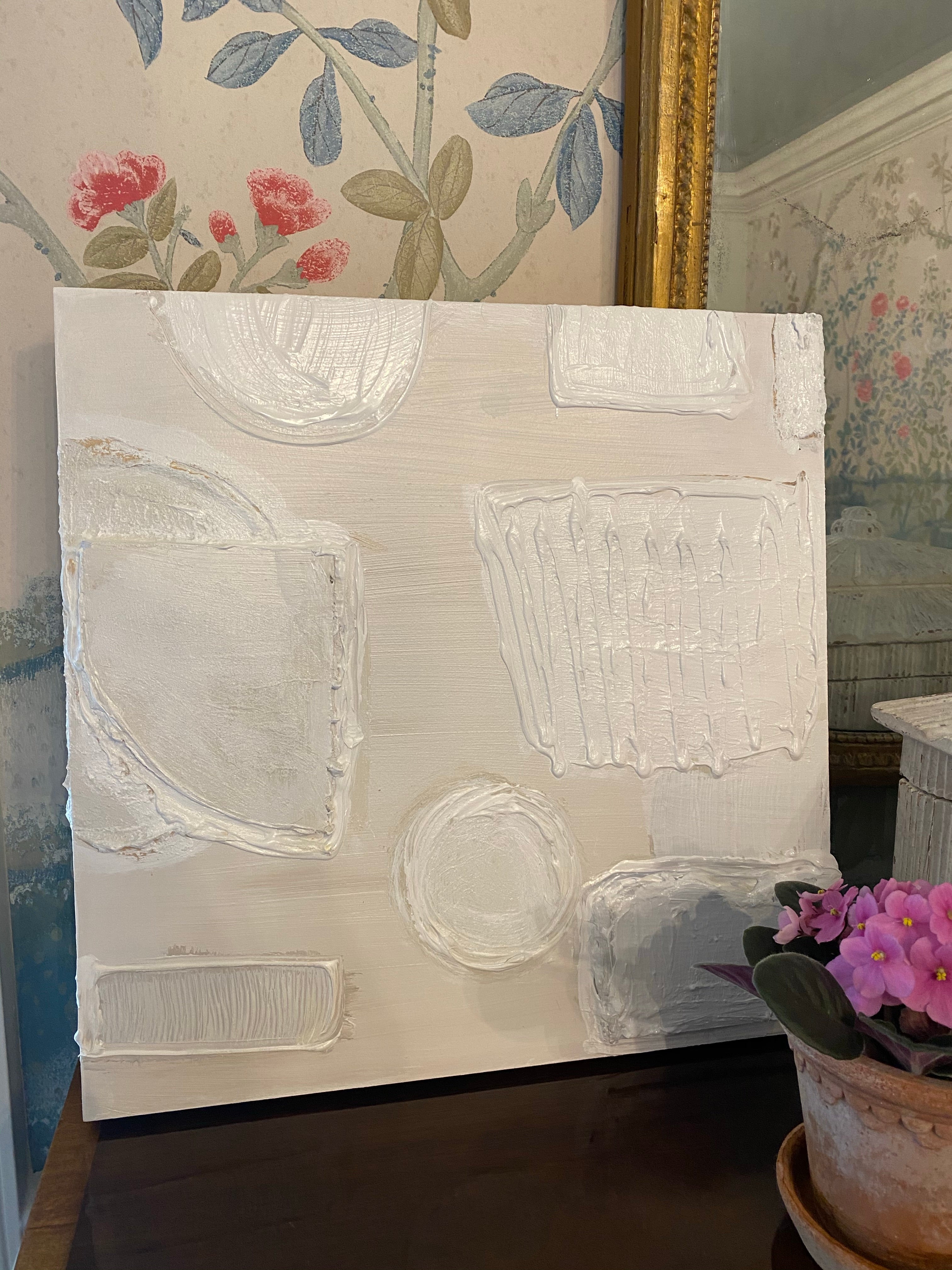 16x16 mixed media (heavily textured with 3D elements) on birch wood panel. Framing available upon request.
