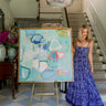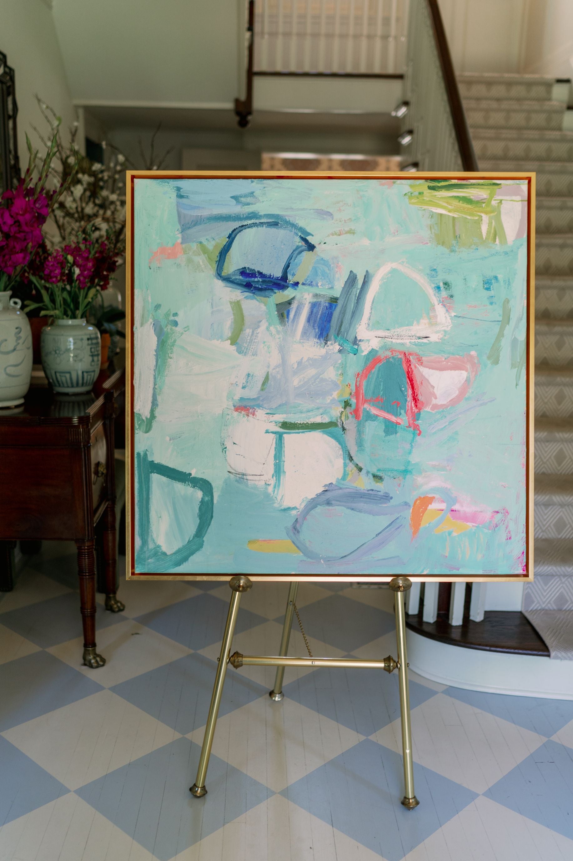 40x40 inch original painting. Mixed media on canvas. Custom framed in gold float frame. Signed by artist on the back of painting. Can be signed on the front upon request. The piece can be hung horizontally or vertically.