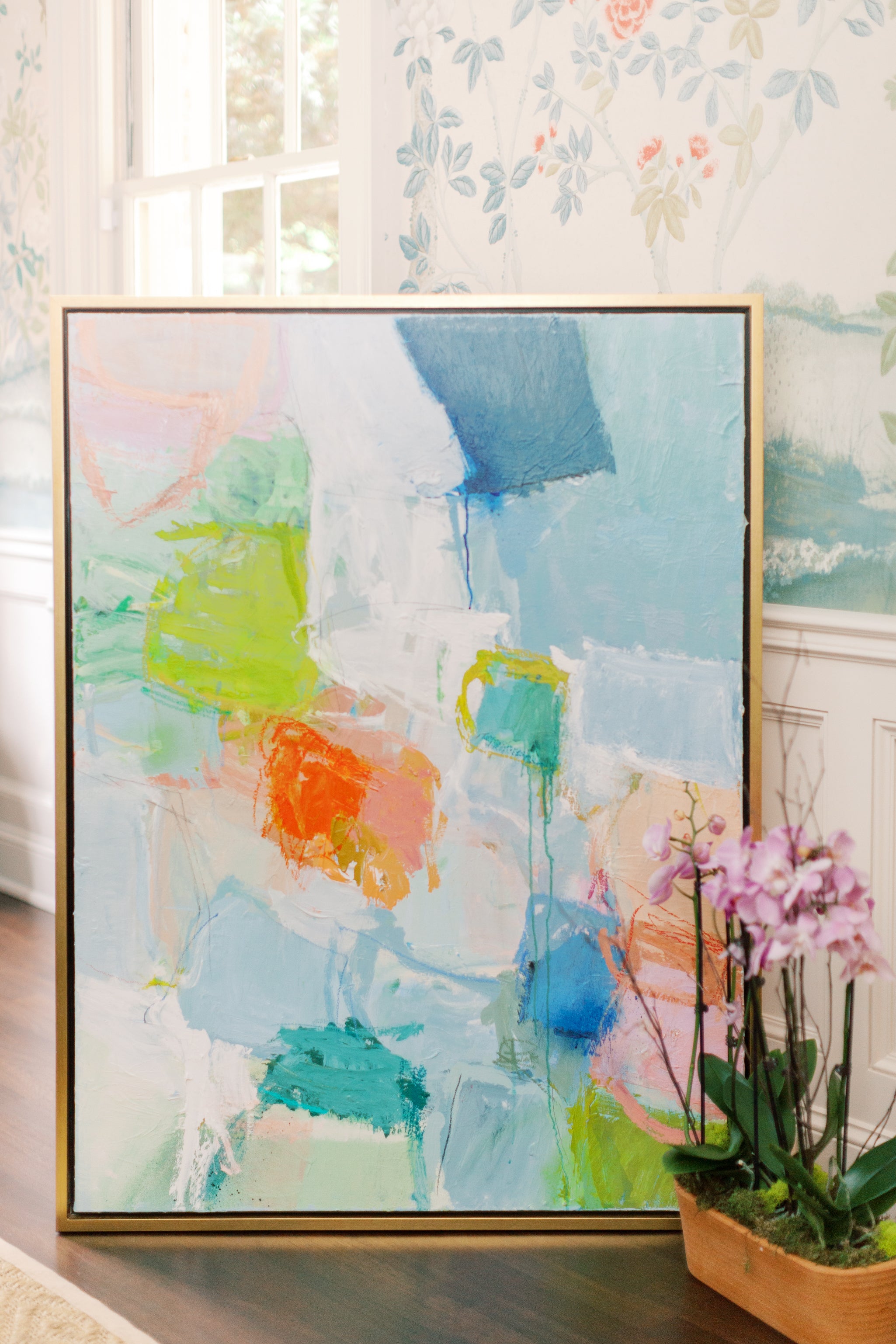 48 x 36 inches mixed media on on gallery wrapped canvas. Custom framed in gold float frame.