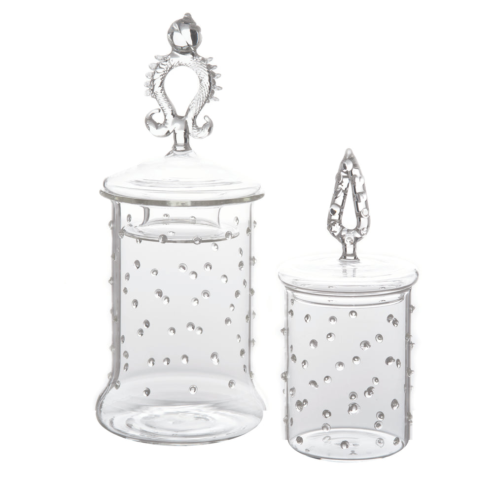 - A set of two glass apothecary jars with decorative lids, one large and one small.