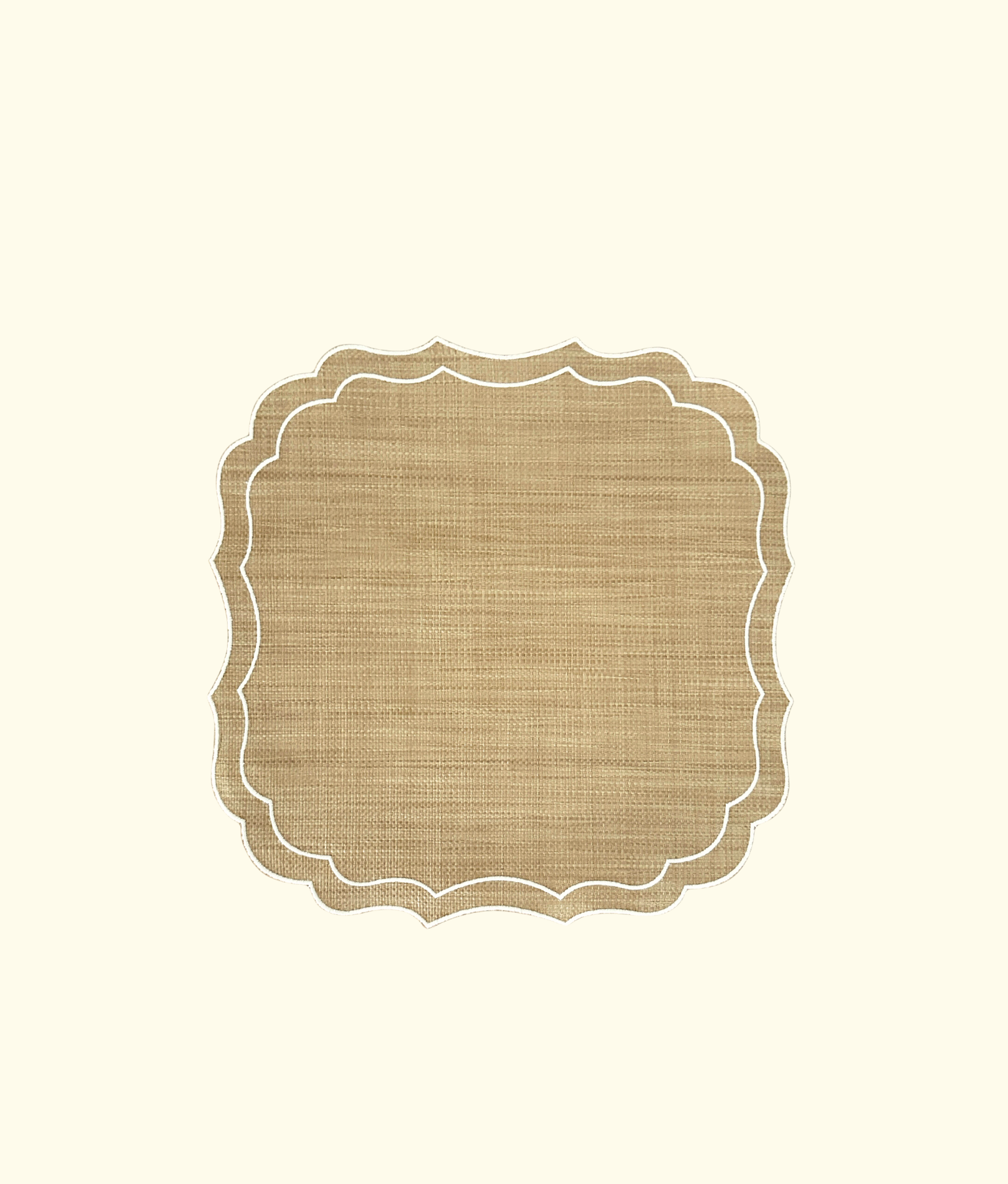 Elevate your table setting with these exquisitely designed scalloped placemats, crafted from coated raffia for both beauty and durability. Featuring double embroidery and handcrafted edges, they blend timeless craftsmanship with practical sophistication. The elegant raffia is accented with a double crimson trim border, which add a refined and sophisticated touch to any tablescape. The unique shape and striking color combination create an unexpected yet elevated charm.