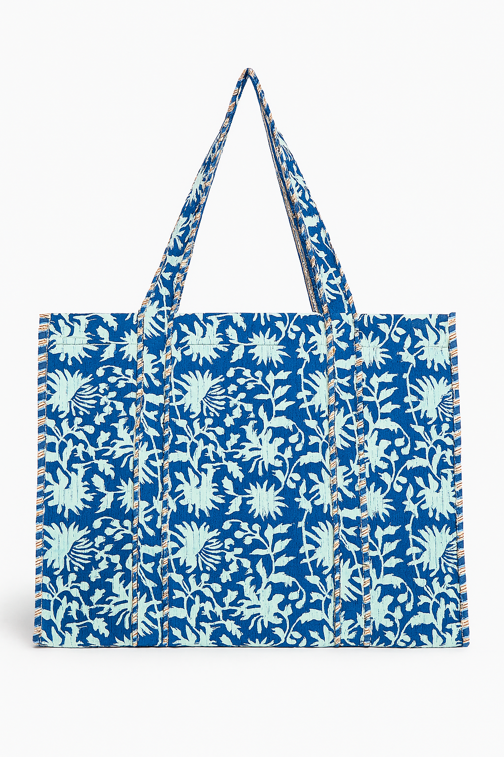 This 100% cotton canvas tote is hand block-printed and features both internal and external pockets—perfect for everyday use or a weekend getaway.