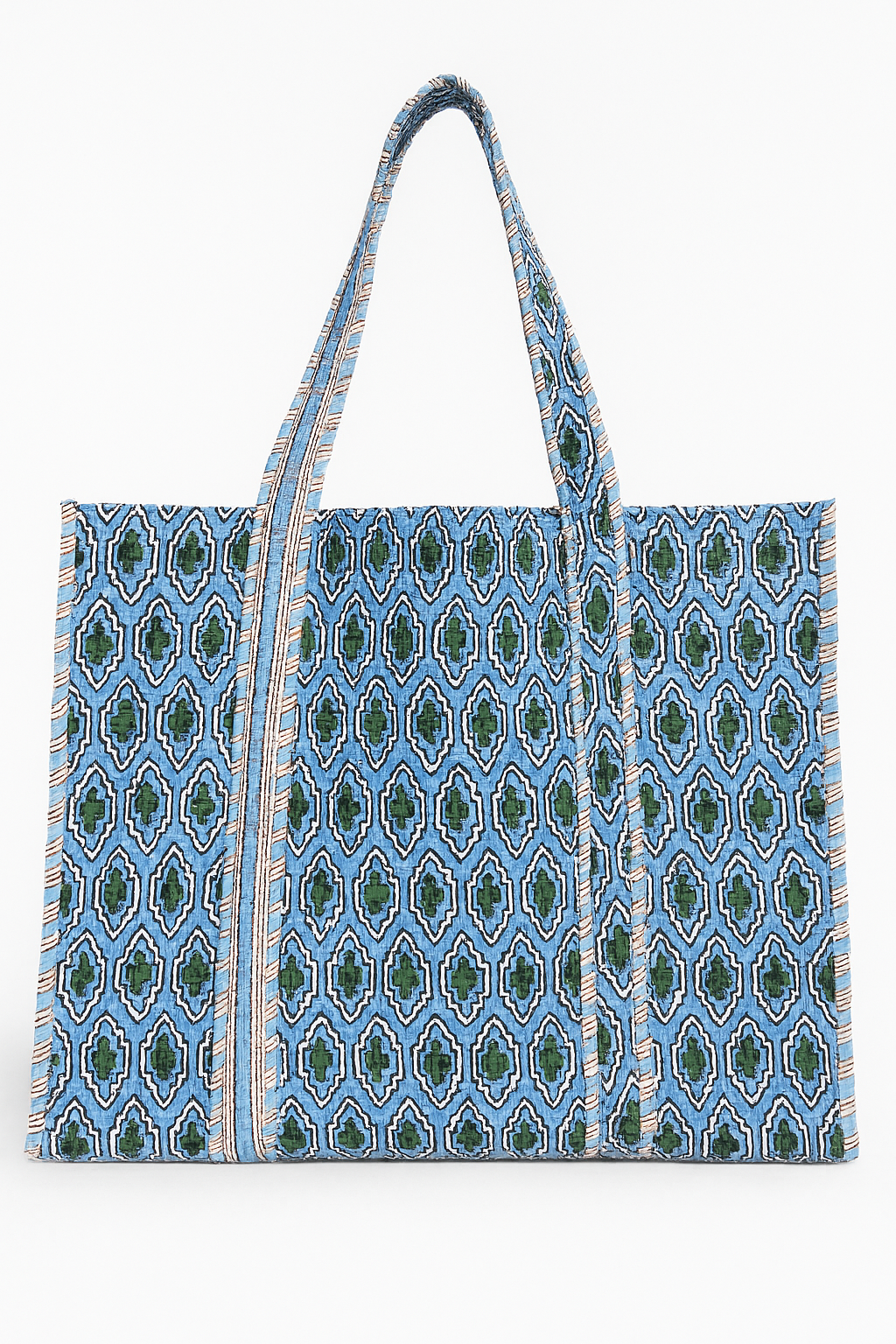 This 100% quilted cotton tote is hand block-printed and features internal pockets—perfect for everyday use or a weekend getaway.