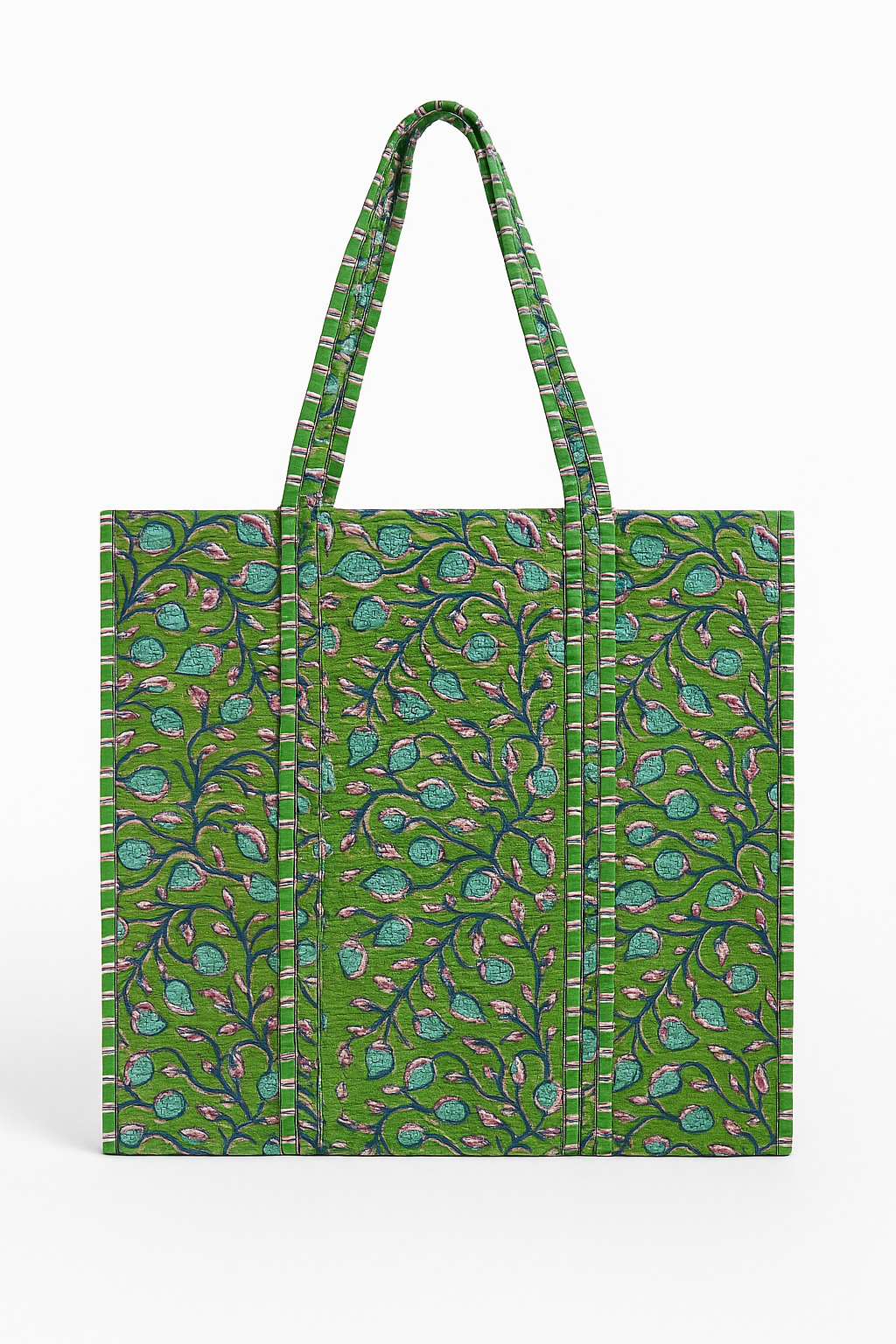 This 100% cotton canvas tote is hand block-printed and features both internal and external pockets—perfect for everyday use or a weekend getaway.